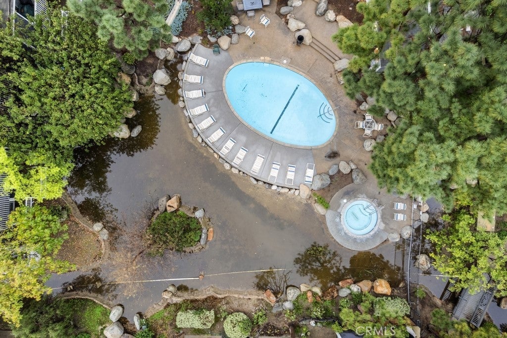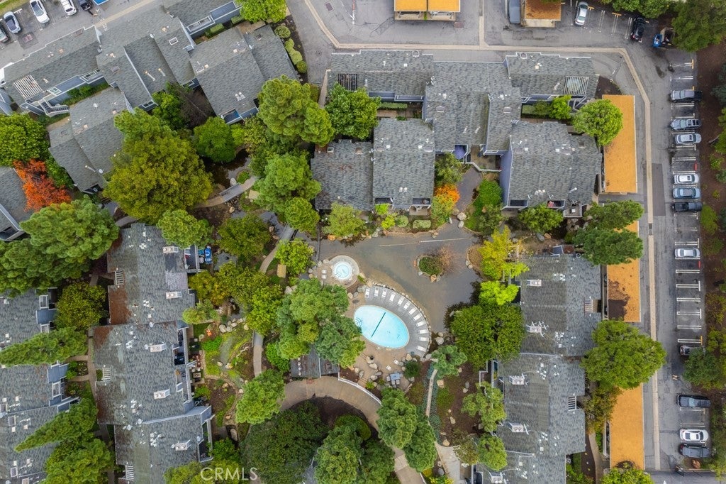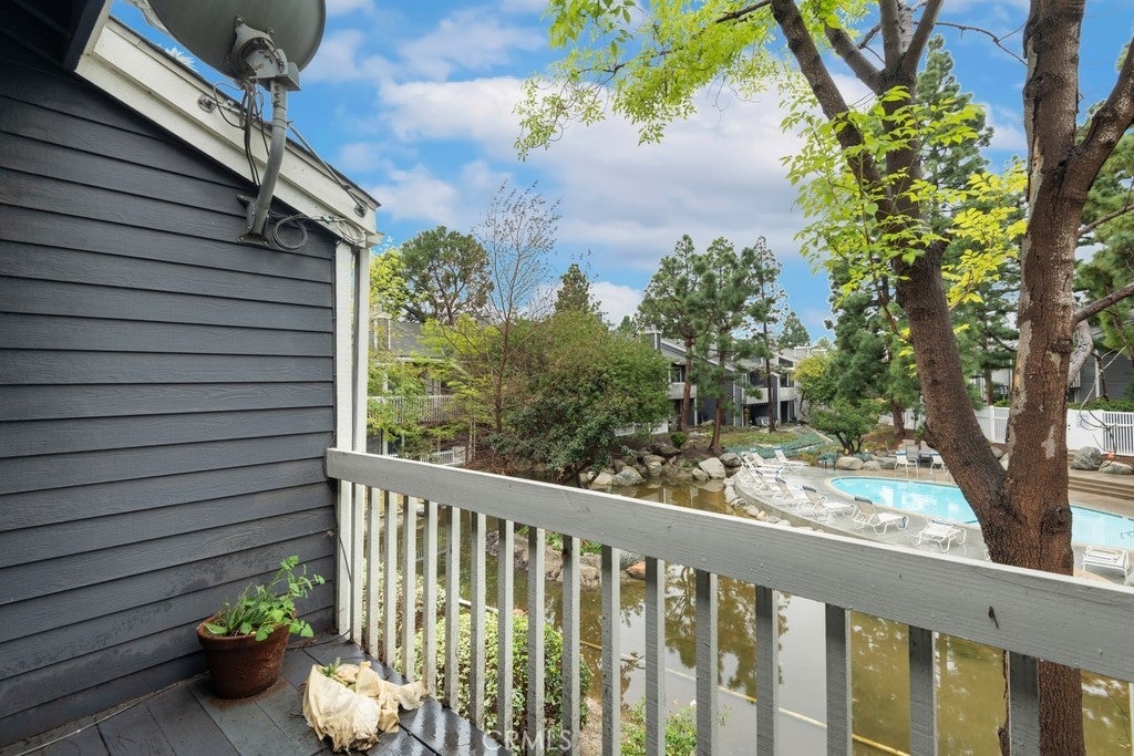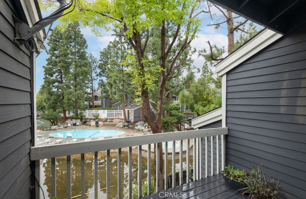 Welcome to this charming Pine Creek Community condo! This inviting home features two spacious bedrooms with vaulted ceilings, including a primary bedroom with two closets and access to a private balcony overlooking the serene creek and pool. The open living and dining areas flow seamlessly to a patio with a barbecue, perfect for relaxing or entertaining. The enclosed patio also includes a convenient laundry area. Recent updates add both style and functionality: all-new powder room (paint, floors, toilet, vanity, light, and fixtures), fresh paint throughout, new kitchen floors, new microwave, remote-controlled living room blinds, new window treatments, new patio light fixtures, new ceiling fan in the primary bedroom, and a new doorbell. Enjoy central A/C and two assigned parking spaces (#360 open, #379 carport) just steps from the unit. Includes microwave, stove, dishwasher, washer, and dryer. A perfect blend of comfort, convenience, and community living!
