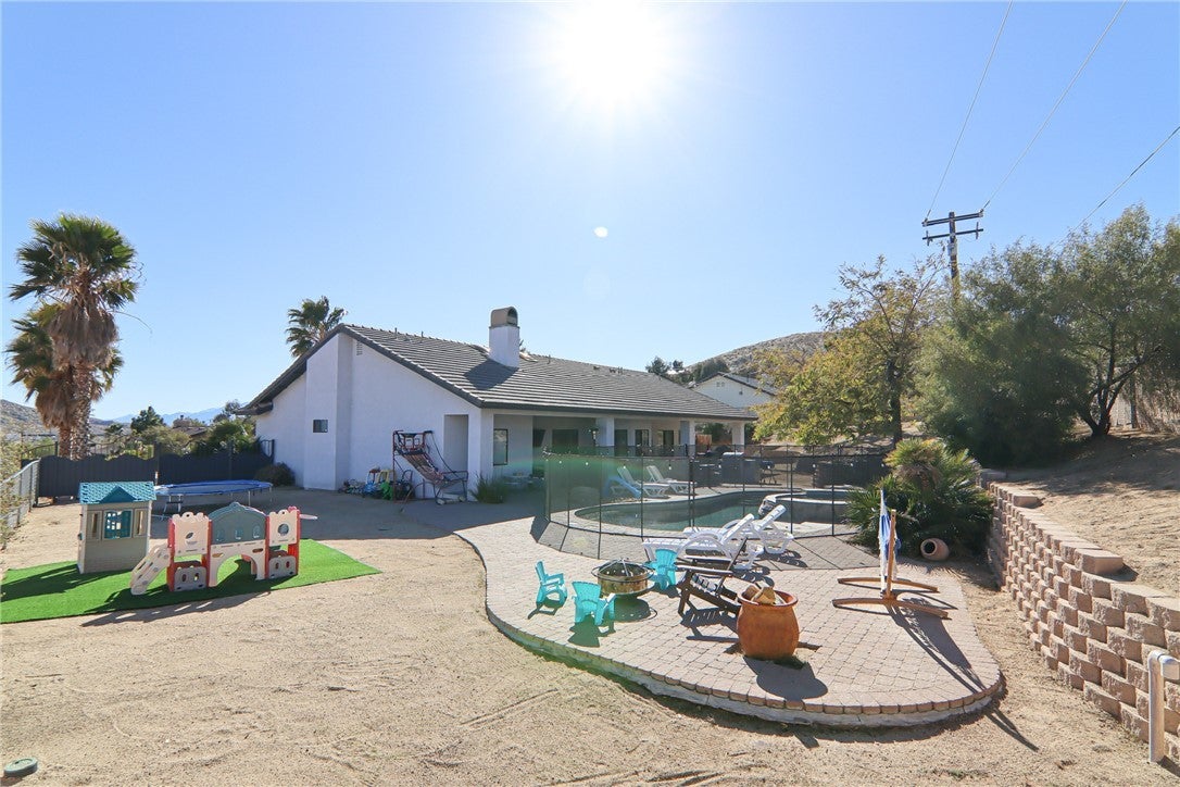 Stunning Hilltop 4-Bedroom Home with Pool, Spa, and Breathtaking Views! Welcome to this beautifully updated 4-bedroom, 2-bathroom home spanning 2,073 sq. ft., designed for both comfort and entertainment. Nestled in Country Club Estates, one of the premier communities in Yucca Valley, on a spacious hilltop lot with starry night and mountain views, this home offers an inviting open-concept layout, high ceilings, and an abundance of natural light from living room skylights. The master suite is a true retreat, featuring vaulted ceilings, an office nook, large walk-in closet, and private sliding door access to the backyard. The spa-inspired master bath boasts dual sinks and a true vanity, LED track lighting, upgraded modern fixtures, a large whirlpool tub, and a custom, open shower with three shower heads for a truly luxurious experience. The updated laundry room has fresh paint and wallpaper, a new accent wall with W/D hookups leads to the spacious 3-car garage. Overhead storage rails and large cabinets throughout have been installed for an abundance of storage space. The chef’s kitchen has been enhanced with a beautiful, deep, brushed gold prep sink and gooseneck faucet, complete with cutting board, drying rack, and prep station. Granite countertops, stainless appliances, and charcoal cabinets complete the look, and the floor is traditional ceramic tile. Step outside into a private entertainer’s dream backyard, complete with a gated pool and spa controlled via a Pentair smart system, a built-in BBQ with a picnic table, patio furniture, and a TV mount that supports TVs up to 70". A second patio space by the master suite features another BBQ and dining area, and a relaxing day bed. There are three additional bedrooms opposite the master suite, all spacious with vinyl flooring, large windows, and an abundance of natural light. Additionally, the property is outfitted with an Enphase solar system to keep electric bills in just single or double digits throughout the year. The guest bathroom has also been upgraded with fresh paint, all modern fixtures, and a custom shower installation. This home in a prime location at the peak of Yucca Valley offers privacy, scenic views, and extreme convenience for those who like to hit the road quickly to explore Palm Springs or LA. Don't miss the opportunity to make it yours—schedule a showing today!