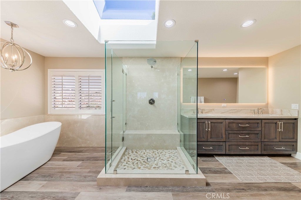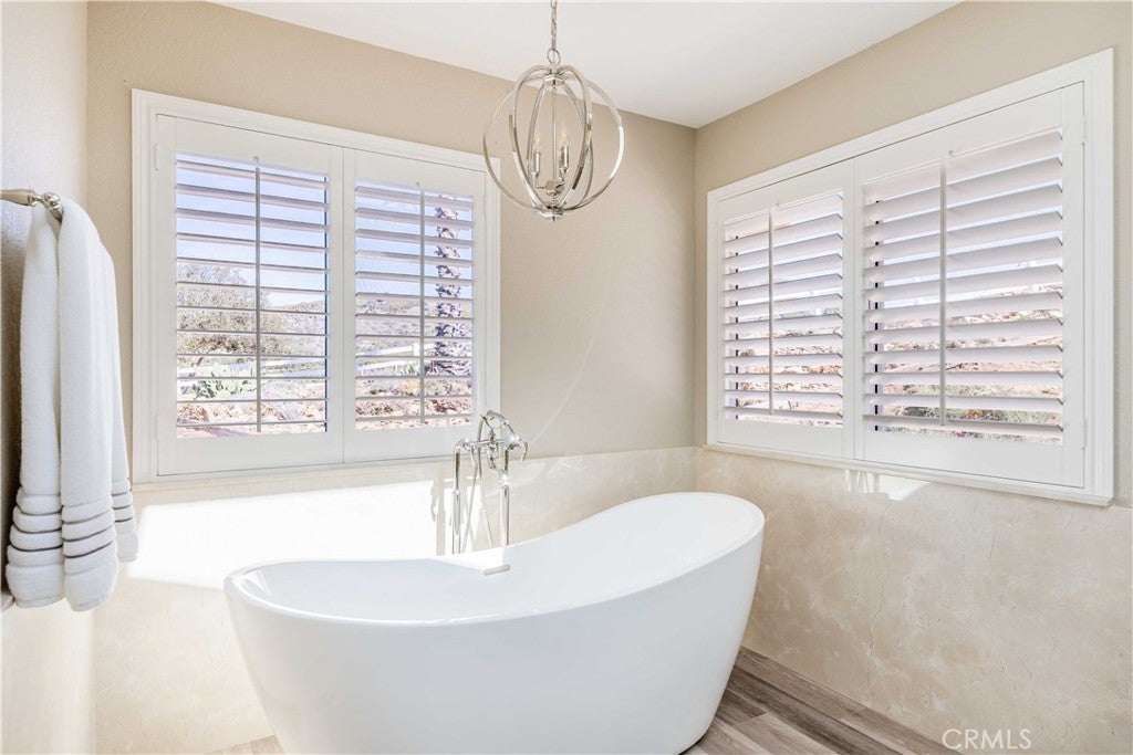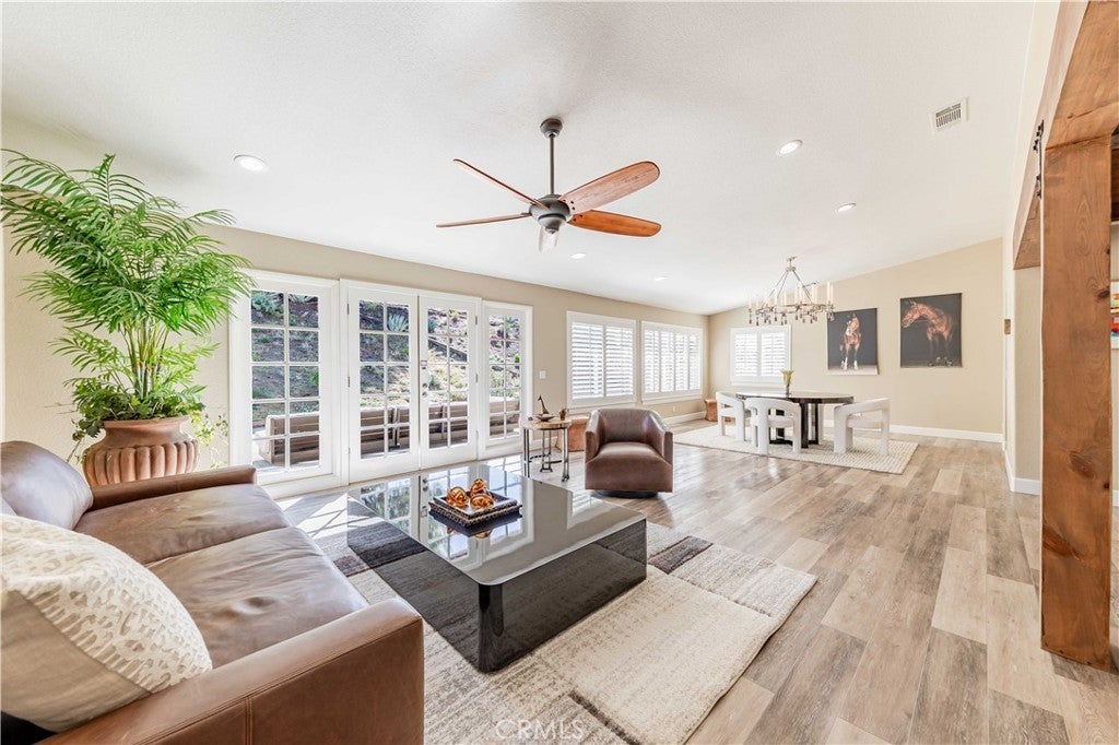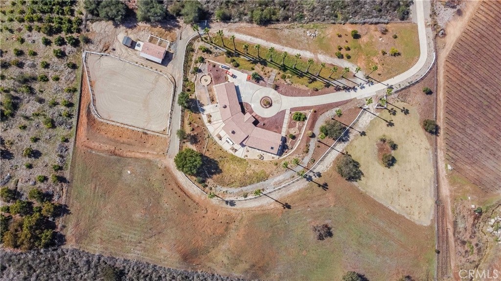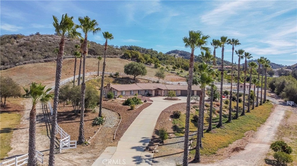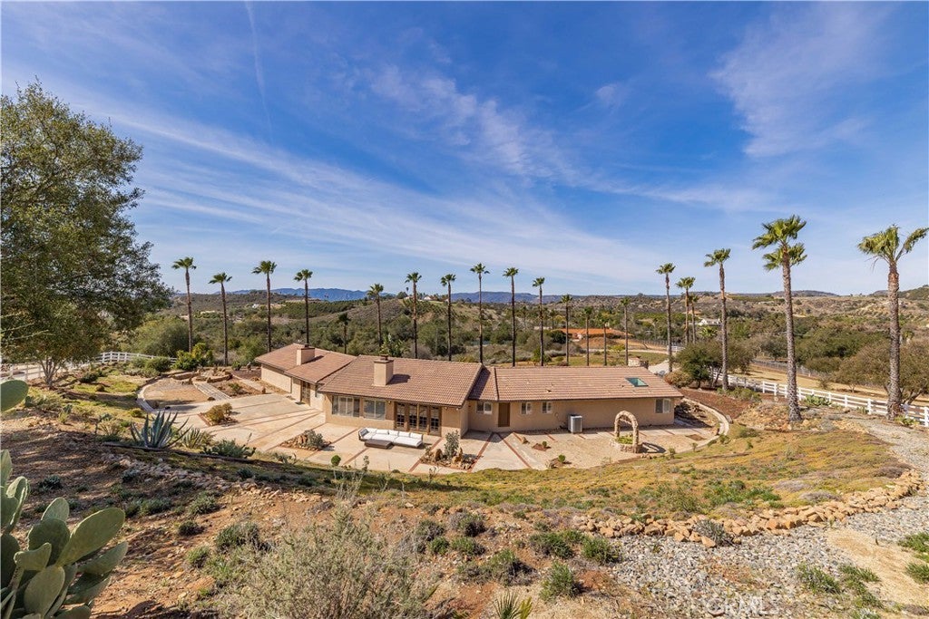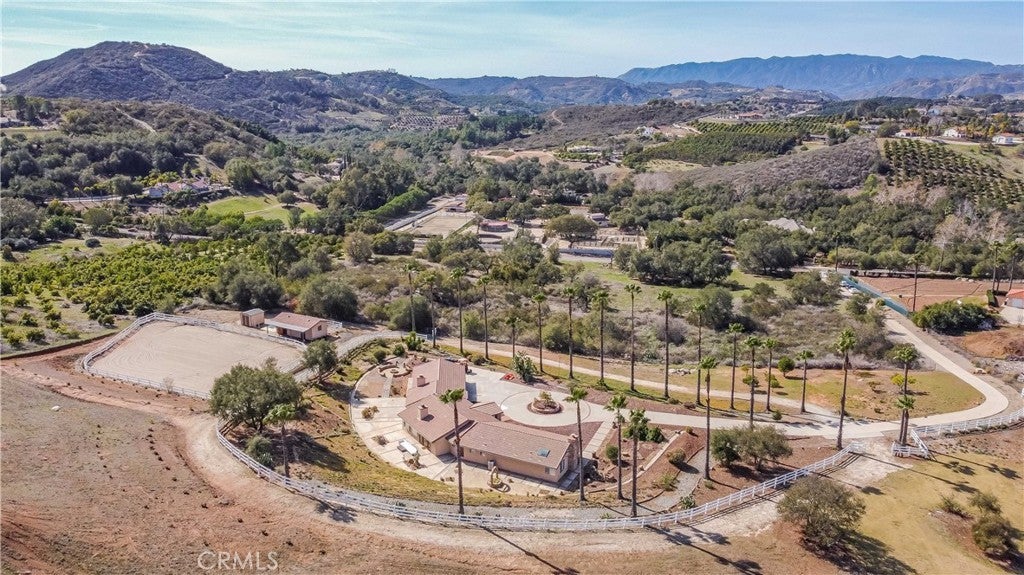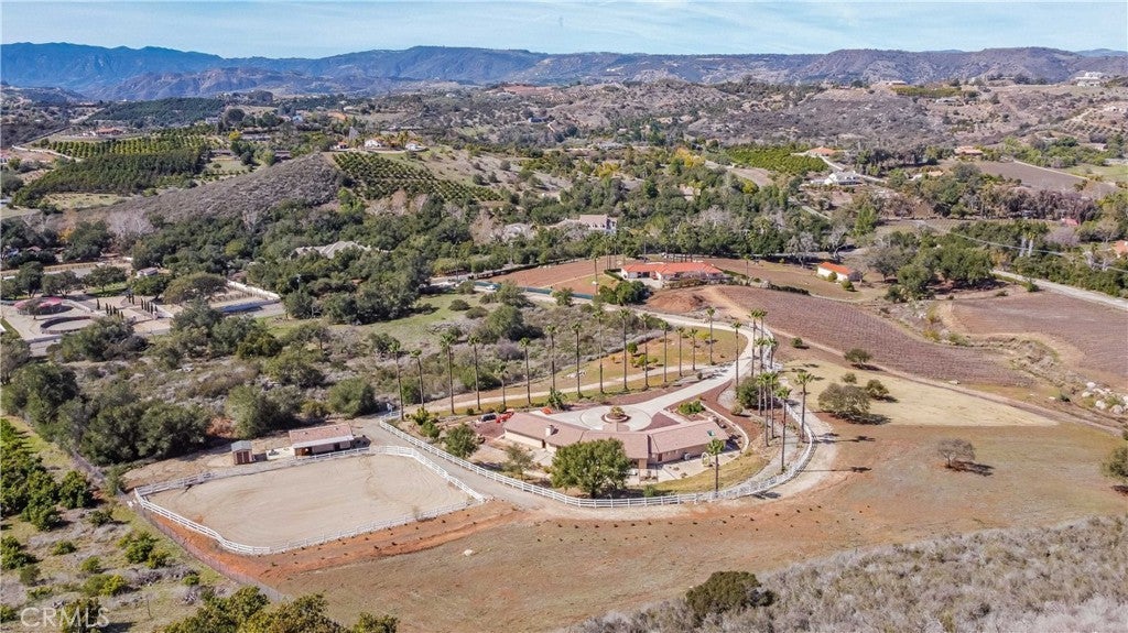 A private sanctuary nestled in the coveted DeLuz community, this breathtaking estate redefines country luxury with panoramic views, modern elegance, and unmatched tranquility. As you drive up the long, gated entrance, surrounded by lush greenery and fragrant citrus trees, a sense of serenity immediately sets in. The circular driveway welcomes you to this beautifully remodeled, single-story home, offering 3,000 square feet of thoughtfully designed living space. Step inside through the striking custom pivot Ogden door into a grand entryway featuring soaring arched wood ceilings, exquisite craftsmanship, and seamless indoor-outdoor living. At the heart of the home is an entertainer’s dream—a chef’s kitchen designed for culinary excellence, boasting dual ovens, a sleek induction cooktop, and an expansive marble island. Complementing this luxurious space, all cabinets throughout the home are custom-built, while every kitchen and bathroom counter and shower is adorned with elegant marble. The open living room, anchored by a cozy fireplace, exudes warmth and sophistication, while multiple French doors lead to patios, perfect for dining al fresco and soaking in the endless vistas. The primary suite is a retreat of its own, featuring a stone fireplace, a spa-inspired ensuite with a soaking tub, a walk-in shower, a private toilet room, dual vanities, and a spacious custom walk-in closet. Every detail has been meticulously curated, from the tall baseboards to the elegant luxury vinyl plank flooring and designer finishes. Generously sized guest bedrooms provide comfort and style, each offering picturesque views, plush carpeting, and ample privacy. A hallway lined with custom cabinetry offers abundant storage, while the oversized laundry room comes fully equipped. Outside, nature and luxury intertwine seamlessly. Gather around the fire pit on cool evenings or explore the property’s flourishing avocado, citrus, and pomegranate trees. Equestrian enthusiasts will appreciate the well-maintained stables with foam flooring, an outdoor supply room, and direct backyard access. An arena provides space for riding and training, while the surrounding landscape offers a perfect blend of natural beauty and functionality. An abundance of parking ensures effortless hosting for grand events. Located just minutes from Old Town Temecula, world-class wineries, and major freeways, this estate presents a rare opportunity to own a slice of paradise-where modern comfort meets timeless beauty.
