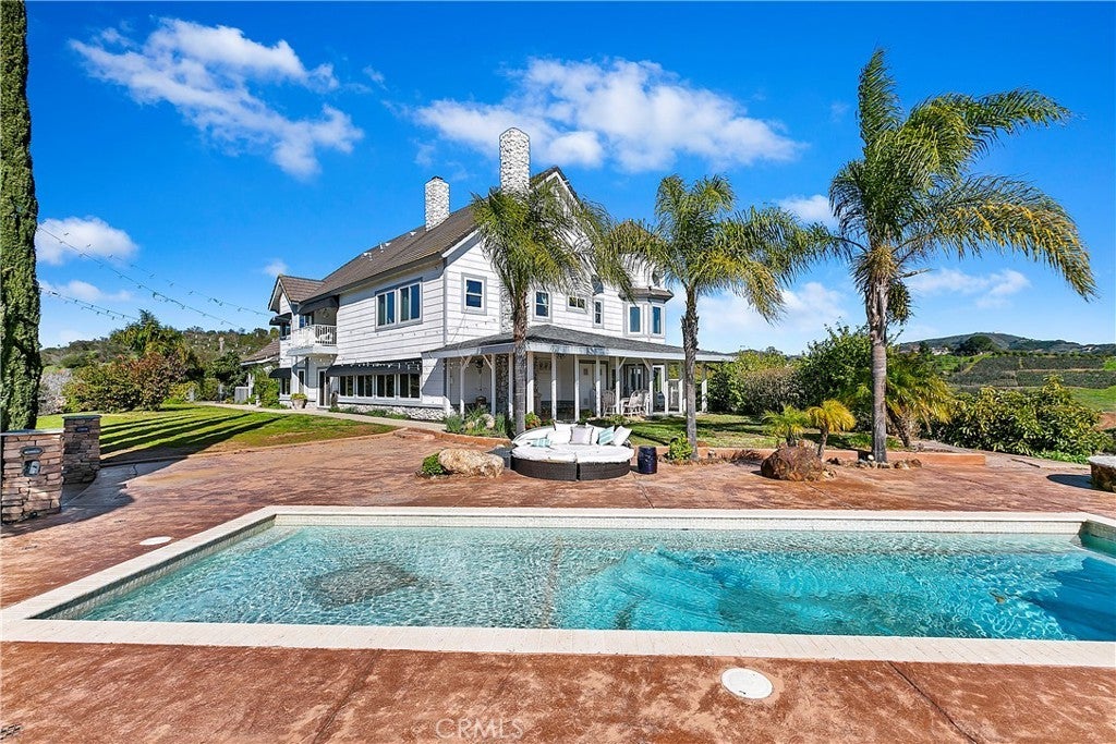 Luxury at its finest with this stunning De Luz Estate pool home. This gorgeous property also includes a 1200+ Sq. Ft. guest house with 2 bedrooms 2 bathrooms and a 2 car garage and pool of it own, all just minutes from Old Town Temecula, schools, shopping, dinning, freeway and entertainment. You will be in awe at the spectacular 360 degree views from every room throughout this stunning 4,861 sq. ft. estate home, positioned on a over 5+ acres of impressive land. As you drive up the private driveway, enjoying the breathtaking views, you'll come upon an orchard that consists of mango and grapefruit trees, you'll then pass by a lovely guest home, excellent potential rental opportunity or for guests, friends or family to live in. When entering the main home through the double front doors, you'll immediately appreciate it's grand scale, with the beautiful scrolling iron banister, coffered ceilings, exquisite woodwork, hardwood flooring, and open floor plan with every bedroom consisting of their own bathrooms. Enjoy a cozy evening by the fire, reading a book, or chatting with friends in the lounge/den with beautifully crafted full wall, wood, built-in wine racks and cabinets, granite counters, and wainscot throughout. This room is a must see! Looking to entertain, then you'll enjoy the huge family room, formal dining room and beautiful kitchen with eating area with never ending views. Need room for guests, no problem, down the hallway you'll find a bedroom with walk-in closet and a full bathroom. There is also a separate powder room conveniently located off of the family room and a gigantic laundry room with plenty of storage. Upstairs you will be stunned by the craftsmanship. The primary bedroom has its own retreat for reading or tv time and the master bedroom has a private 3 sided fireplace. Enjoy a spa day in the master bathroom with jetted tub facing overlooking the picturesque and never-ending views. There are 2 more bedrooms upstairs with stunning full bathrooms and cathedral ceilings, separate bonus area with balcony, and another bonus room with built-in desks and storage for playroom, home office or a plethora of other uses. The backyard of this stunner consists of a pool and spa, BBQ and firepit. Sit by the fire and enjoy the stars with your unobstructed view. Looking to have some animals, there is plenty of room for barn, gardens, vines, pickleball court, or whatever you heart desires.