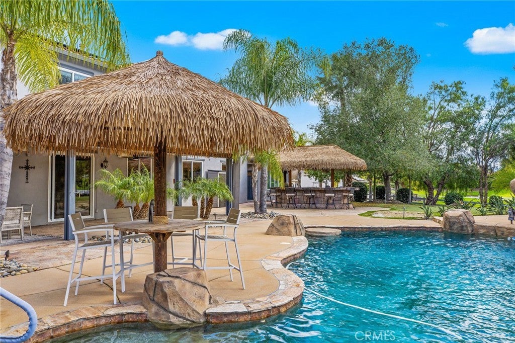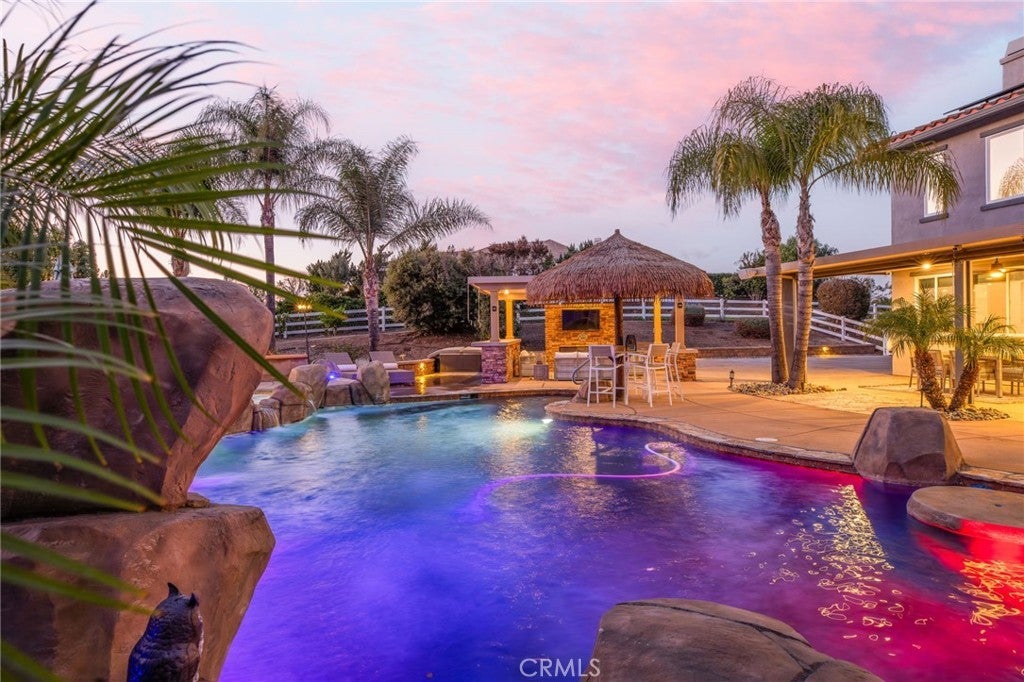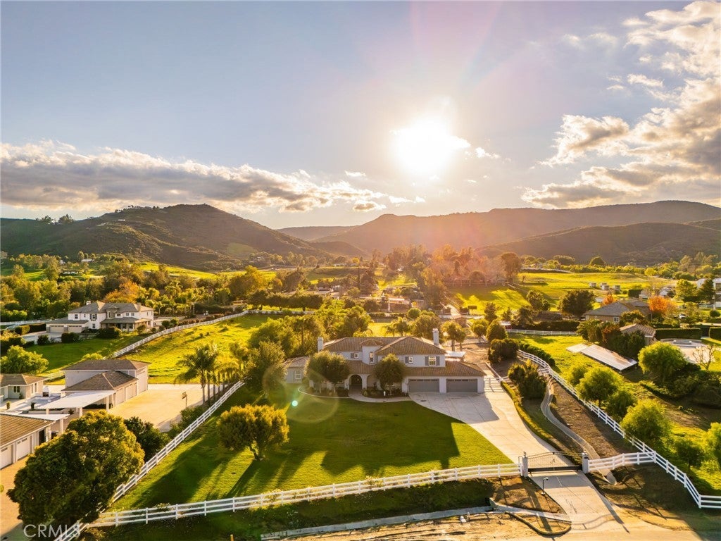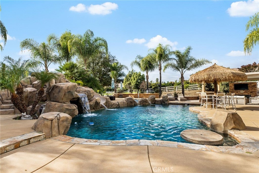 Located behind the gates of the prestigious Wynfield Estates, this exceptional residence offers a rare blend of refined luxury, privacy, and expansive ranch-style living. A private gated entrance, manicured landscaping, and striking curb appeal immediately reflect the pride of ownership throughout the estate. The thoughtfully designed home offers 6 bedrooms and 5.5 bathrooms, including a highly desirable downstairs junior suite and a separate downstairs ensuite with a full bathroom and built-ins, ideally suited for NextGen living with its own private entrance, along with a dedicated downstairs office. A custom double-door entry welcomes you into a light-filled, open floor plan that balances elegance with comfort. Formal living spaces include a private sitting room with a fireplace and a sophisticated dining room featuring a built-in bar and custom cabinetry, creating the perfect setting for entertaining. The expansive, fully remodeled kitchen serves as the heart of the home, offering a walk-in pantry, generous bar seating, and sweeping views from every window. The kitchen opens seamlessly to the spacious family room, highlighted by soaring ceilings and a statement fireplace. Upstairs, oversized bedrooms and well-appointed bathrooms create an ideal and functional layout. The primary suite is a true retreat, complete with its own fireplace, dual walk-in closets with custom built-ins, a luxurious soaking tub, and a separate walk-in shower. Designed for resort-style living, the outdoor spaces are truly exceptional. The flat, fully usable grounds feature a saltwater pool with spa grotto and rock slide, expansive views, an oversized built-in firepit with seating, and a pool cabana with its own fireplace. Entertaining is effortless with a full outdoor kitchen and BBQ, multiple seating areas, a custom palapa, dedicated area for family movie nights, and two custom covered patios. The property is fully gated and beautifully landscaped, complete with a putting green and additional flat land ideal for horses or the future addition of an ADU. Completing the estate is an immaculate four-car garage with epoxy floors and ample storage. Wynfield Estates is a private, gated enclave of custom homes offering equestrian zoning, 2.5-acre parcels, and a peaceful ranch-style lifestyle—just minutes from shopping, dining, and everyday conveniences.