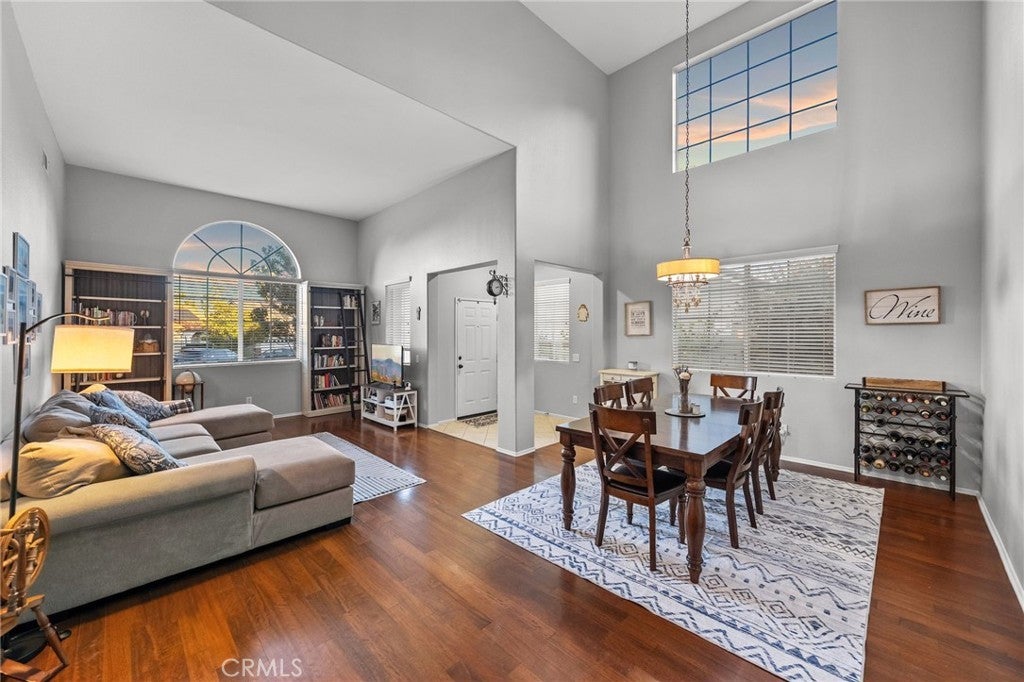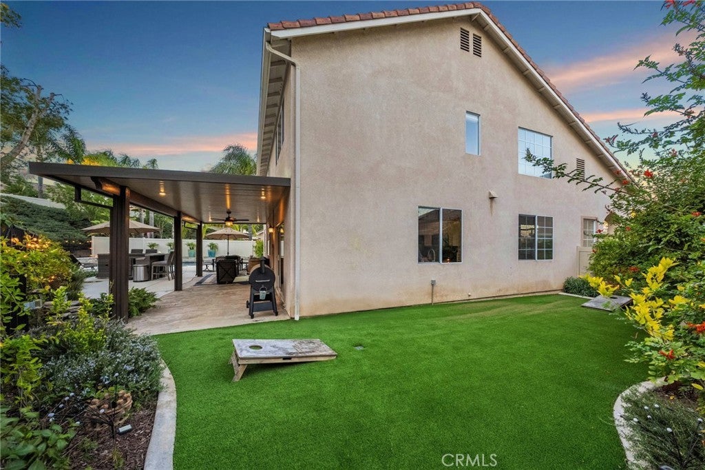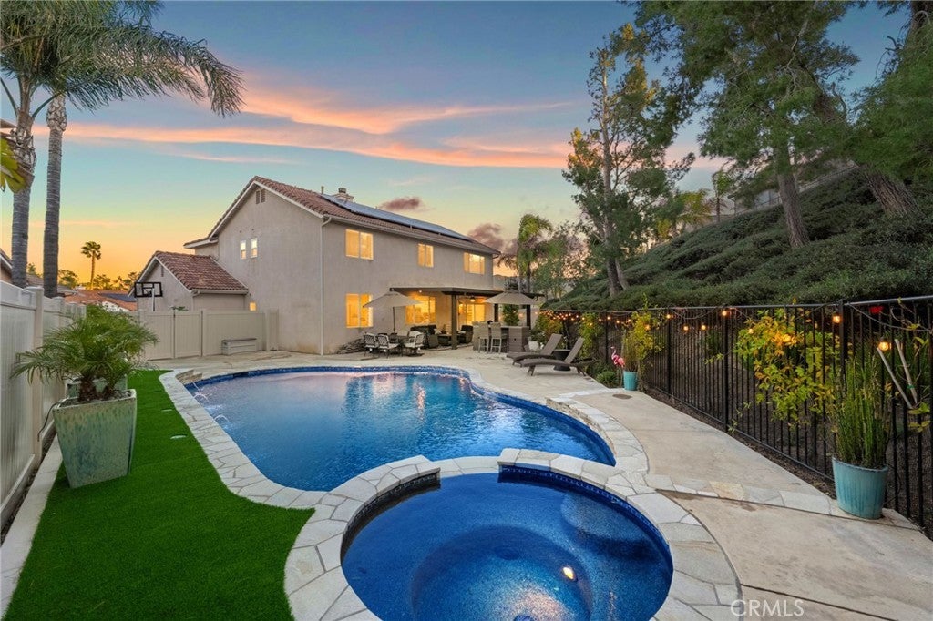 TEMECULA POOL HOME ON A CUL-DE-SAC! Set on a generous lot in the desirable Crowne Hill community, this stunning pool and spa home offers privacy with no direct rear neighbors and truly checks all the boxes. Highlights include a three-car garage, five bedrooms, solar, and access to award-winning schools. Upon entry, you’re welcomed by a bright and spacious living and dining area with soaring vaulted ceilings that extend to the second level, creating an open and airy feel. At the rear of the home, the inviting family room features a cozy fireplace and tile flooring and flows seamlessly into the beautifully designed kitchen. The kitchen boasts granite countertops, a center island with pendant lighting, white cabinetry, stainless steel appliances, a tile backsplash, and a convenient built-in desk area. There is a full bedroom and bath with shower downstairs. There is also a laundry room located on the main level. The primary suite is a relaxing retreat with vaulted ceilings, neutral tones, and an en-suite bathroom offering a walk-in closet with built-ins, dual vanities with granite counters, and a separate soaking tub and shower. Secondary bedrooms are equipped with ceiling fans for comfort and share easy access to a full bathroom with dual sinks. The backyard is truly breathtaking—an inviting, resort-style retreat designed for both relaxation and entertaining. A stunning salt water pool and spa anchor the space, complete with elegant water features. Lush, thoughtfully designed landscaping surrounds the yard, creating a serene sense of privacy and tranquility. A brand-new Alumawood patio cover adds both beauty and comfort, making this outdoor oasis the perfect place to unwind in complete peace and seclusion. Ideally located within walking distance to Crowne Hill Elementary and just minutes from Temecula Wine Country, shopping, dining, and everyday conveniences—this exceptional home is not to be missed!