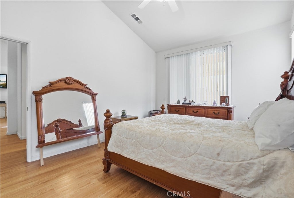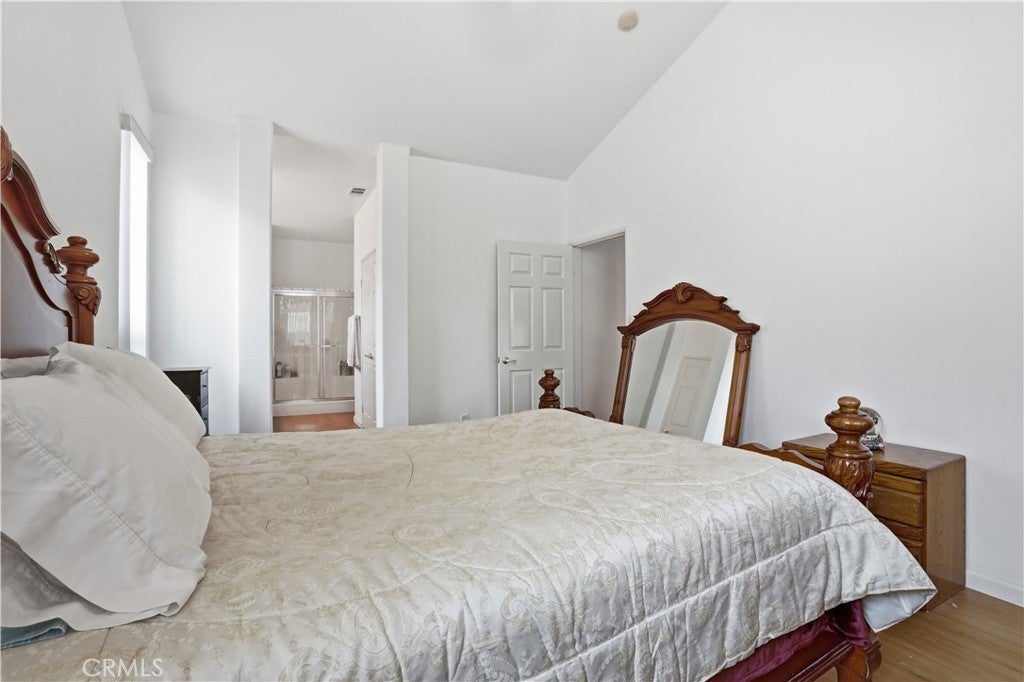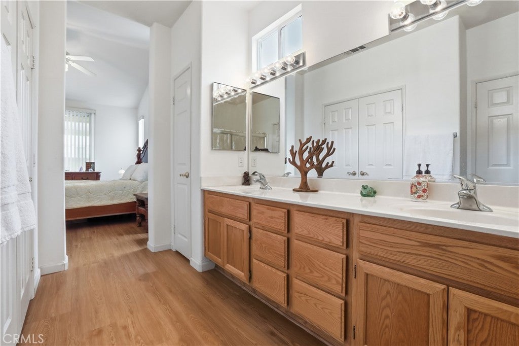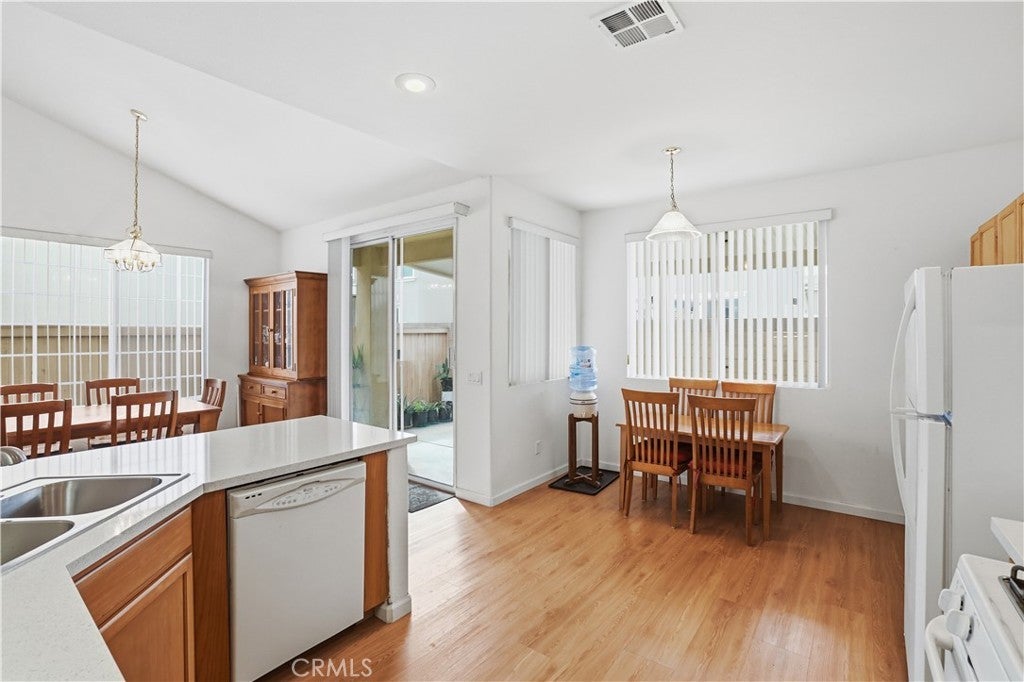 PRICE REDUCED!! Welcome to effortless living at The Estates of San Jacinto, a premier gated community for those 55 and better! This updated charming 2-bedroom, 2-bathroom home offers an exceptional chance to embrace a vibrant retirement lifestyle in this community offering the most affordable opportunity. Enter inside the home and be greeted by the vaulted ceilings, and abundant natural light, an open and airy floor plan, seamlessly connecting the living room, dining area, and kitchen creating a bright and cheerful atmosphere. Imagine enjoying meals with a view of your private backyard, enhanced by the beautiful upgraded laminated wood flooring, custom paint, gleaming white kitchen quartz countertops, breakfast bar, and dedicated dining space. The primary bedroom, a true retreat, features an en-suite bathroom and sliding glass doors leading directly to the tranquil backyard where you can relax or entertain on the covered patio, shaded by an aluminum patio cover. Privacy is paramount with the second bedroom located on the opposite side of the home, complete with full bathroom and tub/shower combo. Beyond the home's inviting interior, you'll discover a wealth of community amenities. Enjoy miles of safe walking paths, a clubhouse with a kitchen, game room, and library, and a sparkling pool, spa, and BBQ area right outside your back gate! Low taxes and HOA dues ensure worry-free living, with the association maintaining front lawns for a consistently manicured appearance. A conveniently located laundry room with easy direct access to the garage. Enjoy unparalleled convenience with shopping, movies, post office, and entertaining all just a short distance away. Schedule your showing today and discover the perfect place to call home at The Estates of San Jacinto.