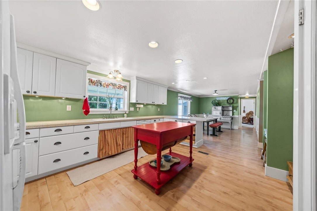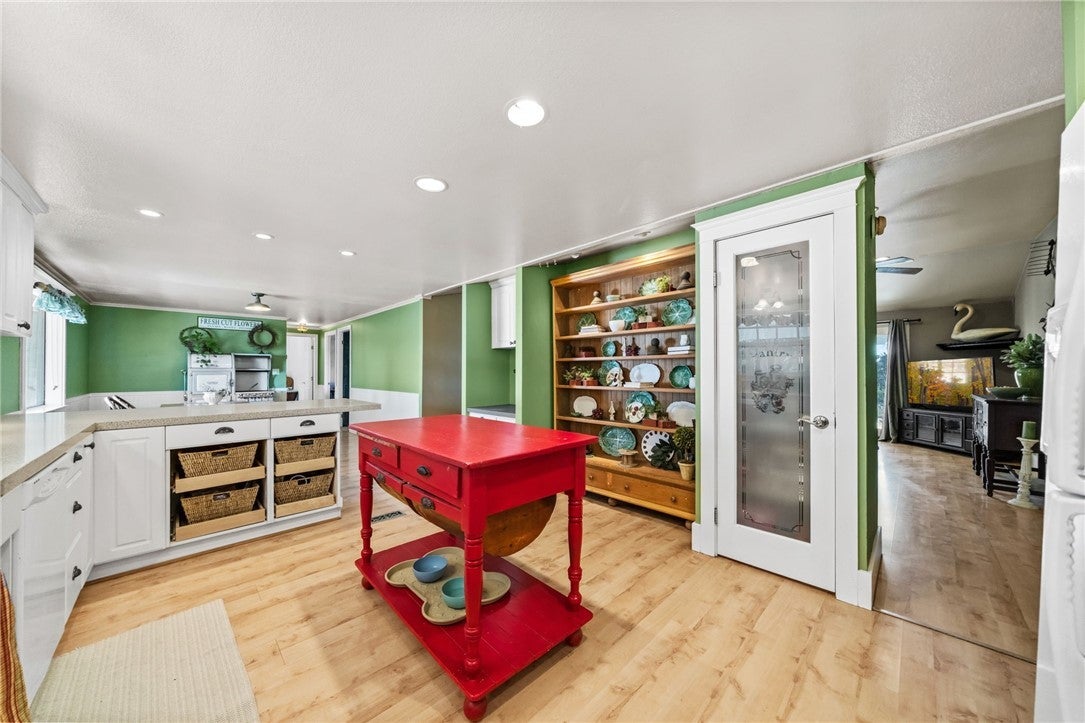 Breakfast Bar, Ceiling Fan(s), High Ceilings, Country Kitchen, Open Floorplan, Pantry, Quartz Counters, Recessed Lighting, All Bedrooms Down, Main Level Primary, Utility Room, Walk-In Closet(s)
