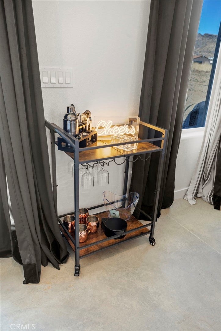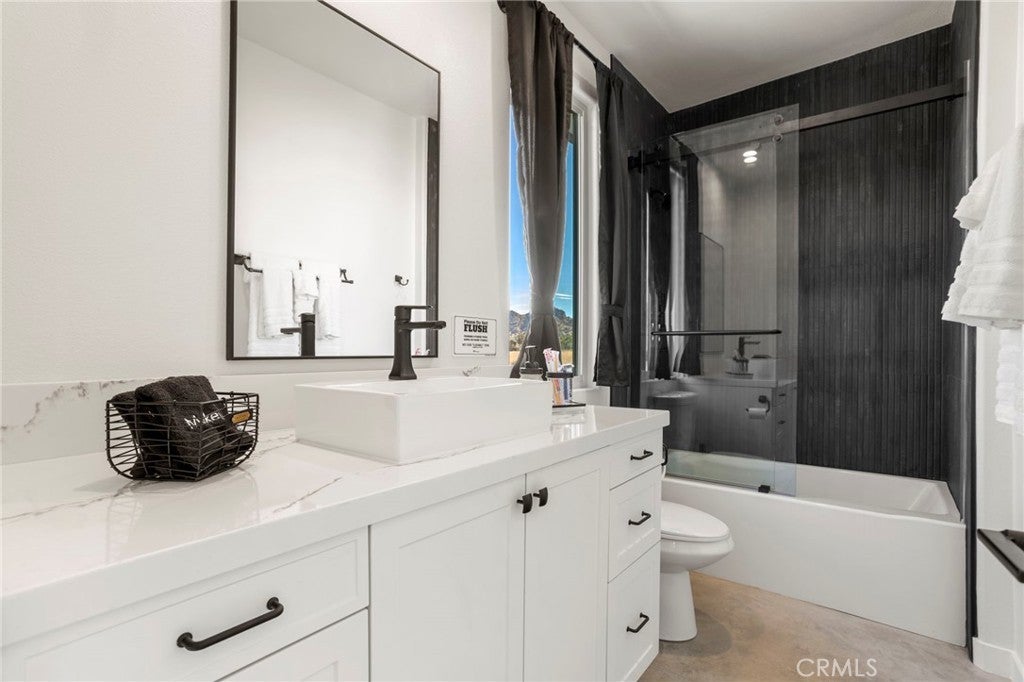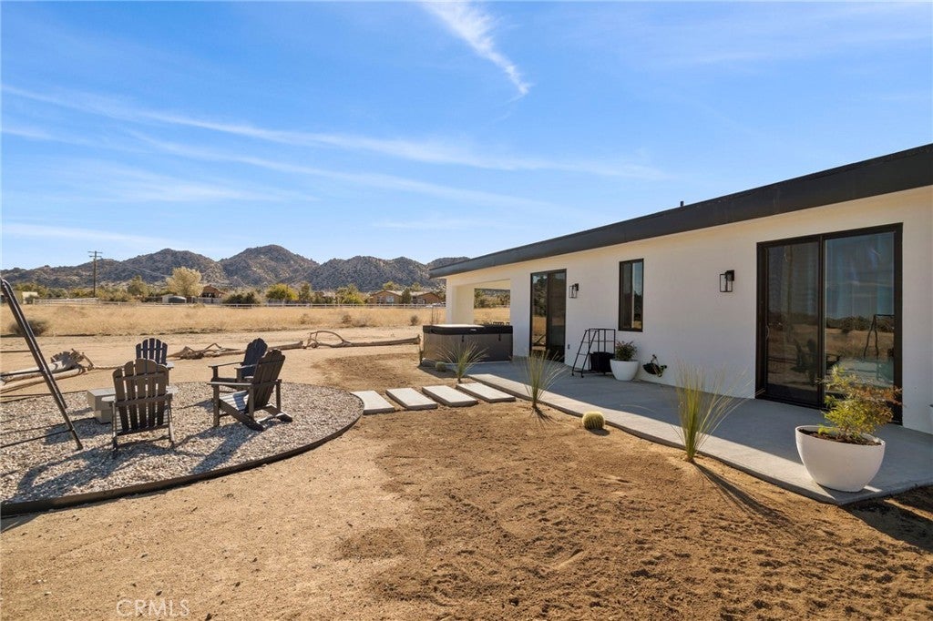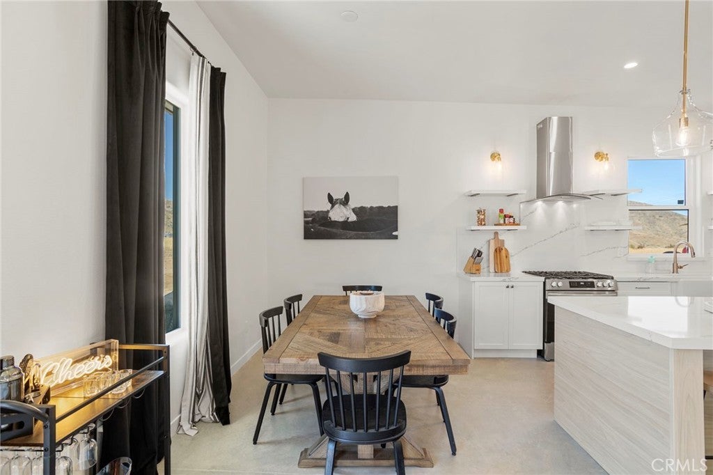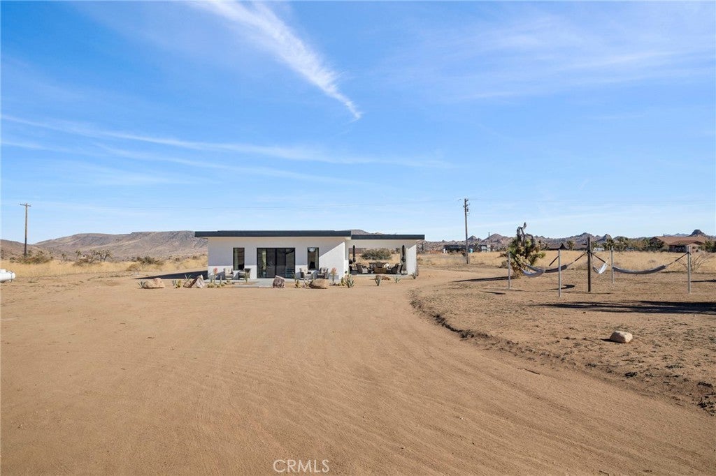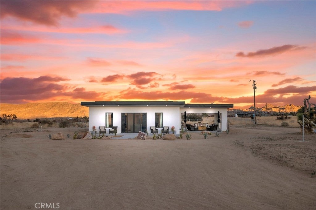 Welcome to Tom Mix Road, a striking architectural desert retreat located just a short distance from Pioneertown and its iconic dining, entertainment, and High Desert attractions. This tastefully designed property is currently used as a vacation rental and offers a unique blend of modern finishes and dramatic natural surroundings. The home features finished concrete flooring, soaring ceilings, and an expansive great room filled with natural light. The kitchen is designed for both function and style, showcasing a large center island, upgraded cabinetry, slide-in five-burner stainless steel range, dishwasher, refrigerator, farmhouse sink, and statement stainless and glass hood. The open dining area sits just off the island, creating an ideal layout for entertaining. Large sliding glass doors open to breathtaking desert landscape views, including surrounding boulder formations and distant mountain vistas toward the backside of Big Bear within the San Bernardino Mountains. Outdoor living spaces include multiple patio areas and a private rear yard with spa and hot tub, ideal for relaxing under desert night skies. Additional property upgrades include paid-off solar, a 400-amp electrical panel, full RV hookups, metered water service, and an EV charging station, adding functionality and efficiency for a variety of potential uses. Bathrooms are highly upgraded with glass shower enclosures, modern fixtures, wall-mounted sinks, and marble-style countertops with gold accents. The primary suite includes its own en-suite bathroom with custom shower enclosure and private patio access. Each bedroom includes ceiling fans and designer lighting. The secondary bedroom offers private slider access to the rear yard and convenient access to a shared bathroom. Buyer to verify all uses, rental guidelines, and zoning to their satisfaction.