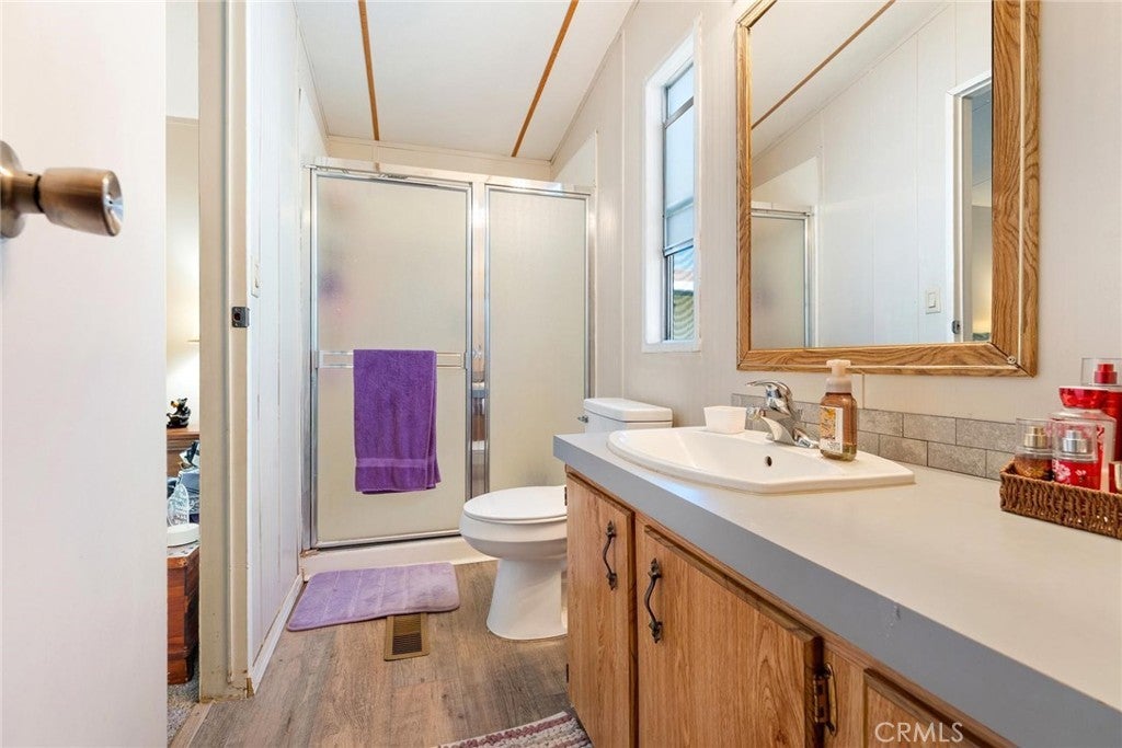 This perfect 2 bedroom 2 bathroom mobile home is located in Juniper Terrace 55+ senior community. Ready for new owners! Home has been loved and taken care of. Light and bright open concept with laminate floors. Each bedroom is ample in size and are on opposite sides of the home. Outside patio is open to outside living, enjoy a cup of coffee or glass of wine on porch. Carport could accommodate 3 cars. Shed stays.