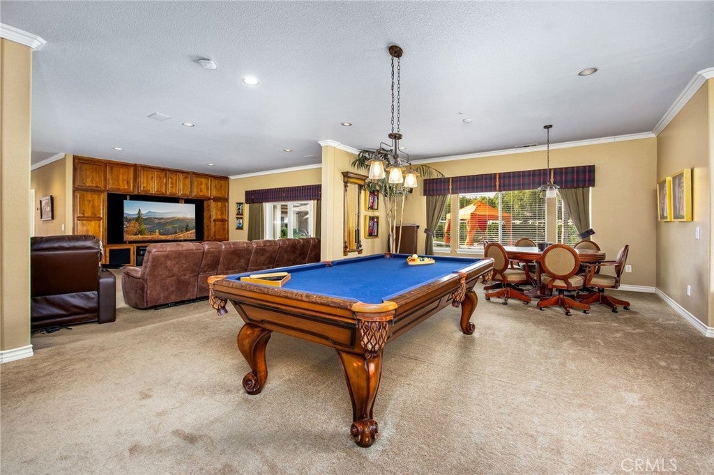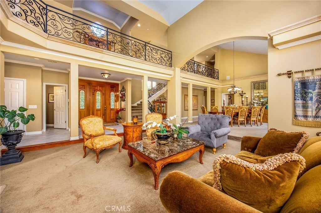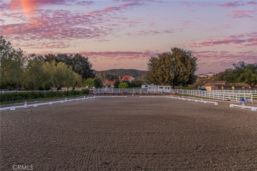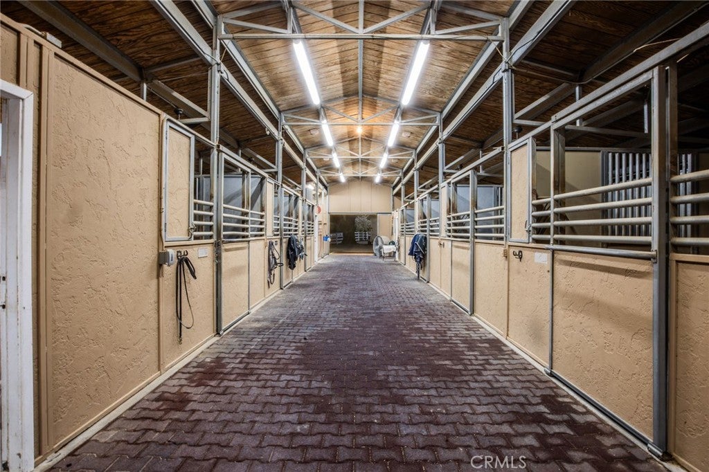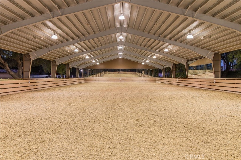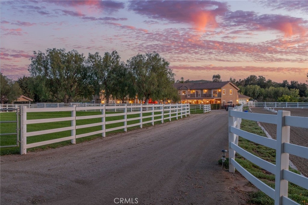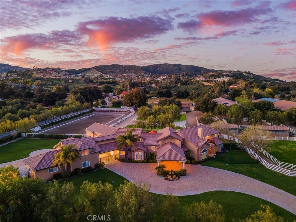 Welcome to one of La Cresta’s premier gated equestrian estates, offering over 5 acres of fully developed horse facilities paired with more than 8,500 square feet of luxury living. Designed for the serious equestrian, this exceptional property delivers a true training-level setup rarely found in Southern California. The professional-grade equestrian complex features an Olympic-size outdoor arena with premium footing and mirrors, an 8-stall breezeway barn with indoor/outdoor box stalls, a 4-stall Mare Motel, tack room, wash rack, feed room, barn restroom, and dedicated laundry area. A separate covered hay barn and 70-foot roll-up garage provide ideal storage for horse trailers, RVs, or equipment. Three grass pastures and two dirt turnouts offer ample space for turnout and conditioning. Beyond the equestrian facilities, the estate welcomes you with a grand motor court and covered loggia leading into an elegant residence with soaring ceilings, a formal living room with fireplace, and French doors opening to the outdoor entertaining areas. The gourmet kitchen features dual Cove dishwashers, a large walk-in pantry with additional refrigeration and wine cabinet, and flows seamlessly into the formal dining space. Just off the kitchen is a cozy den, along with a mud room and dedicated laundry room for everyday functionality. The main level also includes a private bedroom, two offices, and an expansive bonus room complete with full bar, fireplace, and cinematic entertainment setup. Upstairs, the mirrored gym with ballet barre offers a dedicated fitness space. In addition to the luxurious primary suite with wet bar, fireplace, dual balconies, heated stone floors, steam shower, soaking tub, dual vanities, and two walk-in closets, there are three additional bedrooms, each with its own private bathroom. The upper level also features abundant built-in cabinetry and extensive storage throughout the hallway and between the bedrooms and gym. The outdoor living area features a paver-stone driveway, solar-heated pool and spa, expansive patios, plus a garden and orchard with more than fifteen mature fruit trees. Additional highlights include a 4-car garage with EV charging, full-house gas generator, and private water well systems. All set in prestigious La Cresta, just minutes from shopping, dining, and Temecula Wine Country.