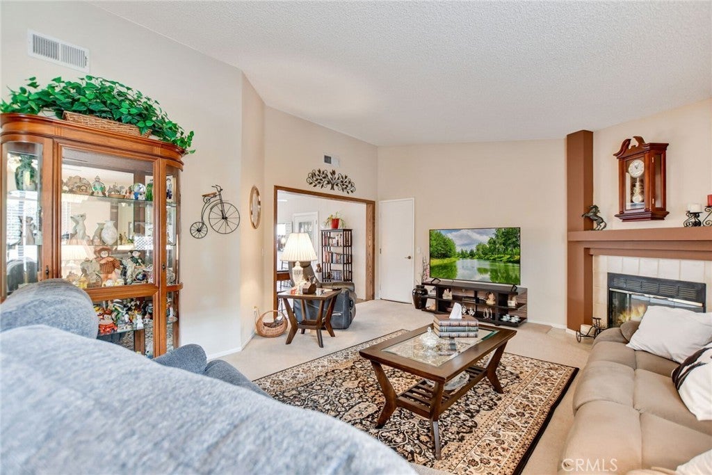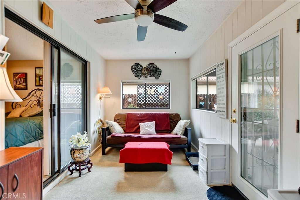 Welcome to this great 55+ home in Hemet del Sol, this senior community has low HOA dues of only $60/YEAR and provides great affordable senior living. This property features 2 bedrooms and 2 baths, primary bath has a walk in shower, guest bath is shower over tub, a spacious living room with vaulted ceilings and a gas fireplace to take the chill of those brisk winter days. The kitchen features ample cabinet space, tile counters, the frig is included and a new microwave and an eating area in a bay window in the kitchen for casual meals. This property also includes a bonus room off the master bedroom that is not included in the square footage but provides additional space for reading or relaxing or possible guest accommodations. There is a private covered back patio area that is a great spot to sit outside for a cup of coffee or a glass of wine. The 2 car garage is accessed of the back alley and has direct access to the house, washer and dryer also included. There are ceiling fans throughout, all walls and carpet are light and neutral. The primary bedroom has a walk in closet and the guest bedroom has mirrored wardrobe doors.