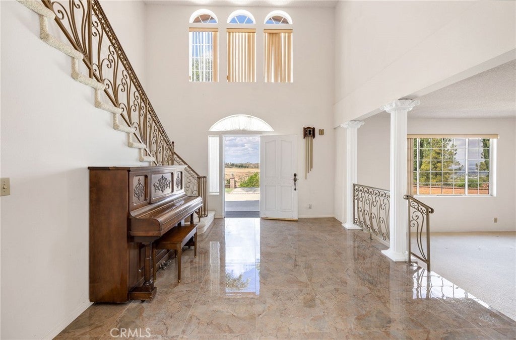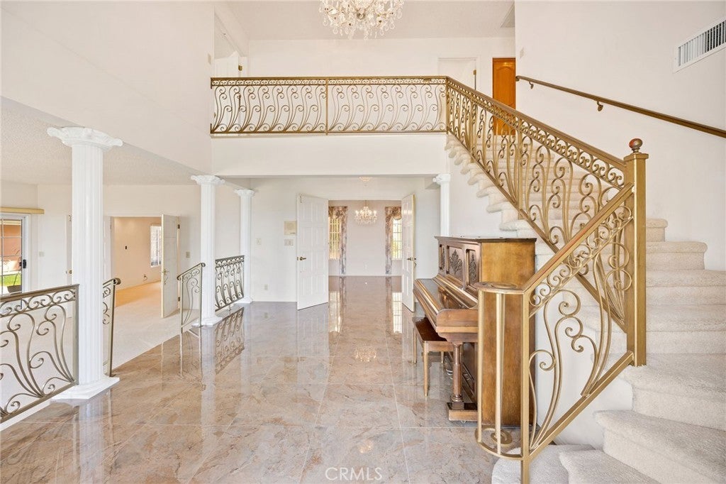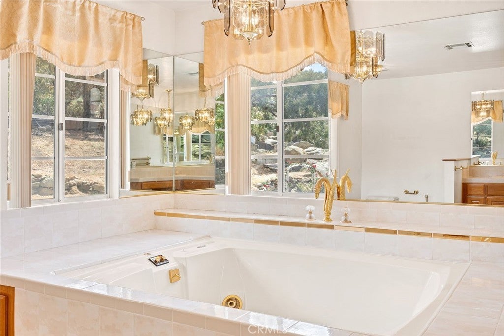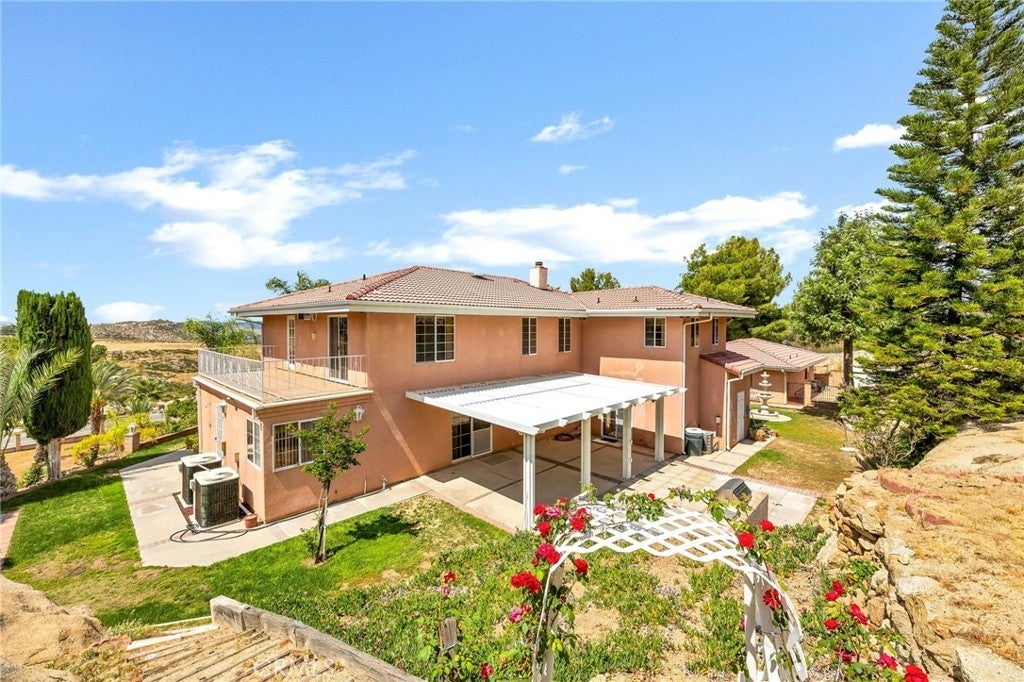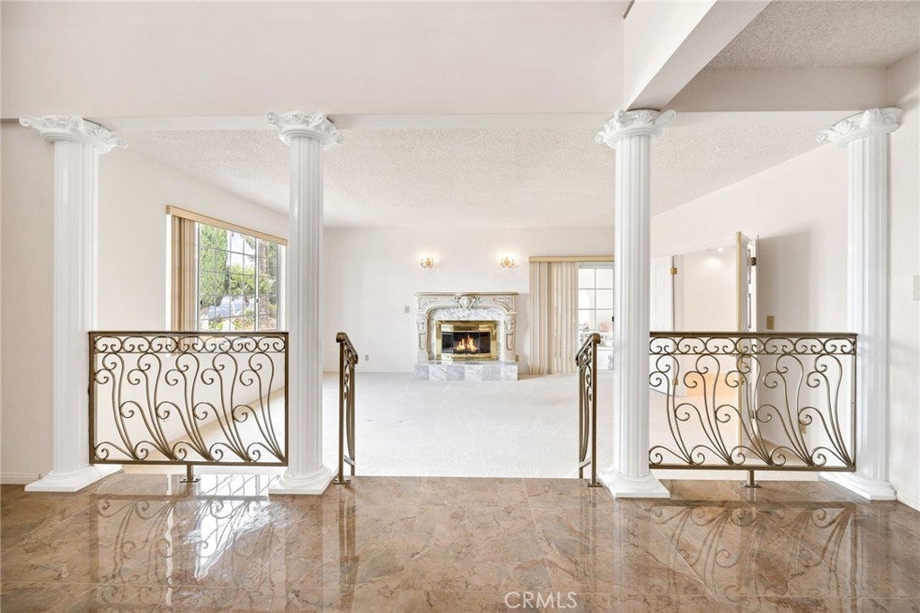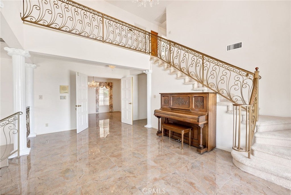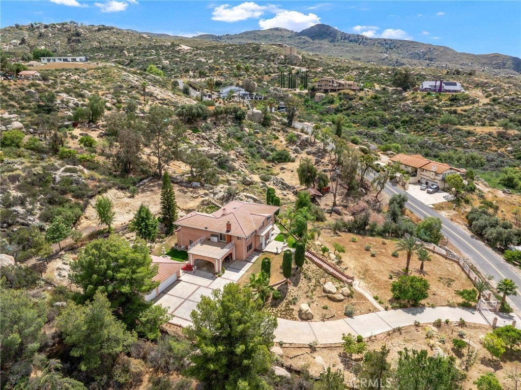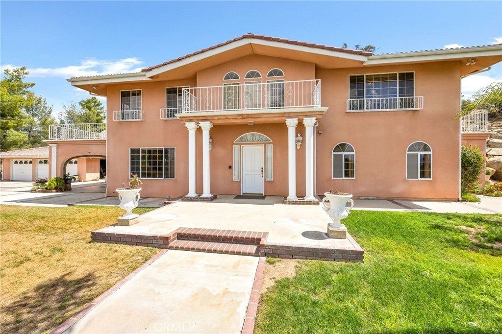 Italian Villa Estate – First Time on the market. Experience timeless elegance in this stunning two-story estate, built in 1988 and offered for the first time. Situated on nearly one acre behind a private electric security gate, this exceptional property offers panoramic views of the valley and Diamond Lake, 3,677 square feet of living space, four bedrooms, five baths, and a three-car garage complete with a three-quarter bath. Step through the grand front entry into a gracious foyer illuminated by a dazzling crystal chandelier. Porcelain floors, a formal sunken living room, and an ornate staircase set the tone for the home’s refined character and architectural beauty. The formal dining room is designed for memorable entertaining, featuring elegant finishes, a statement chandelier, and beautiful porcelain flooring that creates a sophisticated ambiance. Adjacent to the dining area is a spacious recreation room perfect for gatherings. Appointed with Tiffany-style ceiling lighting, plush carpeting, a large wet bar, and a convenient half bath, this space is ideal for hosting family and guests alike. A sun-filled den with distinctive lunette windows offers privacy and sweeping views, making it perfect for a home office, library, or media room. An additional half bath is located nearby for convenience. The generously sized kitchen is thoughtfully designed with abundant cabinet and counter space, a large electric cooktop, built-in microwave, and newer French-door refrigerator. The laundry room is conveniently located just off the kitchen. Upstairs, you’ll find four bedrooms and two full baths, along with dual balconies on either side of the home that capture breathtaking views. The expansive primary suite is a true private retreat, complete with its own fireplace, wet bar, and an oversized balcony offering nearly 360-degree panoramic views of the valley, surrounding hills, and Diamond Lake. The luxurious en-suite bath features a large vanity with dual sinks, a spacious shower, two closets (including a walk-in), and an elegantly designed private whirlpool tub. Outdoors, enjoy breakfast on your private patio with an Alumawood cover, built-in barbecue, lush lawn, and mature shrubs and trees. A stately red brick staircase, leads down to beautifully landscaped gardens, fruit trees, and picturesque views below. This remarkable estate embodies classic charm, refined living, and the ultimate luxury—privacy