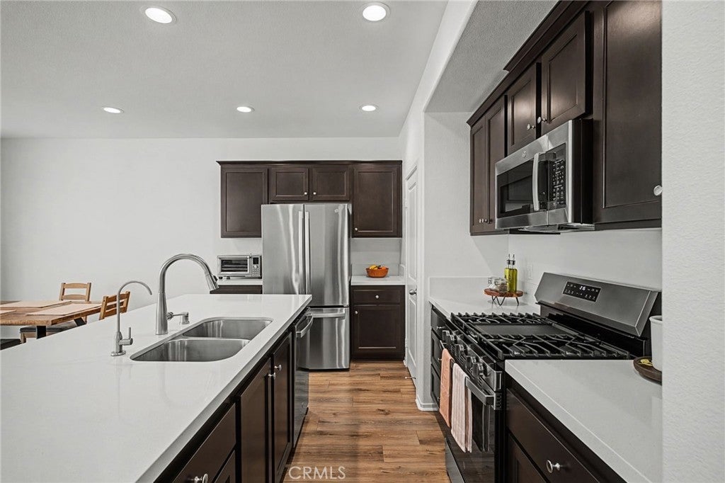 Located within the desirable Copper Skye community, this upgraded Tri Pointe Homes residence blends modern design | thoughtful builder selections | and everyday functionality. The open-concept layout creates a natural flow between the great room | dining area | and chef-inspired kitchen featuring an AquaTru WATER FILTRATION SYSTEM at the sink | UPGRADED CABINETRY | QUARTZ COUNTERTOPS | STAINLESS STEEL APPLIANCES | GAS RANGE | WALK-IN PANTRY | and designer fixtures — ideal for entertaining or relaxed day-to-day living. Premium WPC FLOORING runs throughout the main living areas, complemented by clean interior paint selections and modern interior doors that give the home a fresh | contemporary feel. The home includes a CEILING FAN PREWIRE PACKAGE | UPGRADED LIGHTING SELECTIONS | INTERIOR FINISH UPGRADES | ENERGY-EFFICIENT FEATURES | and a SOLAR SYSTEM designed to support long-term efficiency. Upstairs, the private primary suite offers a comfortable retreat with DUAL VANITIES | GLASS-ENCLOSED SHOWER | and upgraded finishes, while the additional bedrooms provide flexibility for guests | workspace. Residents enjoy access to the COMMUNITY POOL and neighborhood amenities. Thoughtfully designed. TURNKEY and MOVE-IN READY, this home offers the right balance of comfort | style | and location within one of the Inland Empire’s growing communities.