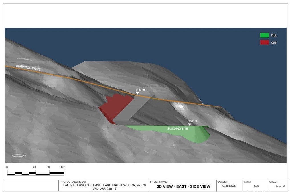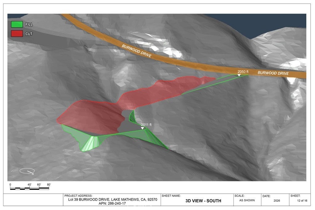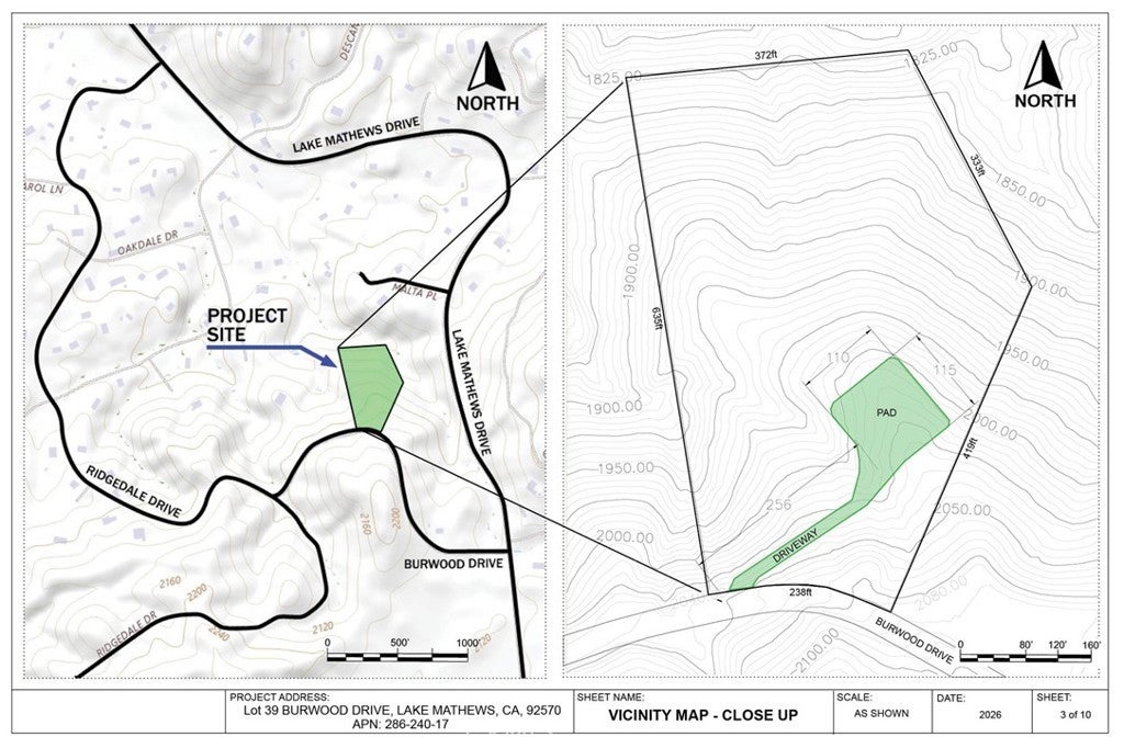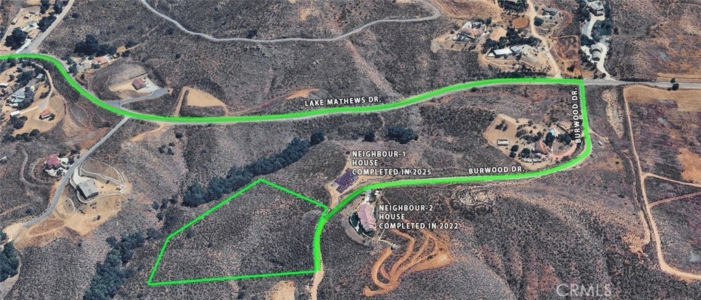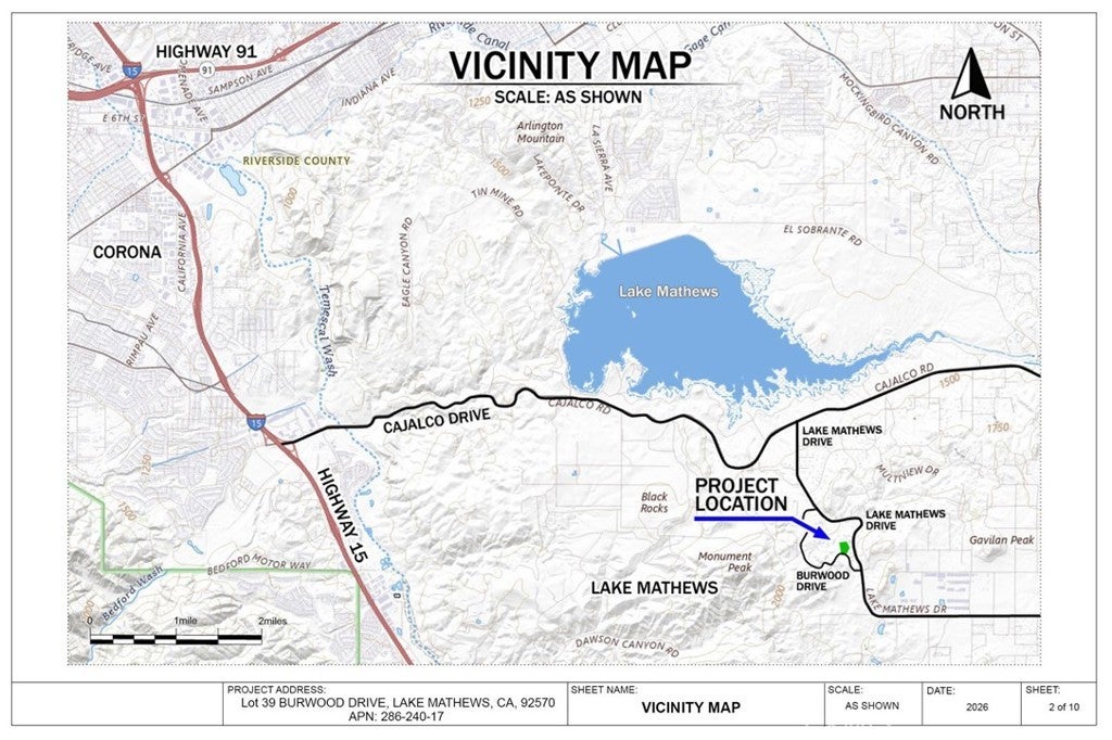 Panoramic Lake Mathews View Estate Land - 5.47 Acres - Development Work Included Welcome to the beautiful Lake Mathews. This is a Prime Lake Mathews land with one of the best lake views in the area. Great opportunity to own a large, 5.47 acre view lot in the heart of Lake Mathews. 180 degree unobstructed panorama lake views. Located on a quiet road, surrounded by newly built custom residencies. This is the largest property on this road. Preliminary engineering grading plans with computer 3D models, calculations and visualizations are included in the purchase. The plans include a 195 feet long driveway, a 115'x110' graded flat pad for a 4000 square feet house and a 4000 square feet garage to store cars, RVs, boats, motorcycles, or any of your toys. No restriction on build type: from luxury mansion through large custom home to a small home, prefabricated homes to mobile homes, Lake Mathews is developer friendly. 3D visualization of the entire land topography, digital models and data files are included with the sale. A second area is available for a second pad that can accommodate a pool and entertainment area, or a horse stable, or an ADU. Keep horses, dogs, or any farm animals, Lake Mathews is a welcoming place for animals. The property is zoned R-A-2-1/2. Plenty of space for your dream home, toys, garage/shop, horses and sports facilities. Shopping center is close by, just 14 minutes away (Target, Kohl's, Best Buy, Petco), Restaurants, Planet Fitness, Banks, REGAL Movie complex, golfing. The property is located in the highly rated Corona-Norco Unified School District, elementary, middle and high schools are top rated. Easy access to the 15 and 91 freeways. This is a peaceful area with low tax rate. This land is a perfect opportunity for a large estate surrounded by preserved land and with 5.47 acres this property offers lasting privacy and unmatched natural beauty. The property includes several acres of gently sloping land between the planned home site and the neighboring property, helping ensure that your lake view remains permanently unobstructed. Enjoy the spectacular views of the lake and mountains.