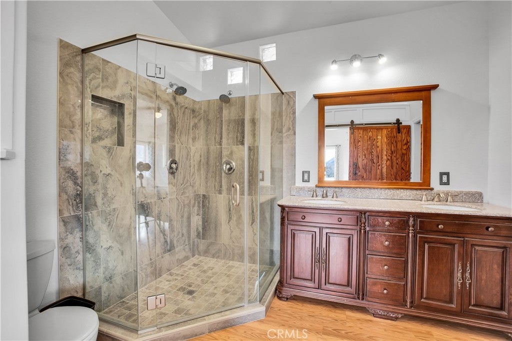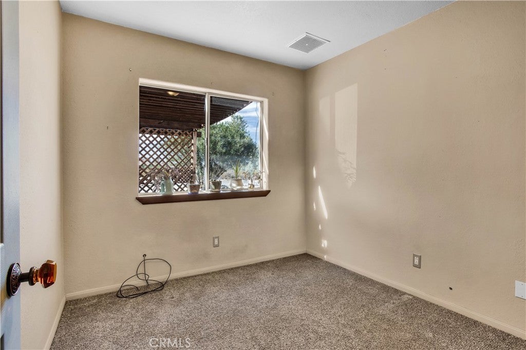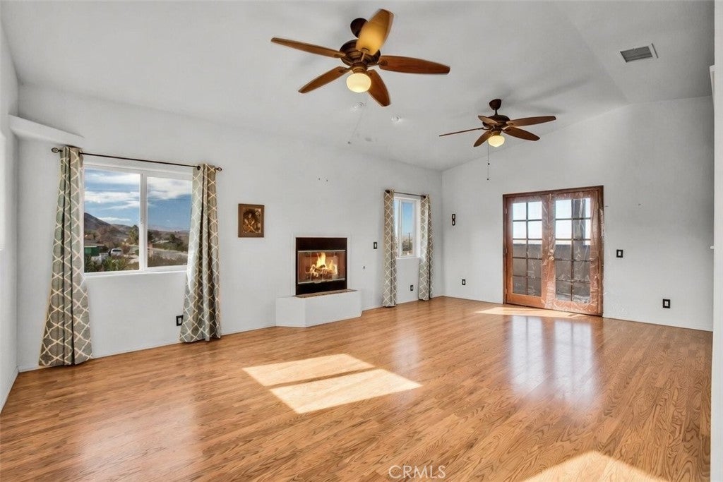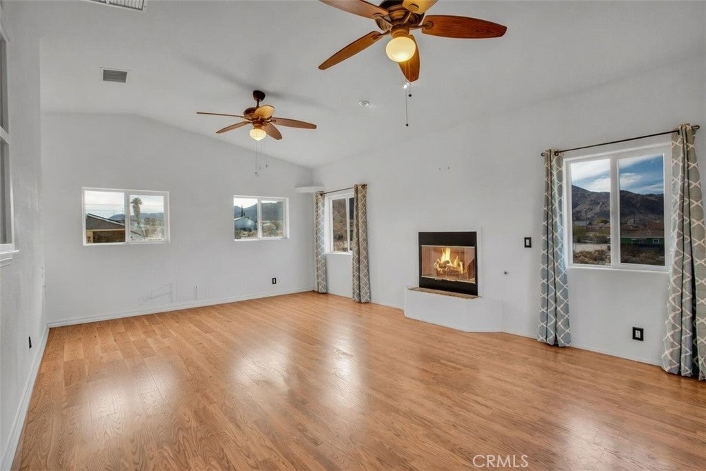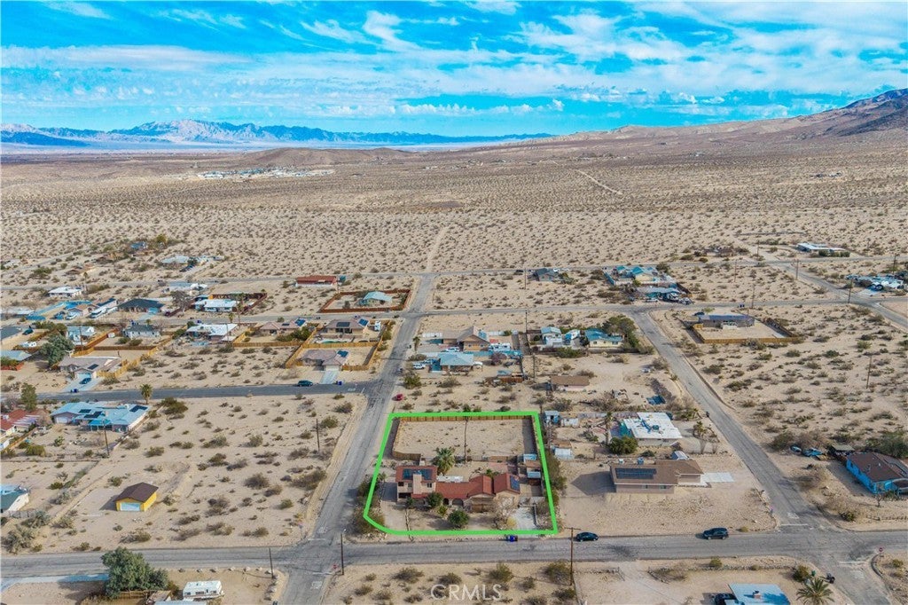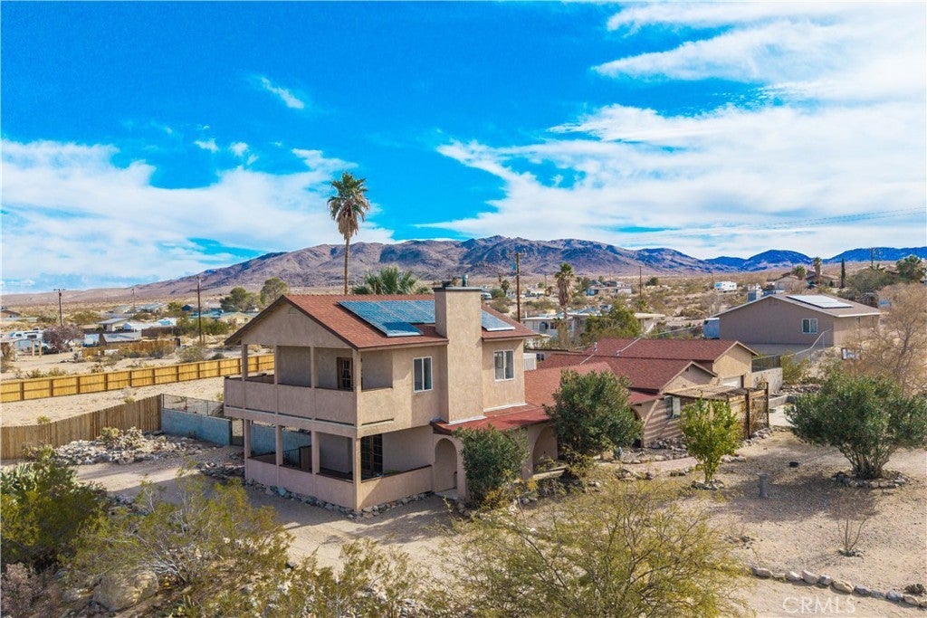 Welcome to 7565 Sherman Hoyt Ave in Twentynine Palms, a stunning two-story home offering incredible 180-degree views stretching from Big Bear and the San Bernardino Mountains to Goat Mountain, Landers, and across the entire Twentynine Palms basin and military base. This spacious property features three bedrooms downstairs plus a private upstairs master suite, totaling four bedrooms and two and a half bathrooms. The expansive living room offers a gas fireplace (currently wood burning), ceiling fan, French doors to the covered patio, and a storage closet tucked neatly under the staircase. The kitchen has been upgraded with granite slab countertops, center island, built-in storage cabinetry, pull-out faucet, dishwasher, gas oven and stove with overhead microwave, and opens to a dedicated dining area. Downstairs includes three bedrooms with mirrored closet doors and ceiling fans (one with light only), a full bathroom, and an additional half bath powder room. Upstairs, the master suite offers vaulted ceilings, two ceiling fans, a cozy fireplace with gas log set, walk-in closet, updated walk-in tile shower, and French doors leading to a wraparound balcony showcasing breathtaking panoramic desert views. The suite also features its own private entrance, creating potential for multigenerational living or possible second unit use. The home is equipped with dual cooling systems including central HVAC plus multiple evaporative coolers, along with paid-off and owned solar for energy efficiency. Additional features include a custom front door, covered front porch with paver walkway, one-car garage with roll-up door and opener, washer and dryer hookups with electric dryer connection, and a pull-through lot design. The backyard is fully enclosed with block wall fencing and offers mature desert landscaping including lemon tree, pomegranate, desert willow, rosemary, bougainvillea, fan palms, desert sage, multiple cacti, and decorative local quarried rock accents. There are three sheds on the property with no known leaks; one shed has electricity and could serve as an art studio, workshop, or tool shed. A covered patio off the living room creates additional outdoor living space. The vacant lot next door may also be available for purchase, offering the opportunity to expand your footprint. Buyer to verify all information including square footage, lot lines, zoning, and potential uses.