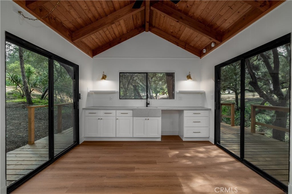Beamed Ceilings, Wet Bar, Built-in Features, Balcony, Ceiling Fan(s), Cathedral Ceiling(s), Separate/Formal Dining Room, High Ceilings, Living Room Deck Attached, Open Floorplan, Pantry, Quartz Counters, Recessed Lighting, Storage, Bedroom on Main Level, Main Level Primary, Primary Suite, Walk-In Pantry, Walk-In Closet(s), Track Lighting, Workshop