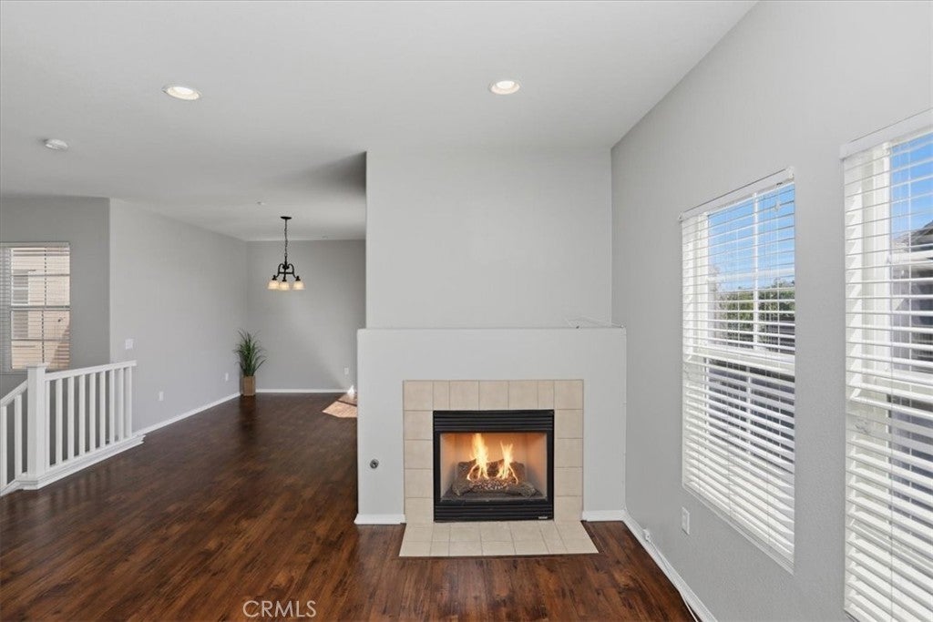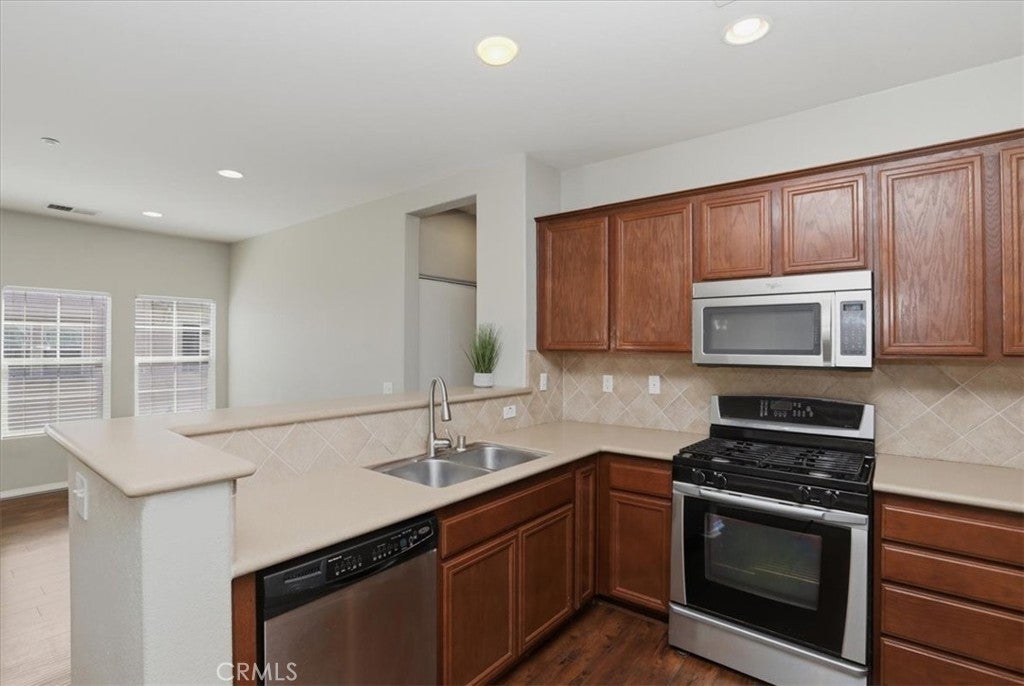 Located in the desirable Casabella community, this well-maintained 2-bedroom, 2-bath condo offers approximately 1,304 sq ft of living space and a spacious, open floor plan. Built in 2006, the home features a courtyard entry shared with neighboring residences, creating a welcoming approach to the front door. Inside, the open layout is enhanced by wood laminate flooring throughout with no carpet and neutral paint tones that create a bright and inviting atmosphere. The kitchen is well appointed with Corian countertops, tile backsplash, stainless steel appliances, and ample cabinet space, opening conveniently to the dining area and main living space—ideal for both everyday living and entertaining. The living room is accented by a cozy fireplace, adding warmth and character to the main living area. One of the standout features of the home is the two large balconies, including one off the dining area and a large private balcony off the primary bedroom, perfect for relaxing outdoors. Both bedrooms offer generous space and their own walk-in closets, with the primary suite also featuring a private full bathroom. Additional conveniences include an indoor laundry closet and a two-car attached garage, providing practicality and extra storage. Residents of Casabella enjoy community amenities including a pool and spa, playground, beautifully landscaped common areas, and security guard service. The community is adjacent to a large park and ideally located with easy access to shopping, restaurants, and nearby city amenities, making it an excellent opportunity for buyers seeking convenience in a well-maintained neighborhood. Great value in this attractive price range.