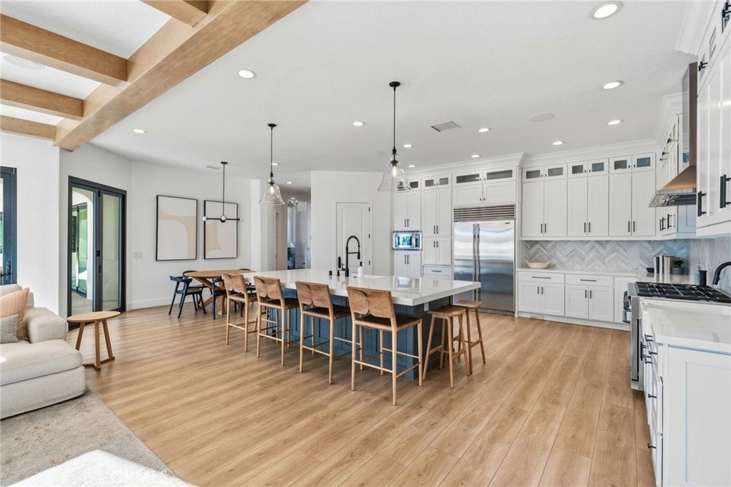 Beamed Ceilings, Ceiling Fan(s), Separate/Formal Dining Room, Eat-in Kitchen, High Ceilings, In-Law Floorplan, Open Floorplan, Recessed Lighting, All Bedrooms Down, Main Level Primary, Multiple Primary Suites, Walk-In Closet(s)