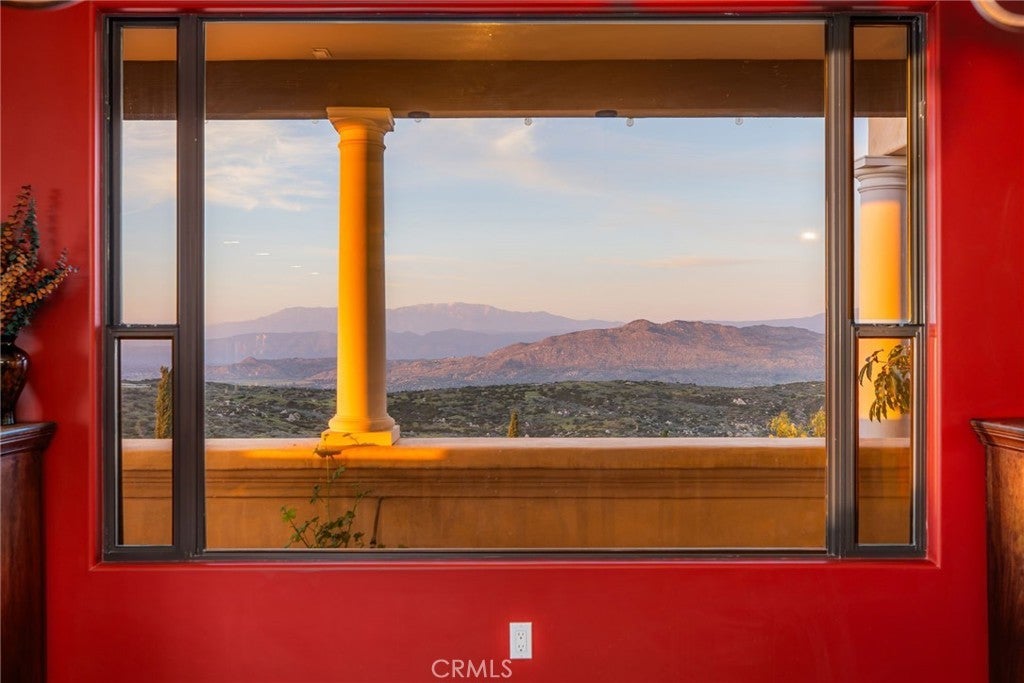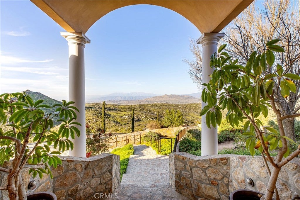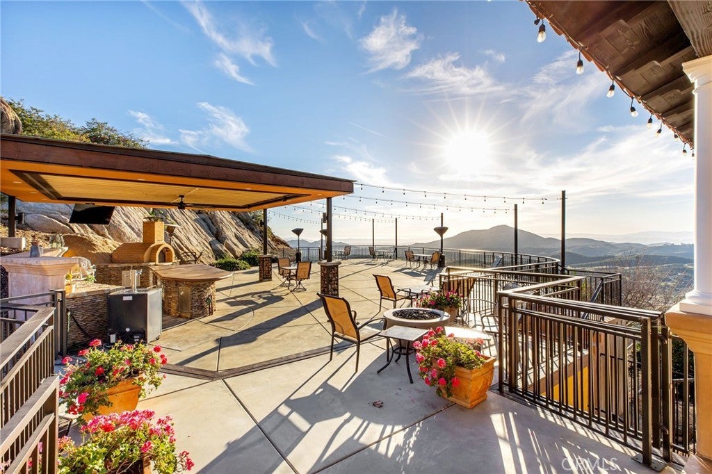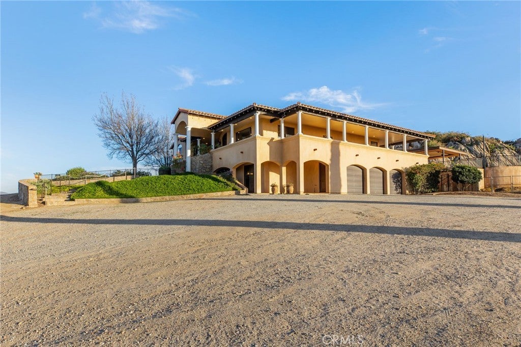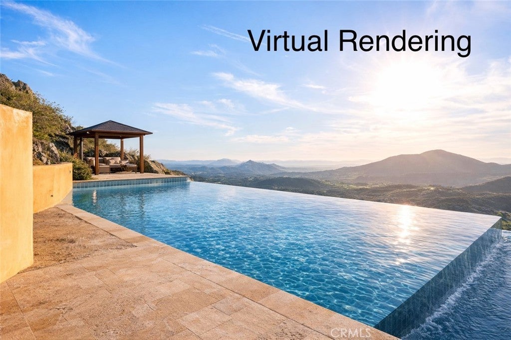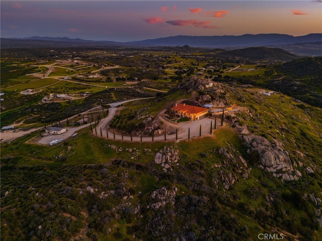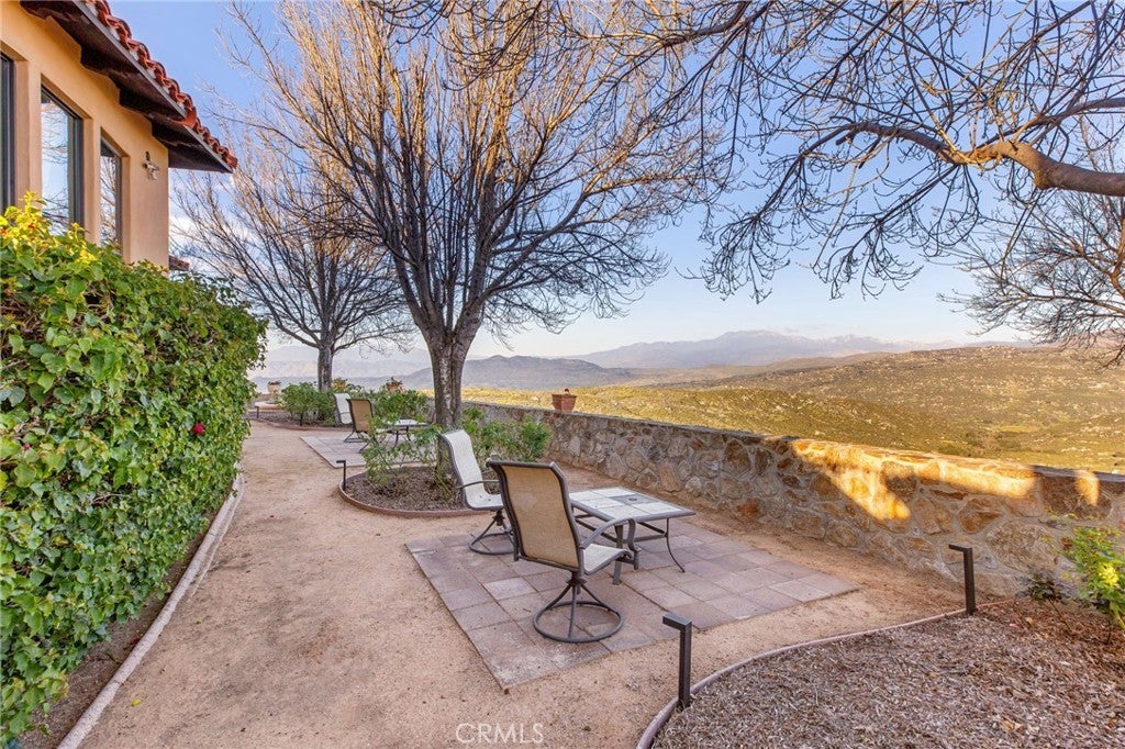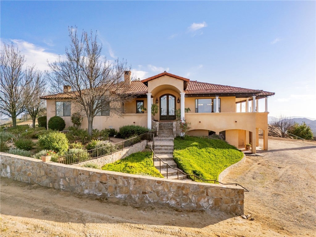 They say you can't move a mountain, but you can buy one here. Extraordinary Tuscan inspired estate set on approximately 20 acres in the Sage/Temecula wine country area, offering breathtaking sunrise and sunset panoramic 360 views stretching from Temecula to San Gorgonio and Santiago mountain ranges. Views from every window in the home. Full guest house, separate 18,000 sqft graded pad perfect for an equestrian area and barn/full roping arena. Just a short 12 minute drive from Temecula Wine Country, shopping, dining. The impressive 5,301 SQFT main residence was thoughtfully designed offering a flexible floor plan with 5 to 6 bedrooms and 6 bathrooms. Inside you will find elegant living spaces that actually include materials mined from the property in the rock/slate fireplace. Including a library, exercise room, theater/game room and formal dining area. The chef’s kitchen is equipped with premium appliances including a Sub-Zero refrigerator, built-in Miele coffee system, 2 dishwashers, large butlers pantry and an oversized walk in pantry complete with dumbwaiter. Temperature controlled 700 bottle wine room offers the perfect environment for collectors. A separate 1,793 SQFT guest house provides 3 bedrooms, 2 bathrooms and its own laundry facilities. Outdoor living spaces are equally impressive with approximately 5,000 square feet of patio areas including a 2,500 square foot covered patio and an additional 2,500 square foot open patio designed for entertaining. The outdoor kitchen also featuring materials mined from the property, features two BBQ grills, a pizza oven, sink with disposal, refrigerated drawers, water heater and plumbed patio heaters for year-round gatherings. The beautifully landscaped grounds feature 50 producing olive trees, 36 cypress trees, fragrant Grosso lavender plantings and a charming rose garden. Three raised masonry garden planters provide space for vegetables or herbs. Additional features include a 970 foot deep private well, 15,000 gallons of water storage, a 14.2 kW OWNED solar system, 1 newer Generac generators with automatic transfer switch and 1 propane tank that powers everything for dependable backup power. Technology upgrades include five internet routers for strong connectivity across the property all with some extra passive income generation. The property is county registered for Airbnb, creating an exciting opportunity for short-term rental income or luxury retreat use.