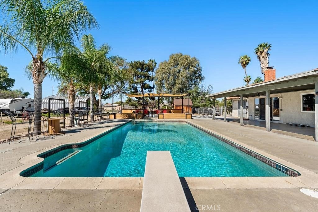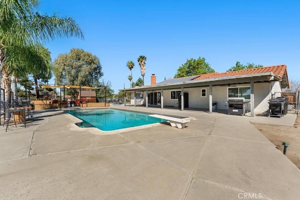 Welcome to 1581 Hackney St. This home is a must see! It offers almost an acre (.87) of outdoor living, great for all your toys! Remodeled interior with a light and airy open concept. Laminate flooring throughout, new quartz countertops, installed can lighting, freshly painted kitchen cabinets that offer plenty of cupboard space, accent barn wood pillars on island, cozy fireplace with hearth. New double pane window and slider, new front door. All 3 bedrooms are ample in size and both master bathroom and guest bath room have been completely remodeled with tile and shiplap. New water heater 2025, roof re-done 2025, all new pool equipment 2026, home was replumbed 2021. whole house fan and mini split have been installed. The exterior has so much to offer built in Pergola with poured concrete 2026. Built in planters with benches. Property has a detached shop/garage that is 30x40 partially drywalled with electricity with 110 and 200 amp panel, and solar panels. Shop/garage also has a 30amp outlet on the exterior of the shop for RV hook up. Horse stall, chicken coop, play station and crossed fencing for horses will remain. All that and lets not forget the inground pool and spa for those hot summer Hemet days and nights. Schedule your private showing today