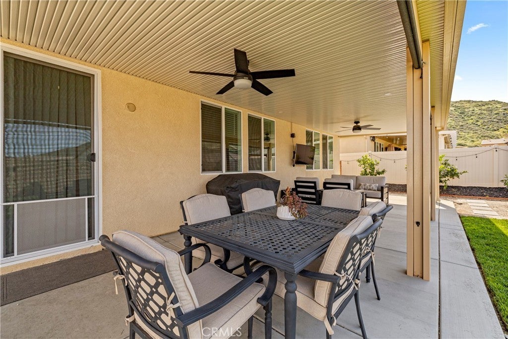 Welcome to 29567 Cherokee Trail a beautifully upgraded home that blends modern comfort, functionality, and outdoor living at its finest. From the moment you arrive, you’ll notice the enhanced curb appeal featuring professional landscaping, hardwired landscape lighting, an extended driveway and walkway, and upgraded Sherwin Williams paint throughout. Step inside to find a thoughtfully designed interior with upgraded modern door handles, a stylish barn door in the primary suite, and ceiling fans installed in both the living room and primary bedroom for added comfort. The kitchen has been tastefully improved with an upgraded sink and faucet, perfect for both everyday living and entertaining. Step outside into your private backyard retreat designed for both relaxation and entertaining. Enjoy a covered patio complete with two ceiling fans, lighting, privacy shades, and a dedicated outlet ready for your outdoor TV. The space is elevated with a concrete slab extension connecting the patio to the extended driveway, hardwired string lights for warm ambiance, additional electrical outlets, and a fully installed drip system for easy plant maintenance. The backyard also features sod, sprinklers, three citrus trees, and a dedicated dog run. Additional highlights include: • Hardwired security camera system with mobile and local controls • Added attic crawl space storage • Blinds throughout the home This home truly offers the perfect combination of thoughtful upgrades, energy efficiency, and indoor-outdoor California living. Don’t miss your opportunity to own this turn-key property in a desirable location.
