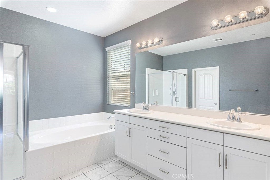 *PAID OFF SOLAR* Immaculate single-story home offering 3 bedrooms, 2 bathrooms, and 2,117 sq. ft. of beautifully upgraded living space. Built by Beazer Homes, this exceptional property showcases quality craftsmanship and thoughtful custom upgrades throughout. From the moment you arrive, you’ll appreciate the outstanding curb appeal, highlighted by a beautifully landscaped front yard and a 3-car garage with epoxy flooring. Designed with both style and efficiency in mind, the home features Energy Star certification, a tankless water heater, and an included solar package (Paid Off). Inside, rich dark wood flooring flows through the entry, dining room, great room, and kitchen, creating a warm and elegant feel. The flooring pairs perfectly with white cabinetry, stunning quartz countertops, upgraded lighting, and stainless steel appliances. The spacious open-concept layout is ideal for everyday living and entertaining, featuring a huge kitchen with an impressive island that opens seamlessly to the dining area and great room. The private primary suite is thoughtfully separated from the secondary bedrooms, offering a peaceful retreat. The luxurious primary bathroom includes dual sinks, a separate shower, a huge walk-in closet and a relaxing soaking tub. The backyard has a great newer patio cover, thick lush grass, wonderful landscaping and is ready to entertain your family and friends. This neighborhood offers convenient access to a variety of nearby amenities, making it a wonderful place to call home.