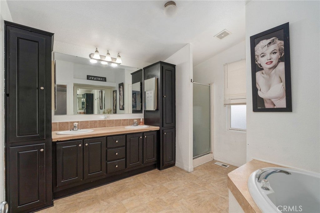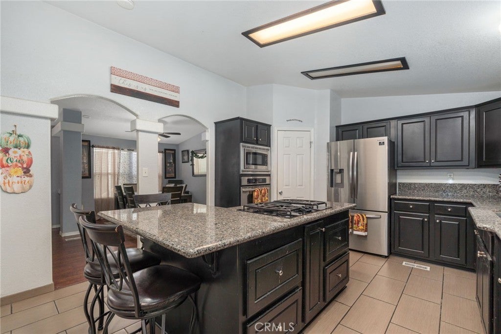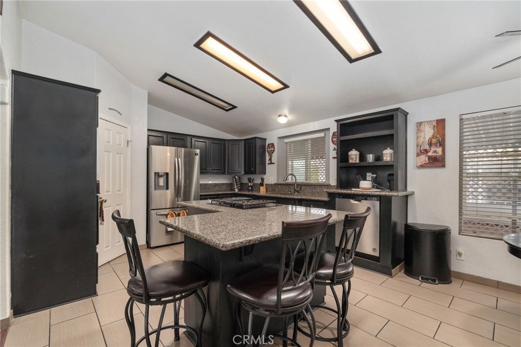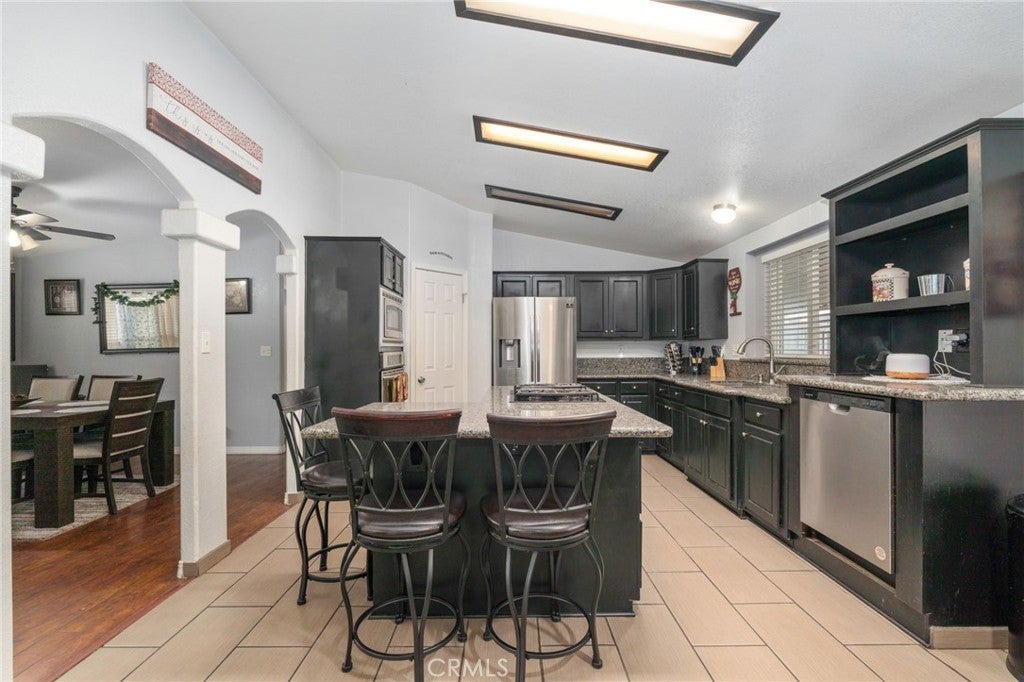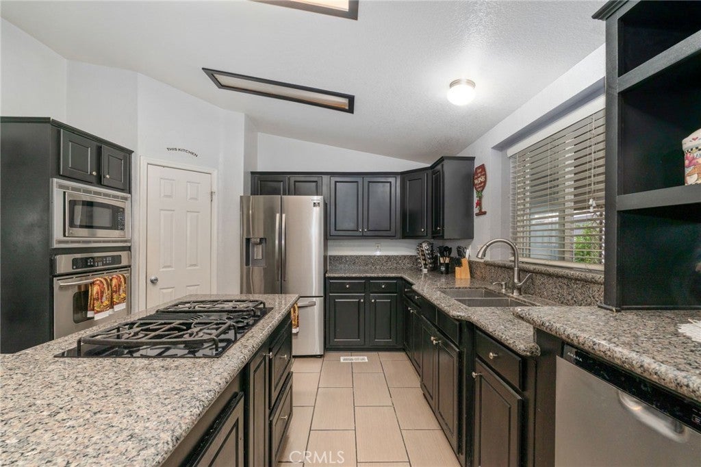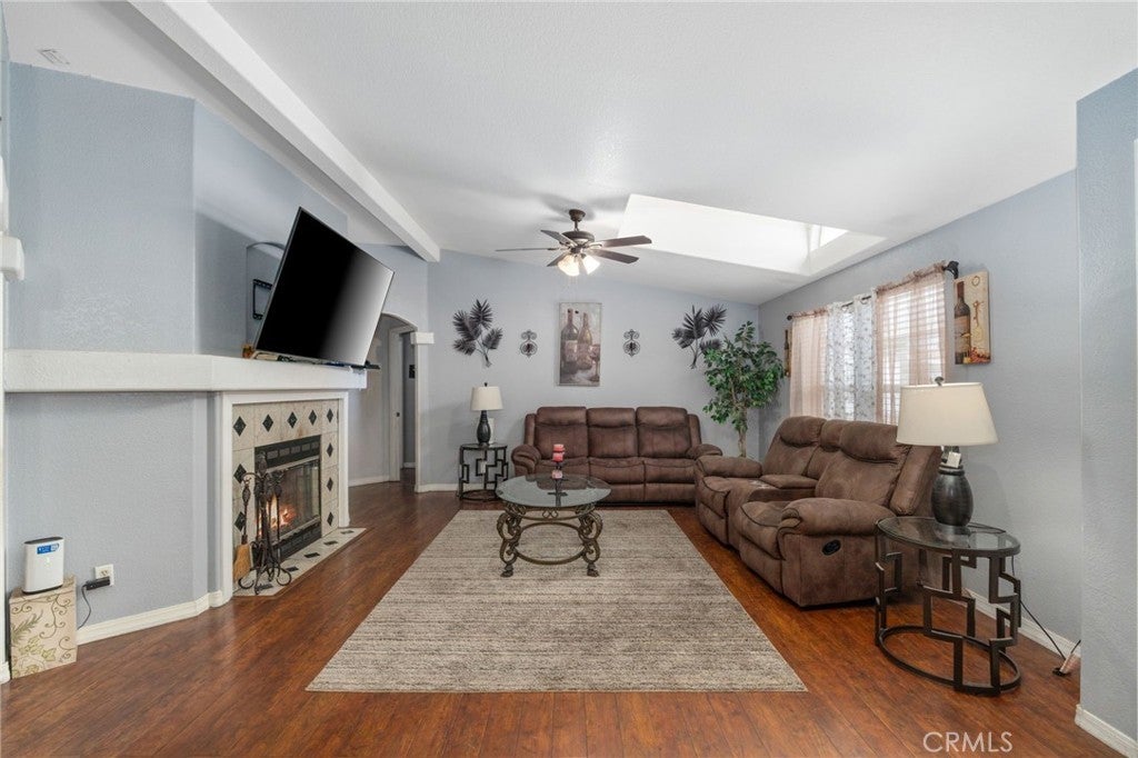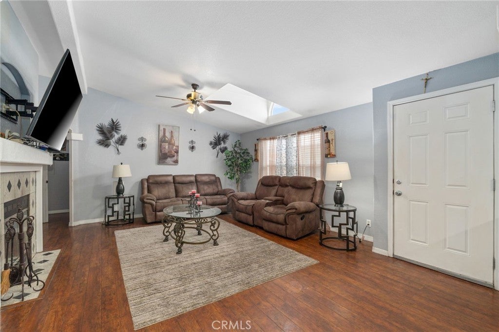 Welcome to this beautifully maintained mobile home located in the desirable Capri Estates all-age community. From the moment you step inside, you’re greeted by a spacious living room featuring a tiled wood-burning fireplace, ceiling fan, and a skylight, perfect for relaxing or entertaining. As you move through the home, you’ll appreciate the elegant archways that lead into the kitchen. The kitchen is thoughtfully designed with mocha brown cabinetry, granite countertops, an extra-deep dual stainless-steel sink with a modern faucet, a built-in oven and microwave, dishwasher, and a stainless-steel refrigerator. The L-shaped center island is ideal for cooking and gathering, featuring a cooktop, additional counter space, and a breakfast bar for casual dining. A walk-in pantry and tiled flooring complete this functional and stylish space. Adjacent to the kitchen is a separate dining area with a ceiling fan, perfect for hosting meals. The home also offers a convenient indoor laundry room with a washer and dryer included, a utility sink, storage cabinets, and direct access to the carport. The spacious primary bedroom features an ensuite bathroom with a dual-sink vanity, walk-in closet, separate glass-enclosed shower, and a relaxing soaking tub. On the opposite side of the home, you’ll find two additional bedrooms and a secondary bathroom, ideal for family or guests. Additional features include ceiling fans in all bedrooms, a newer roof replaced within the past couple of years, and a fully gated perimeter for added privacy. The long driveway and storage container at the back of the carport provide ample parking and extra storage space. Residents of Capri Estates enjoy access to community amenities, including a clubhouse and pool. Conveniently located in one of Fontana’s most sought-after mobile home parks, this home is just one block from the 10 Freeway, offering easy commuting. Ontario International Airport is approximately 10 miles away, and the community is surrounded by a variety of shopping centers for added convenience.