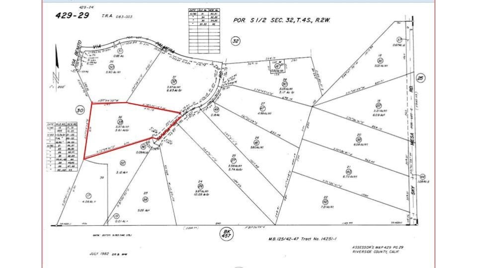 Vacant Lot #38, ~5.61 acres in "The Ranch at Sky Mesa" gated community offers secure access with high-tech cameras along with spectacular views of the natural landscape. This HOA community features 77 lots with estate homes on 5+ acres. The lot has ~240 feet of frontage on Tapatia Rd, with underground utilities, paved streets, and a nearby fire hydrant at the cul-de-sac. Located in southwestern Riverside County, the Lake Perris State Recreation Area and Diamond Valley Lake are easily accessible. It is conveniently close to Ramona Expressway, Highway 74, and the I-215. Only ten miles from the South Perris Metrolink Station and Perris Valley Airport-L65.