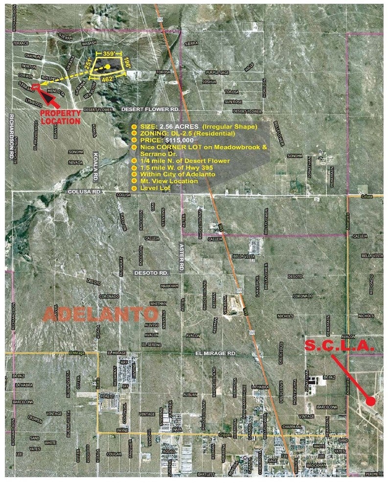 1. Prime CORNER LOT on Meadowbrook Ave. (80’ wide) & Serrano Dr. (60’ wide), within City Limit w/ superb mountain view 2. Approx 462’ of frontage on Serrano Dr. (a very good dirt road) 3. 4 mile W. of future SCLA business park 4. 1/4 mile N. of Desert Flower Rd. 5. 1.5 mile W. of Hwy 395 6. New Adelanto Civic Center, commerical centers with stores/restaurants, and residential communities are breaking ground in Adelanto right now. The information provided herein is deemed accurate, but buyer and agent to do own due diligence. There are no warranties, express or implied.
