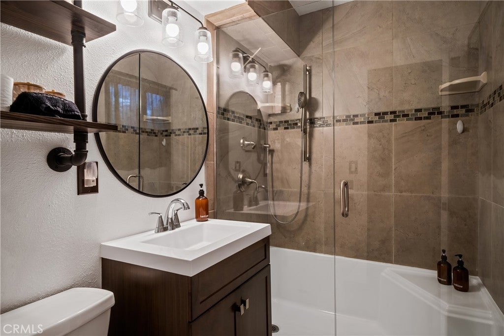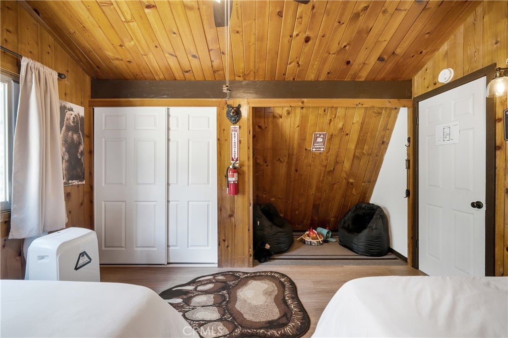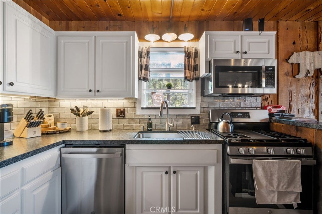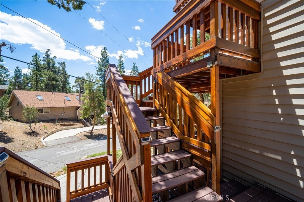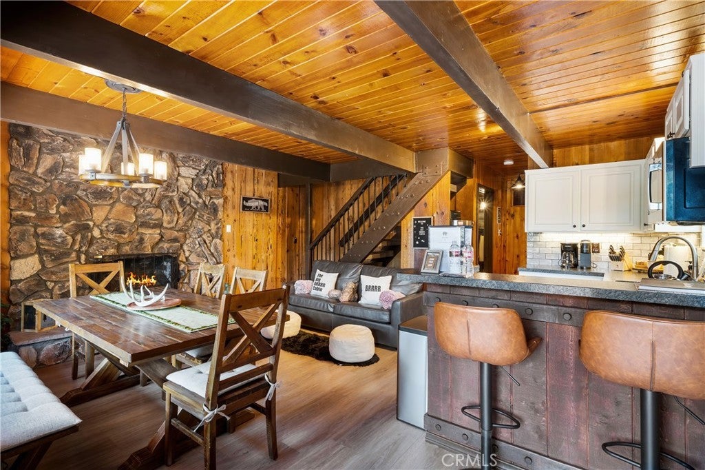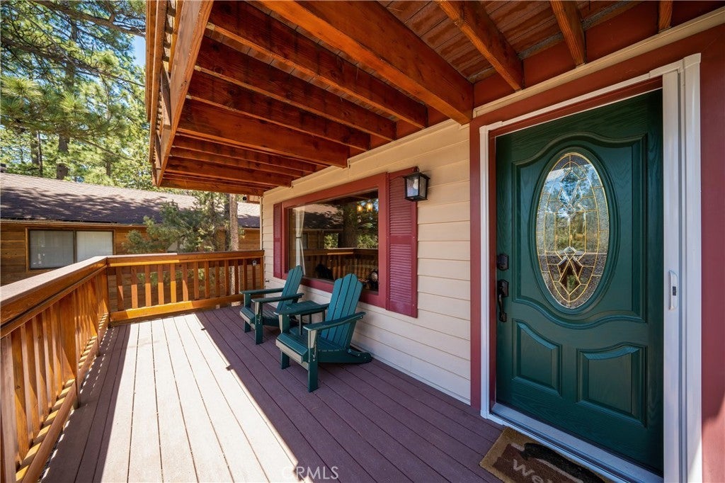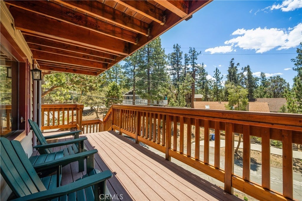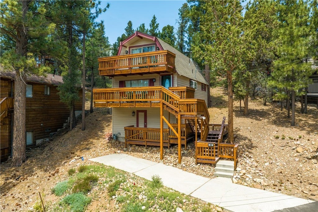 Escape to the mountains and indulge in the ultimate cabin retreat! This beautiful Big Bear cabin is located in Whispering Forest, one of the highly desirable neighborhoods in Big Bear City. This 3-bedroom, 1-bathroom cabin is nestled in a quiet neighborhood surrounded by soaring pine trees, beautiful views of neighboring cabins, and peak-a-boo views of Snow Summit and Bear Mountain Ski Resorts. Located on an 8,960 sq ft lot, this home offers privacy and seclusion while still being minutes away from the lake, ski resorts, hiking trails, boat ramp, and The Village (Big Bear Lake's hub for dining, shopping, and entertainment). The open-concept layout of the living room and dining area makes this cabin very comforting and inviting. The cabin features a big-picture window that offers a panoramic view of nature day in and day out. The kitchen has new countertops and modern tiles that truly complement the rustic feel of the cabin. The fireplace has been updated and it features a wall-mounted remote that creates a warm and welcoming ambiance, any season of the year. The laundry area is located on the main floor which is very accessible. This cabin has a newly installed A/C which is a major plus since only a few cabins in Big Bear have a central A/C system installed. The main floor already offers a lot to see but there is more to explore on the second level where the 2 spacious bedrooms are located, with one of the bedrooms having a private balcony. This cabin epitomizes mountain luxury and the perfect escape from city life. Don't miss this incredible opportunity to own a mountain cabin with breathtaking views.