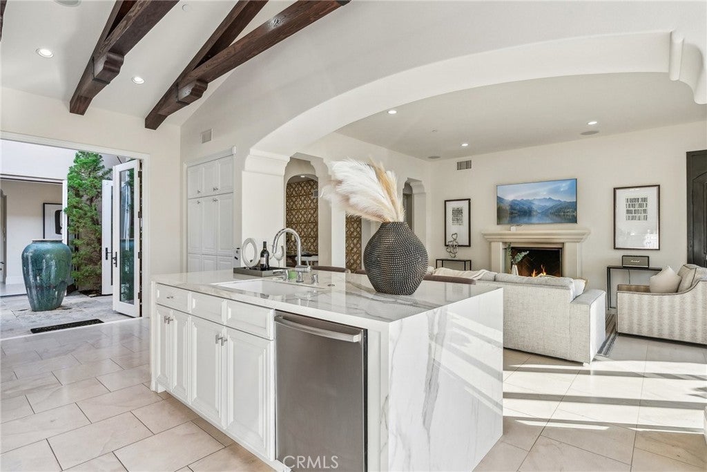 Welcome to this breathtaking luxury estate located in the exclusive, guard-gated enclave of Crystal Cove in Newport Coast. Perched high above the Pacific, this extraordinary residence offers panoramic ocean, canyon, and coastline views that create a truly serene and private retreat. This custom-designed masterpiece blends timeless Mediterranean elegance with contemporary sophistication. From the moment you arrive, you're greeted by exquisite curb appeal: rustic stone accents, terracotta rooflines, and a peaceful, tree-lined driveway that sets the tone for the home's serene and elevated ambiance. A gracious arched entryway leads into a luminous foyer and tranquil interior courtyard, framed by architectural columns and punctuated by a sculptural water feature — a design centerpiece that blurs the line between indoor and outdoor living. The heart of the home is a light-filled great room, seamlessly flowing into the gourmet kitchen and dining spaces. A dramatic arched window showcases panoramic coastline views, while the open-concept floor plan is anchored by high ceilings, honed limestone flooring, and custom wood detailing throughout. The chef’s kitchen is outfitted with premium Sub-Zero appliances, an oversized island with waterfall-edge countertop, and an artful tile backsplash. The adjacent formal dining room offers two sets of French doors to the courtyard and a stunning custom geometric feature wall — ideal for entertaining in any season. This home features 4 bedrooms and 3.5 bathrooms, including two main-level bedrooms — one of which serves as a second primary suite or private guest quarters. Upstairs, the primary suite is a true sanctuary with a private ocean-view Juliet balcony, spa-inspired bath with tub, and views that stretch across the coastline. An additional en-suite bedroom and a fully built-out home office/loft with rich wood cabinetry complete the upper level. Step outside your own resort-style backyard where a luxurious infinity-edge pool/spa, lush landscaping, and a custom-built fire feature overlook the sparkling Pacific. Multiple lounge areas, an outdoor kitchen with built-in BBQ, and a shaded dining pavilion invite unforgettable sunset gatherings and elegant al fresco living. Located in the 24-hour guard-gated community of Crystal Cove, residents enjoy access to private Canyon Club amenities, dining and shopping at Crystal Cove Promenade, miles of pristine beaches, scenic trails, and top-tier Newport Coast schools.
