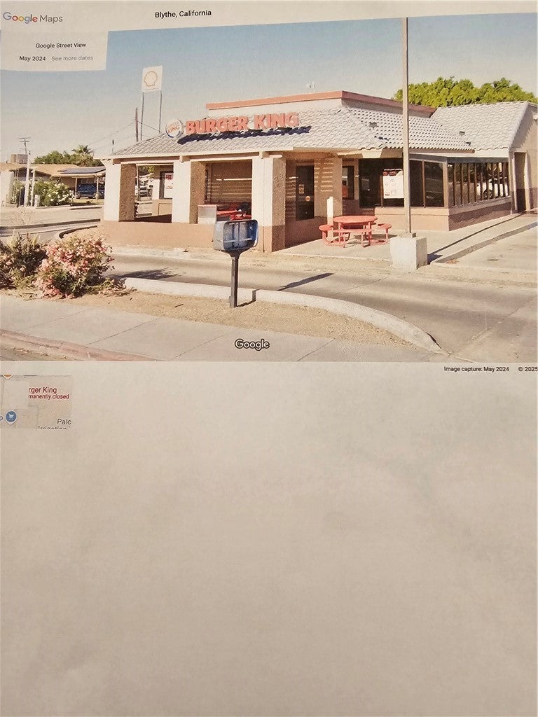 Once in a life time to own a fast food restaurant building below replacement cost, in City of Blythe, Riverside County. Well maintained newer concrete free standing with national franchise restaurant set up, well suited for all kinds of fast food restaurant businesses. Adjacent businesses include Taco Bell, MacDonald's, Carl's Jr., Del Taco and Jack in the Box are just nearby, within walking distance. Holiday Inn, Traveodge By Wyndham, Days Inn and Motel 6 are just across the street. Chevron, Circle K, Shell, Phillips 66 and Valero gas stations are within corners on same Lovekin Blvd., a prime downtown site in City of Blythe. Value add property, opportunity for immediate turn around profit with $200,000 below replacement cost. Make offer subject to interior inspection.