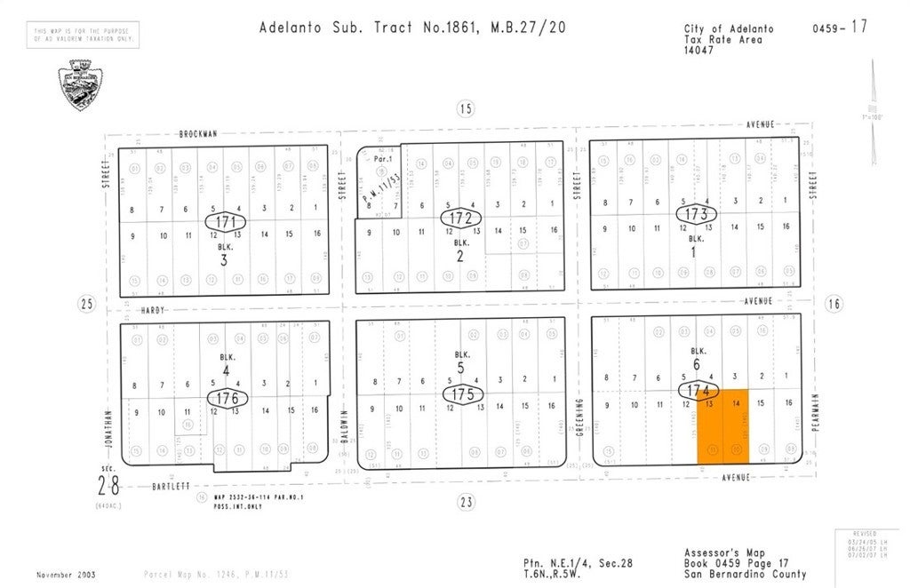 Great investment opportunity towards the future expansion in the City of Adelanto and surrounding High Desert communities. 2 lots (approx. 13,440 sqft total) located in an established neighborhood in the heart of downtown Adelanto. Zoned for a wide variety of uses. Poised for future growth with proximity to the Southern California Logistics Airport (SCLA) with tenants that include Amazon, Dr. Pepper-Snapple, Boeing, GE, and more. Owner is highly motivated. All reasonable offers will be considered. Seller will consider carrying the loan. Please refer to posted pictures for reference only. All information deemed reliable but not guaranteed. Buyer to do their own due diligence and perform inspections and investigations regarding, but not limited to, the usage of the land and city ordinances.