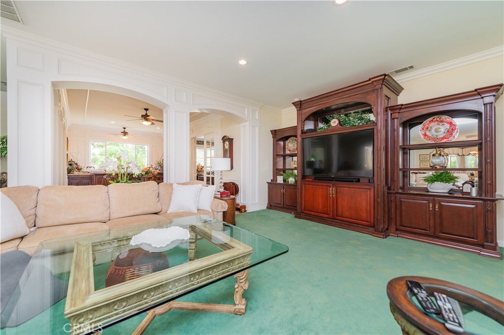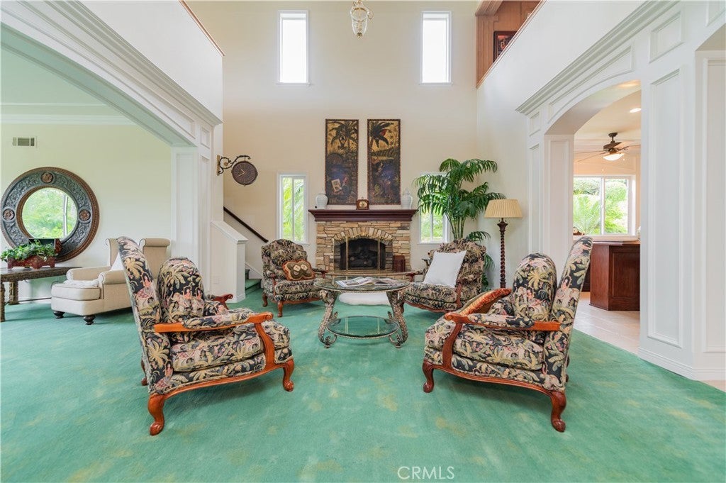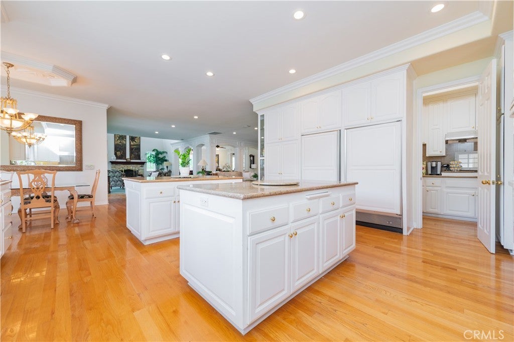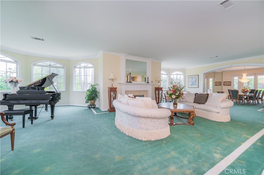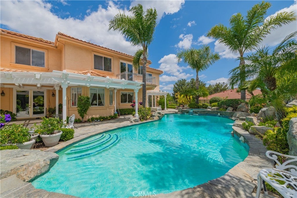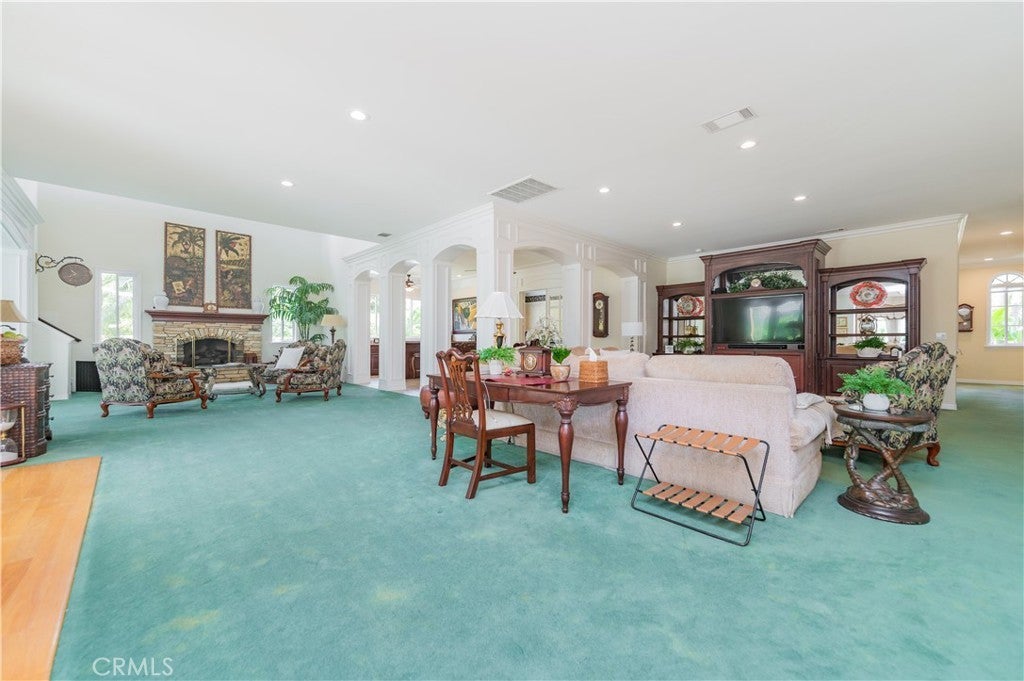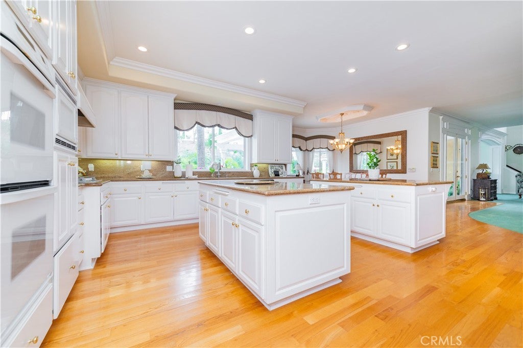 This exceptional estate, with original owner, located in the prestigious gated community of The Country, spans two parcels and boasts six luxurious bedroom suites, offering unparalleled comfort and privacy. An office with a full bath that can be used as the second downstairs bedroom suite, and an elegant, well-appointed powder room conveniently located between the formal living room and spacious family room, making it ideal for entertaining. A dramatic two-story grand entry with a crystal chandelier welcomes you. Wide double staircases leading to different sections of the upper level set an impressive tone upon arrival. The formal living and dining rooms provide generous spaces for gatherings, while the family room is equipped with a custom-built-in entertainment center and is seamlessly connected to the large open kitchen, breakfast nook, a couple of cozy conversation sitting areas, and a gorgeous wet bar with a table for wine tasting. The gourmet kitchen is a chef’s dream, complete with dual center islands, custom cabinetry, and an adjoining wok kitchen for added culinary flexibility. Enjoy casual dining in the bright breakfast nook, perfectly situated off the open kitchen layout. Designed for both everyday living and grand entertaining, this home offers a thoughtfully designed floor plan that encourages flow and connection. Crown molding throughout the home. Wide and open upper-floor hallway with wainscot paneling. The upstairs laundry room is conveniently located near all bedrooms, and a bedroom-sized storage room provides ample space for seasonal décor and miscellaneous items. An expansive bonus area with paneled ceiling and walls is ideal for billiards, gaming tables, or displaying collectibles, offering endless opportunities for leisure and personalization. Custom window coverings throughout the home add a refined finishing touch. Outside, the professionally landscaped grounds are a true oasis, featuring a resort-style pool and spa, gazebo, fire pit, flagstone walkways, tastefully placed plants, flowers, and many mature trees, plus a large grassy area perfect for recreation or relaxation. A four-car garage with built-in cabinetry ensures ample parking and organized storage. This residence combines elegant design, practical functionality, and luxurious amenities — perfect for those who love to entertain and live in comfort.