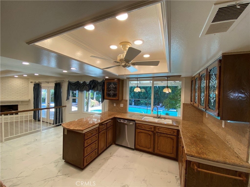 Gorgeous Single Family Pool House in nice North La Verne neighborhood. Solar system. Great Bonita School District. 5 Bedrooms, 3.5 bathroom. Live area 3002SQF. Lot size 10270SQF. 3 cars garage attached. Manicured gardens, mature trees, grass area & a front patio. Backyard w/pool & spa, covered 2 patios w/ceiling fans & lighting, professional landscaping. Family room w/a fireplace, custom lighting & French doors to backyard. Fully remodeled including brand new windows, flooring and all bathrooms. Kitchen w/granite counters, stainless appliances, recessed lighting, new electric range & breakfast nook open to family room. Living room w/leaded glass front window, recessed lighting & formal dining room w/chandelier & French doors to backyard. Downstairs 1.5 bathrooms. Upstairs master bedroom w/vaulted ceilings, slider w/wood shutters that lead to a balcony & two closets. Master bath w/dual sinks, granite counters, new cabinetry, custom lighting, a brand new stand up tub, separate shower. Four spacious bedrooms upstairs. Huge room w/wood laminate floors & a slider w/shutters to a wrap-around balcony w/mountain views. Full upstairs guest bath. Convenient to I-210, 10 & 57 and a variety of shopping, dining and entertainment venues. Tenants need to take care the pool and garden service fee.