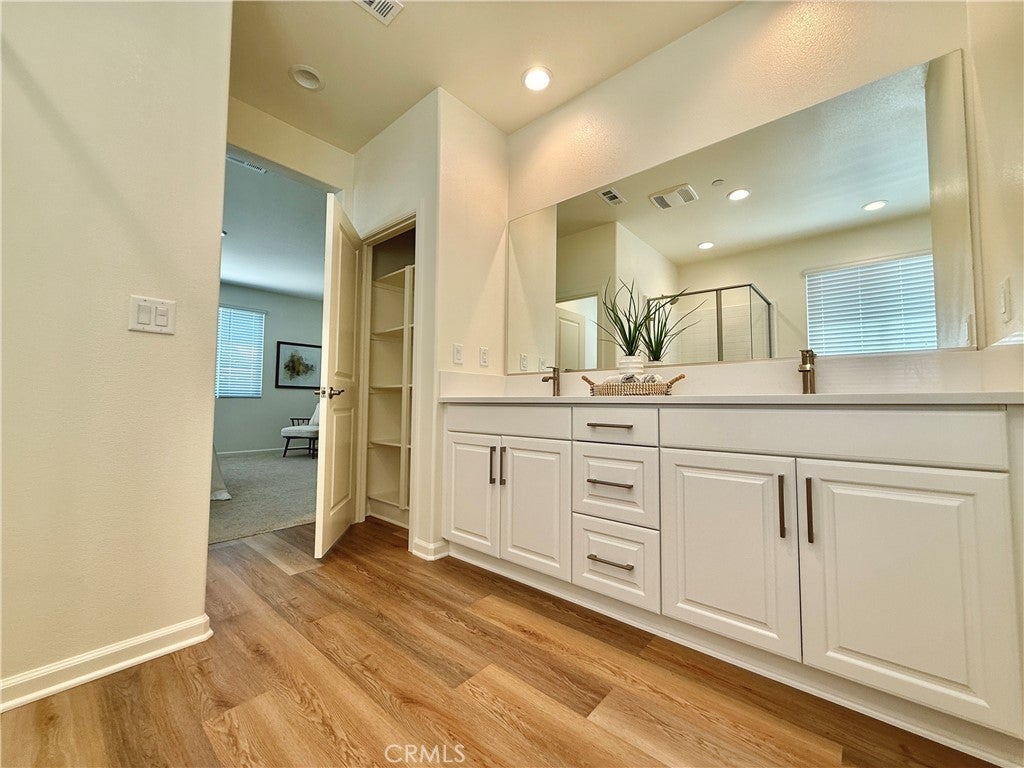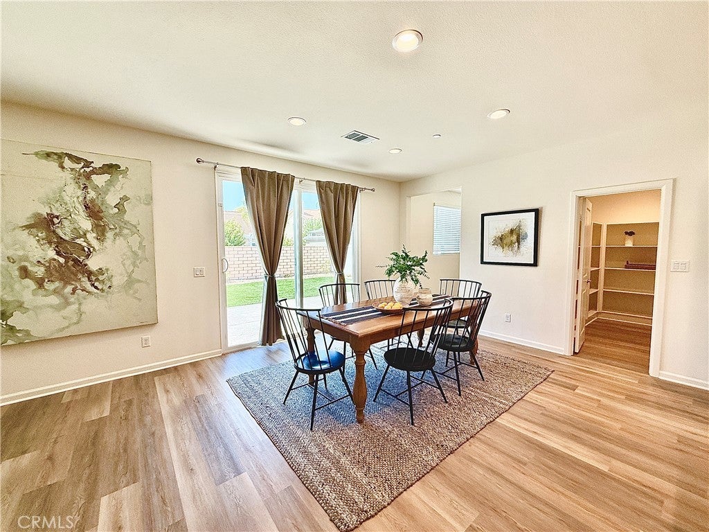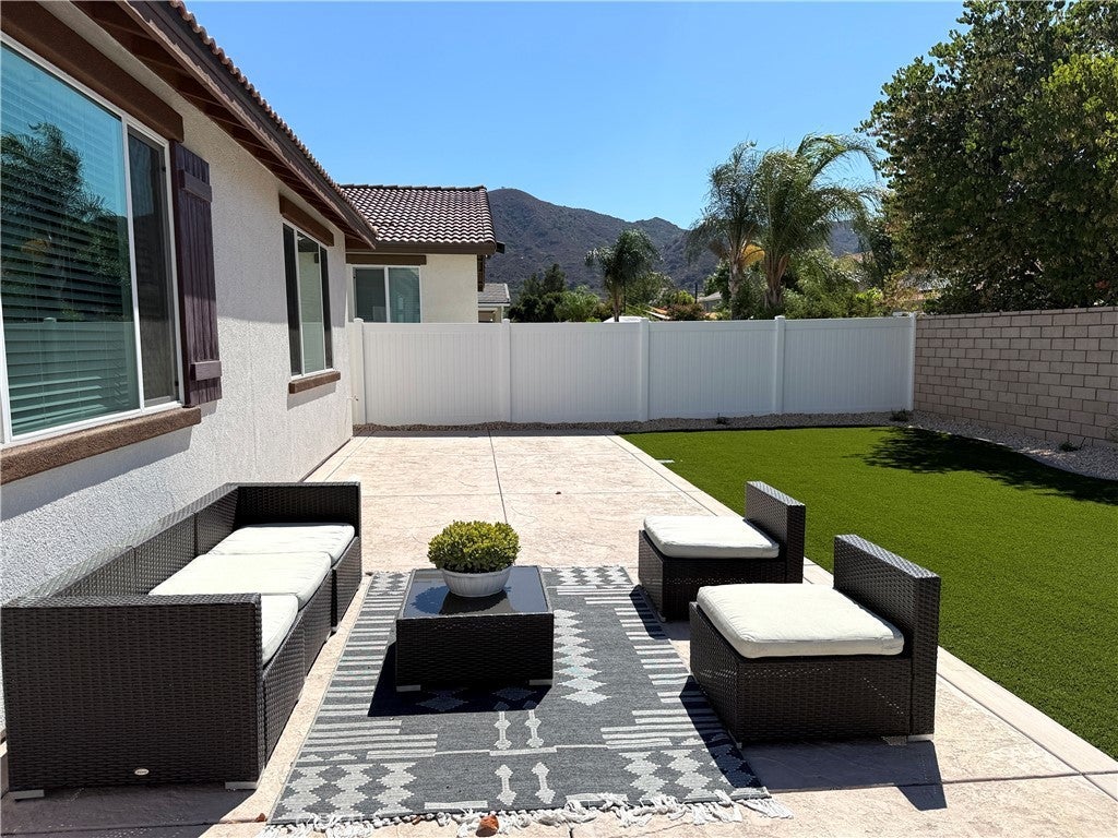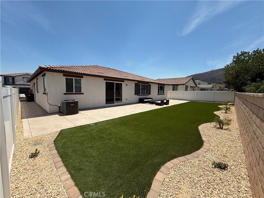 Don’t miss this rare opportunity to own a highly upgraded, better-than-new 2023 Beazer home with paid-off solar and a luxuriously landscaped backyard, nestled in the desirable Boulder Creek community—just minutes from Murrieta. This 2,599 sq ft single-story Chicory floor plan offers 4 bedrooms, 3 baths, a dedicated office with built-in desks, and a spacious 3-car tandem garage. Set on a premium cul-de-sac lot with single-story neighbors to the left and back, it offers enhanced privacy, curb appeal, and ample parking. The professionally landscaped backyard is an entertainer's dream—featuring a wide, wraparound colored stamped concrete patio, lush artificial turf, vibrant flowers and trees, automatic drip irrigation system, and breathtaking mountain views. Inside, soaring 9-ft ceilings and luxury vinyl plank flooring flow throughout. The gourmet kitchen with granite countertops, Whirlpool stainless steel appliances, a large island that seats four people with pendant lighting, a Moen Spot Resist Stainless Sleek farm-style faucet, and a deep stainless sink. Cabinet upgrades include pull-out shelving and built-in dual trash/recycle bins. Spacious wrap-around pantry. The kitchen opens to an oversized great room with TV wall prep and a bright dining area with large sliding glass doors to the backyard. The primary suite retreat features a spa-style soaking tub, separate shower with clear glass enclosure, dual vanities, oversized walk-in closet, and linen storage. Three secondary bedrooms are thoughtfully positioned for privacy, and the second full bath includes double vanities in a separate room with full bath and clear glass shower enclosure. Additional features include a large laundry room with furnace closet, a whole-house air filtration system. Enjoy peace of mind with a paid-off solar system, Energy Star and EPA Indoor Air Plus certifications, and Beazer's builder warranty. Ideally located near shopping, golf, dining, entertainment, and Temecula wine country—this home offers premium finishes, energy efficiency, and beautiful landscaping that new construction can't match. Schedule your private showing today—this exceptional home won't last!
