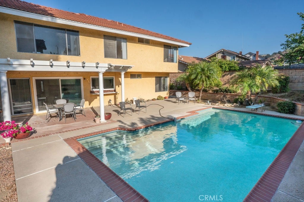 Discover this stunning 5-bedroom, 3-bathroom pool home, ideally located in the highly sought-after community of Hacienda Heights. Renovated, the homeowner transformed the dining room into a spacious 6th bedroom, featuring wide-plank laminate flooring. The room also includes a non-permitted ensuite bathroom, complete with a ceramic tile shower surround, ceramic tile flooring, and a custom vanity with a granite countertop. Upon entering the house, you'll be welcomed by soaring vaulted ceilings. To the left, the expansive living room boasts wide-plank laminate flooring and elegant wood shutters adorning the windows. The generous family room, featuring a cozy fireplace, seamlessly flows into the chef-inspired kitchen, which showcases two-tone white/light blue cabinetry, stainless steel appliances, ceramic tile flooring, and Corian countertops. All four bathrooms have been updated, featuring ceramic flooring, tile-surround showers, granite countertops, and custom cabinetry. The main floor offers a thoughtfully designed layout with two bedrooms and two bathrooms, providing optimal convenience and flexibility. A wrought iron staircase leads to the second floor, where the primary suite awaits, complete with dual closets and an en-suite bathroom featuring a shower, double custom vanities, and elegant finishes. Two additional bedrooms, another bathroom, and a versatile bonus room—ideal as a fifth bedroom—complete the upper level. The backyard is an entertainer's paradise, with a spacious patio for outdoor dining and a large pool perfect for family gatherings. This home is located near Hsi Lai Temple, county parks, shopping centers, schools, medical facilities, supermarkets, restaurants, and banks, and is part of the esteemed Mesa Robles School and Glen A. Wilson High School districts.