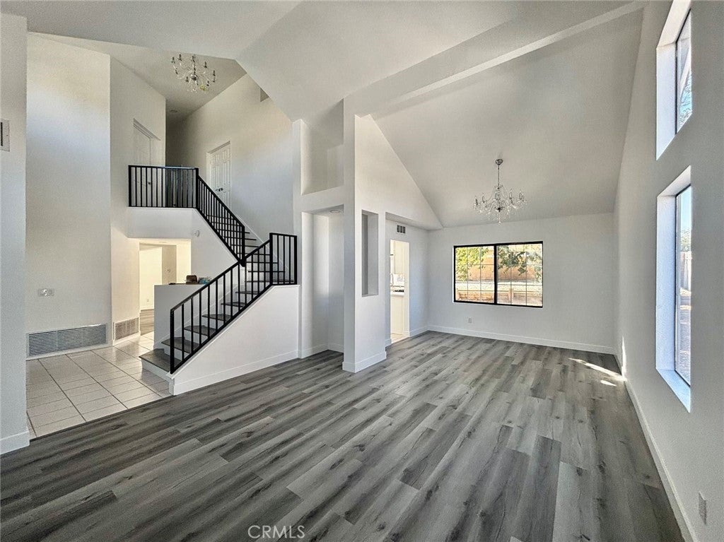 This is A must-see house with a spacious layout. Upon entering, you will be welcomed by high ceilings that give the home an open and airy feel. The layout includes a formal dining area, a large living room, and an open kitchen with a cozy fireplace. The downstairs features a versatile den that can be used as a home office, as well as a bedroom with an adjacent bathroom. This makes it perfect for guests or in-law visits. The primary suite is upstairs and includes dual sinks, a soaking tub, and a walk-in closet. While public records show a total of three bedrooms, this property has been modified. The owner has added three additional bedrooms, making it ideal for a large family. An attached 2-car garage provides plenty of storage and convenient access. The home is in an established Victorville neighborhood with easy access to amenities and major roads