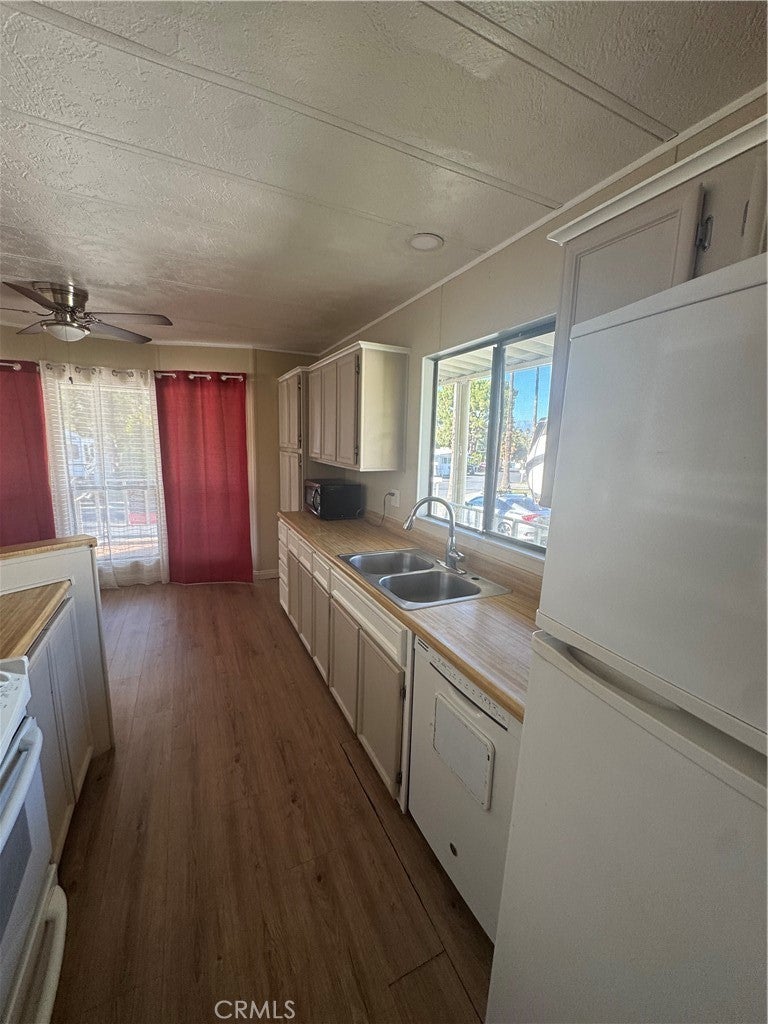 Spacious floor plan with two bedrooms and large full bath. Kitchen features extra counter and cabinet space and a spacious dining room. Living room features large windows creating an abundance of natural lighting. Newer vinyl wood flooring throughout the entire home. Separate laundry area in the home for convenience. Community features are the following: pool, spa recreation room, billiard room, laundry and showers.