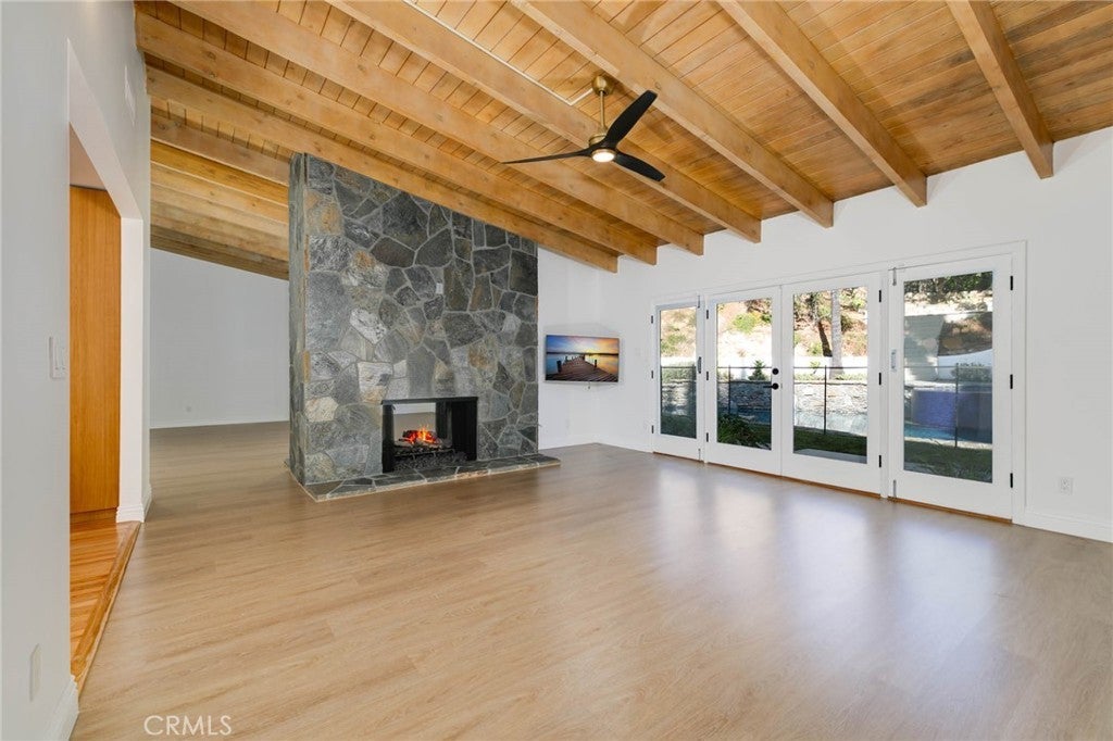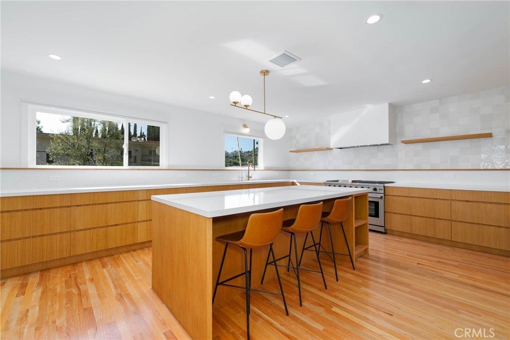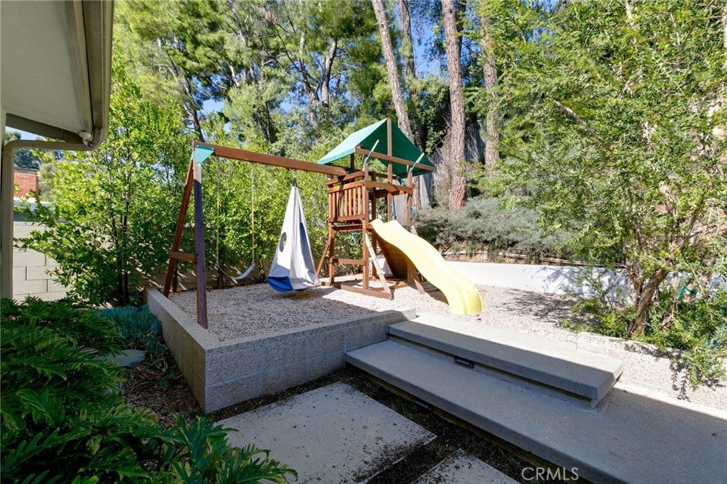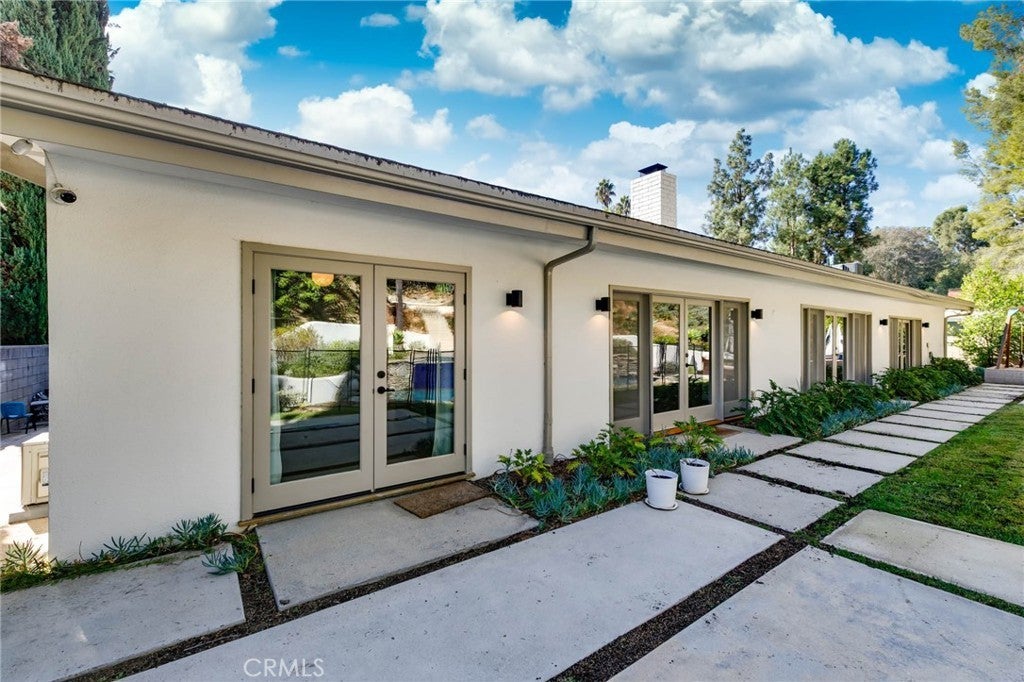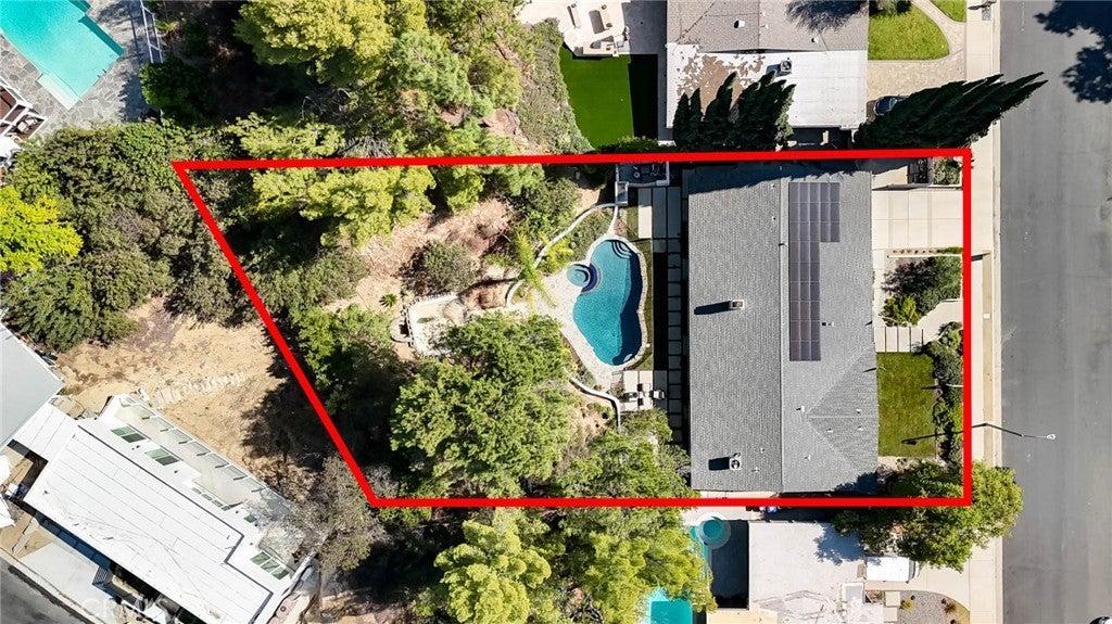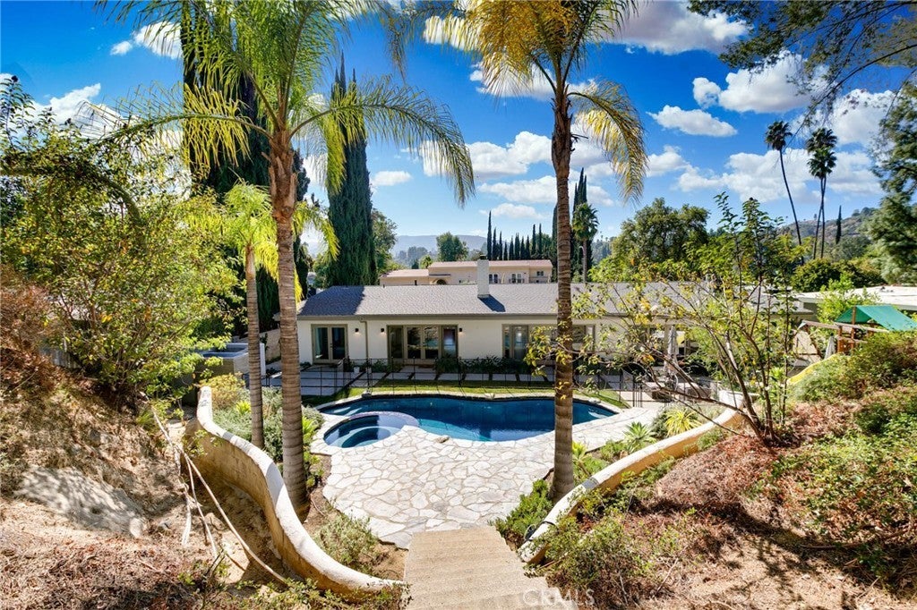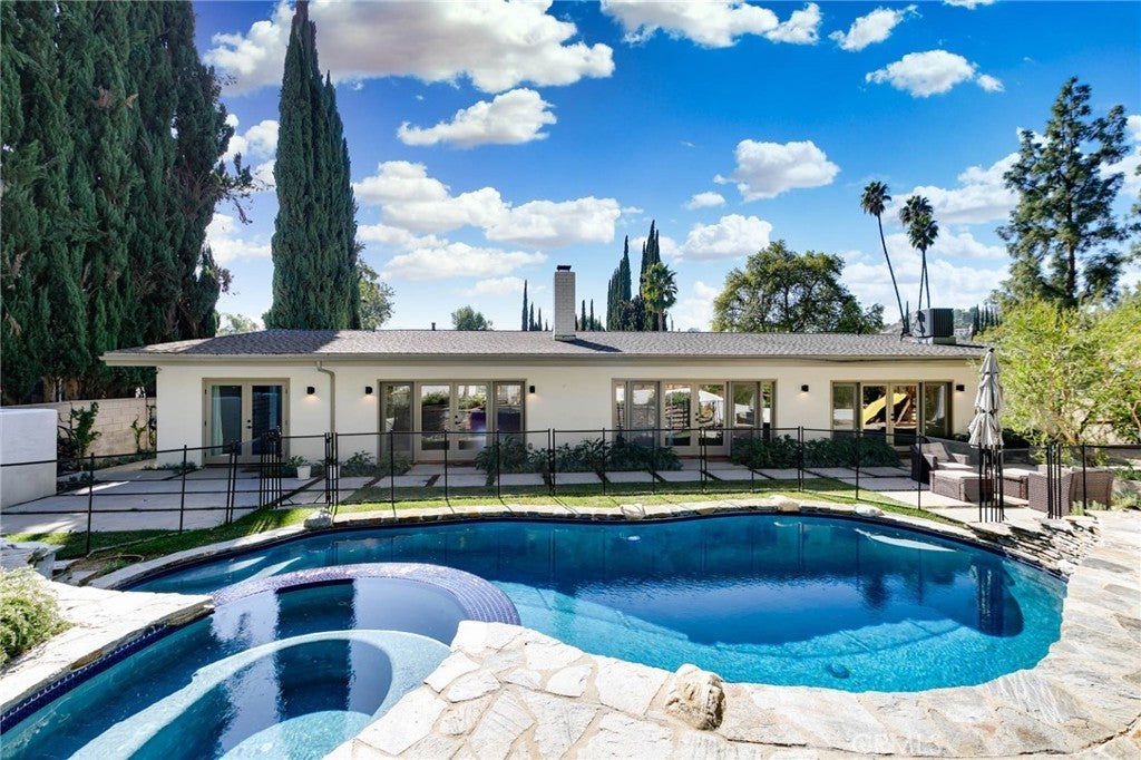 Newly remodeled mid-century modern stunner designed by a renowned architect, nestled on tree-lined street south of the boulevard. Set on nearly 15,000 sq ft of meticulously landscaped grounds, this 4-bedroom, 3.5-bathroom home spans 2,864 sq ft of light-filled living space. Clean modern lines and lush, drought-tolerant gardens frame the exterior, creating a peaceful, private retreat. A custom wood front door opens into a bright, expansive living area with new floors, exposed wood-beam ceilings, and striking double-sided fieldstone fireplace. Walls of glass line the back of the home, opening to a resort-style backyard complete with heated pool, hot tub, outdoor fireplace, view terrace, and playset—ideal for year-round entertaining and family enjoyment. At the heart of the home is the remodeled gourmet kitchen featuring an eat-in island, breakfast bar, custom white oak cabinetry, and stainless steel appliances—perfect for both casual meals and entertaining. The luxurious primary suite is a true sanctuary, boasting spa-like bath with dual vanities and spacious walk-in closet. Additional highlights include owned solar panels, and eco-conscious landscaping for effortless, sustainable living. Don’t miss your chance to call this architectural gem home!