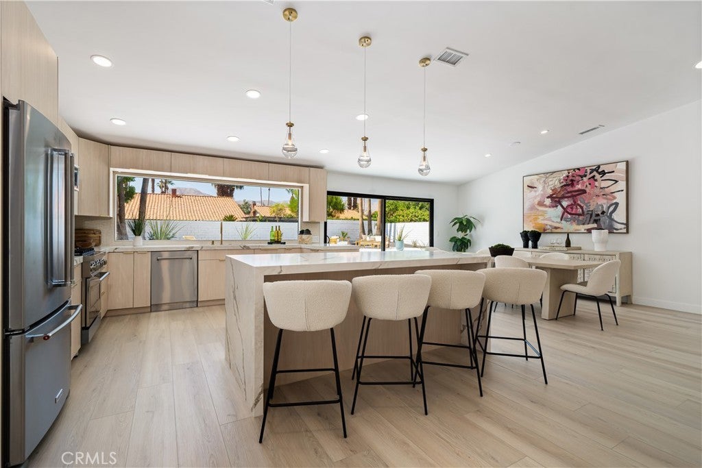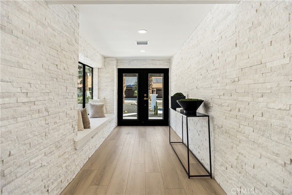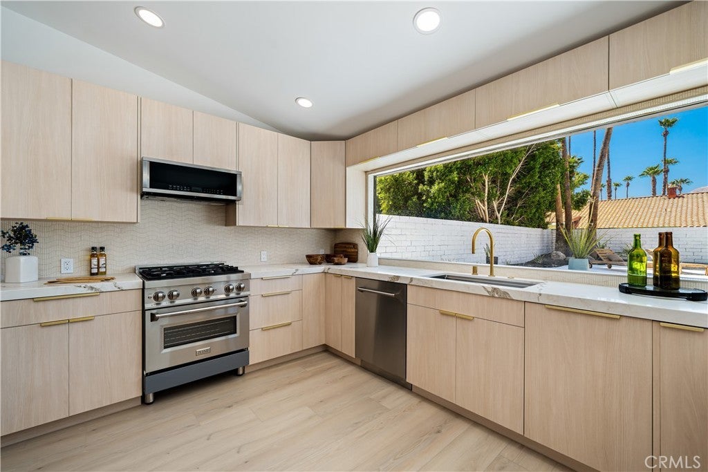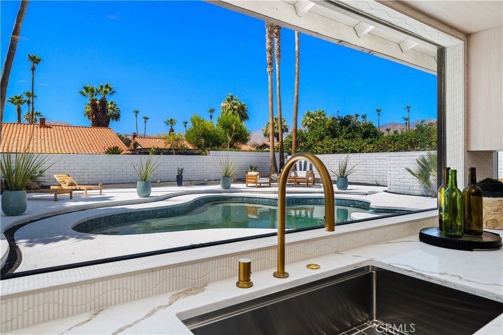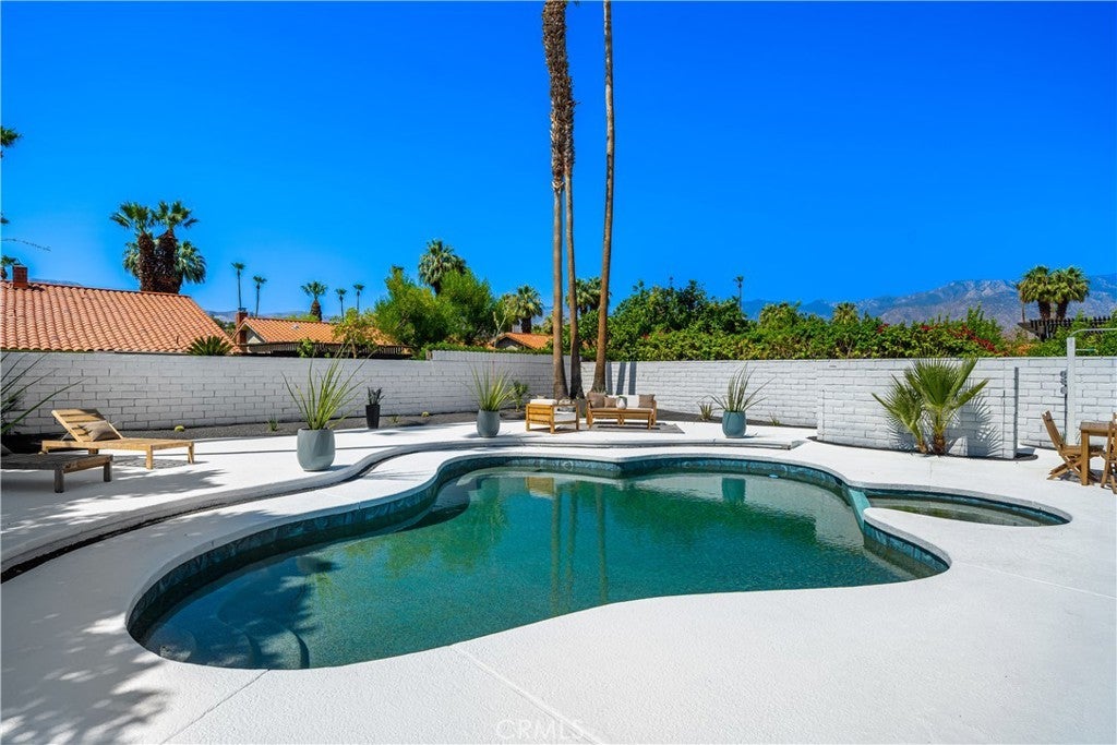 Full home inspection and pest / termite clearance completed and ready for review! Experience desert living redefined—an exceptional renovation where elevated design meets architectural artistry. Every inch of this home reflects premium construction, bespoke finishes, and modern desert sophistication seldom seen at this price point. A fully custom residence in a quiet, no-HOA neighborhood, it offers the perfect blend of privacy and convenience—just moments from the heart of Rancho Mirage and Palm Springs. A 30-foot marble walkway welcomes you, setting the tone for the home’s craftsmanship. Step down into an open-concept living area with vaulted ceilings, smooth-finish drywall, and wide-plank white oak LVP flooring. Perfectly positioned on a large South-facing lot (with plenty of room for an ADU), the space is filled with natural light by day and enhanced by dimmable LED lighting at night. The chef’s kitchen is a true centerpiece, showcasing a professional-grade ZLINE dual-fuel range, waterfall-edge island with wine fridge, and a 10-foot architectural window overlooking the backyard. Custom white oak cabinetry with 9-ply birch boxes, luxury quartz by Tile Designs by Fina, European brass fixtures, and a limestone backsplash complete this designer-curated space by local designer Nicholas Lawson. The primary suite features a spa-inspired bath wrapped in designer tile, a walk-in shower with dual solid-brass towers, and a picture window overlooking the private yard. Copper penny tile flooring with copper glass grout adds a refined touch. Both bathrooms include smart toilets with bidets, walk-in showers, and double sink vanities with solid brass fixtures. Expansive 10-foot sliders open to a private backyard oasis with PebbleTec pool, tiered entertaining zones, and a cool-tech coated pool deck framed by stunning San Jacinto Mountain views. A new 18.5 SEER2 high-efficiency heat pump with a 10-year warranty ensures lasting comfort. Close to Cotino – Disney’s Storyliving community, world-class golf, dining, and shopping, this home delivers luxury desert living without compromise.