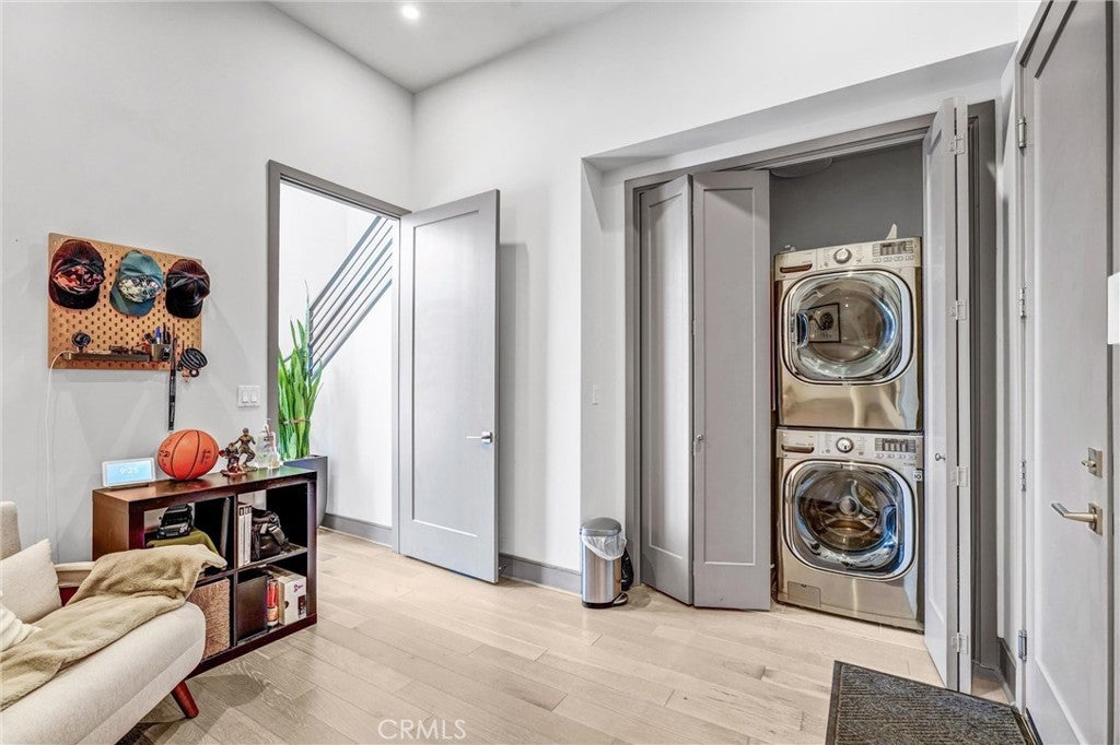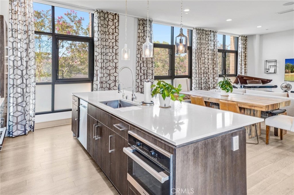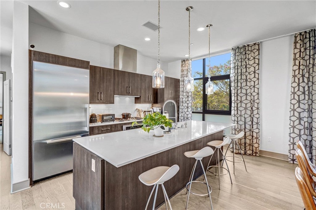 This corner-unit sits in a sought-after mixed-use community in the heart of South Pasadena. It has everything on your list: High-end finishes, private outdoor space, an attached garage and bonus space. On the street level, you’ll find an entryway with soaring ceilings that’s filled with natural light. This level also offers a laundry area and a versatile den that could be a mudroom, craft area, office or home gym. The attached garage has vaulted ceilings and plenty of built-in storage. The main level has an open layout lined by a wall of windows, which highlights the high ceilings & hardwood floors. The beautiful chef’s kitchen overlooks the dining/living areas and features sleek European cabinetry, stainless steel appliances, quartz countertops and a large island with seating for a crowd. Just off the living room, you’ll spend lots of time entertaining & relaxing on the massive balcony, complete with a retractable canopy. Back inside, the isolated primary retreat boasts a spa-like ensuite with a walk-in closet, a modern double vanity, a free-standing soaker tub, a W/C and a frameless glass shower. The guest bedroom also has a custom closet and a beautiful private ensuite bathroom. Unit 100 sits in a unique corner position within the Eight Twenty Mission community, as it’s not connected to another residential condo. You’ll be just steps from numerous shopping & dining options along Mission Street, as well as the weekly farmers market, public library, Metro Goldline station and more. Popular Orange Grove Park is located across the street, and this condo is zoned to top-ranked SPUSD. Make an appointment now to see this special South Pasadena residence!