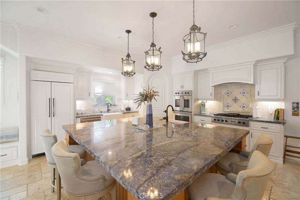 Experience coastal living luxury in this stunning Spanish masterpiece built in 2019. Conveniently located blocks from Swami's and downtown Encinitas, this house features an open floor plan that includes a chef's kitchen with oversized island, two kitchen sinks, Viking Professional series cooktop with griddle, French door double oven, Sub Zero refrigerator as well as 2 Sub Zero refrigerator drawers and wine refrigerator. Spacious living room with gas fireplace and folding La Cantina door that leads to the outdoor living room creating a true indoor/outdoor experience. Outdoor room includes gas/stone fireplace and leads to an outdoor area with AOG grill and Salamangrill pizza oven. The upper back yard includes custom putting green within a beautiful garden. Custom cabinets and molding throughout the home. Ocean view patio with seating/fire pit area and ocean view deck off of the primary bedroom. Each of the four bedrooms includes ensuite bathrooms in addition to the half bath downstairs. Primary bedroom includes gas fireplace, two separate sink areas, and large closet. Spacious office/yoga room downstairs with French doors leading to front yard and large fountain. Solid Mahogony entryway double doors, travertine floors and 9 foot+ ceilings throughout.