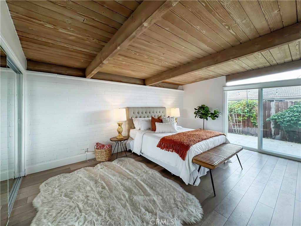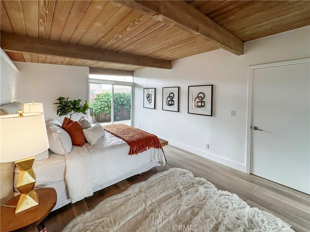Located just a quarter mile from the beach, this charming mid-century modern bungalow is nestled in the highly sought-after Vista Del Gado community. With only 54 residences designed by acclaimed architect Chris Abel, the neighborhood seamlessly blends timeless architecture with a quintessential beach lifestyle. Residents can easily access San Clemente or Dana Point via the paved path along PCH, offering convenient access to beaches, dining, coffee shops, and nightlife. This turnkey 912 sqft bungalow has been remodeled with many upgrades. Enter through the gate to a spacious front patio perfect for lounging and easy entertaining, with views of the neighborhood and distant mountains. Indoor/outdoor living is easy through the sliding doors into the thoughtfully designed home which boasts beamed ceilings with dark accents, true to mid-century modernist architecture and creating a “floating” effect in the structure. A light and bright kitchen opens to the main living area with abundant storage space in custom cabinetry, a large peninsula with bar seating, quartz counters, and stainless appliances. The generously-sized primary bedroom, warmed by an accent brick wall, leads to a private back patio with concrete decking and California Closet organizer. The secondary bedroom also shares back deck access through a sliding door and California Closet organizer. The full remodeled bathroom features dual vanities, and tasteful updates throughout. Other property offerings include central air conditioning (uncommon in this neighborhood), cool roof, luxury vinyl flooring throughout, dual-paned windows and doors, upgraded electrical panel, and a detached 1-car garage closeby. Opportunities to own in this community are more than rare, making this offering a unique chance to own a mid-century timepiece in a community just steps away from all the treasures that San Clemente has to offer
