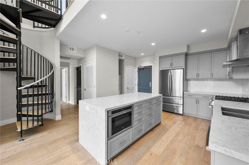 Experience elevated coastal living in this modern Redondo Beach community, where luxury meets convenience. This condo at One South is thoughtfully designed to maximize space and natural light. The living room features soaring 18-foot ceilings and expansive west-facing windows. The gourmet kitchen includes custom fixtures, Bosch appliances, and generous countertops with bar seating—perfect for cooking or entertaining. The primary suite offers an en-suite bathroom and a spacious walk-in closet, creating a private retreat. A versatile upstairs loft adds flexibility and can serve as a third bedroom, office, gym, or study. One of this home’s standout features is the approximately 600 sq ft rooftop deck, showcasing stunning ocean sunset views to the west. It’s an ideal setting for relaxation or hosting gatherings with the Pacific Ocean as your backdrop. Additional conveniences include two assigned parking spaces and a private, secure storage room. The location places residents close to award-winning schools, including nearby Tulita Elementary.