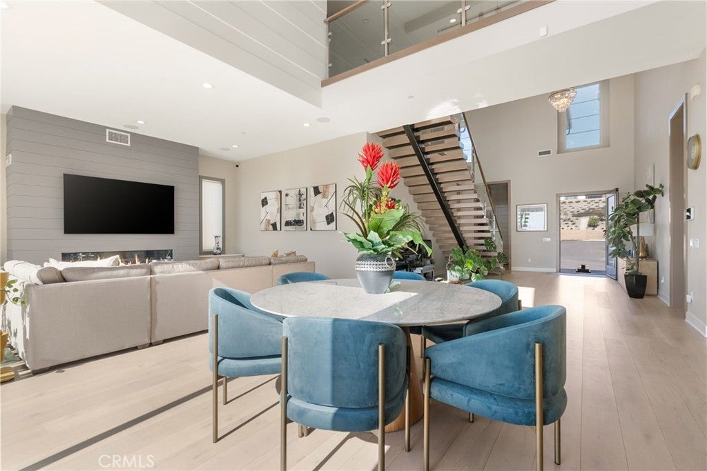 Luxury Living in Guard-Gated Westcliffe. Welcome to this move-in-ready luxury residence located in the prestigious guard-gated Westcliffe community. Offering approximately 5,000 sq. ft. of sophisticated living space, this 5-bedroom, 5.5-bath home is filled with top-tier upgrades and thoughtful design elements throughout.A striking floating staircase sets the tone upon entry, complemented by expansive 20' x 9' sliding doors on the first floor that create seamless indoor-outdoor flow. The oversized primary suite provides a true retreat, enhanced by its generous layout and elevated finishes. An enclosed California room expands the living footprint even further, featuring a custom-designed bar area tailored specifically for the space—perfect for entertaining and year-round enjoyment.Every detail has been meticulously upgraded: premium flooring, a designer kitchen, and spa-quality bathrooms. The home is fully prewired with built-in speakers and connected to a Sonos system for whole-home audio. Custom Shade Store blinds and curtains, including automated window treatments, pair beautifully with custom chandeliers and refined moldings throughout. Organization is elevated with fully customized cabinetry by California Closets and Inspired Closets, extending to the upstairs media room. Located on a wide, quiet street, the property showcases gorgeous panoramic city and canyon views, offering a stunning backdrop for both everyday living and entertaining. A rare opportunity to own a highly upgraded, turnkey home in one of the area’s most sought-after gated communities.