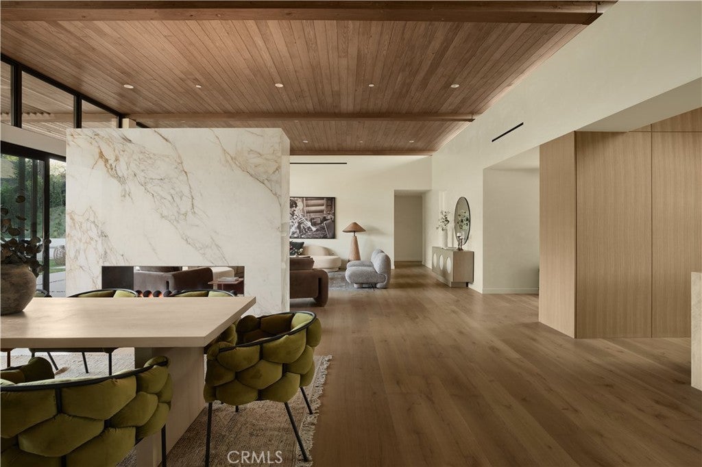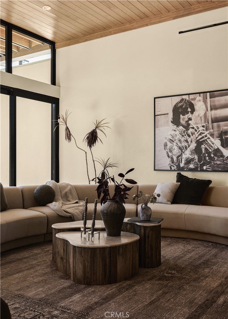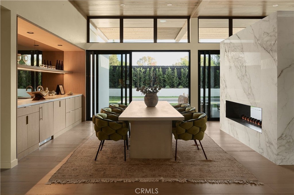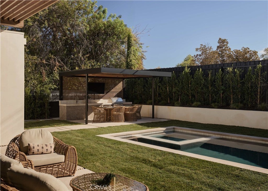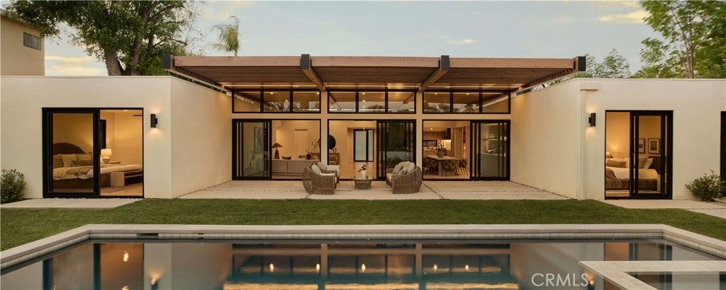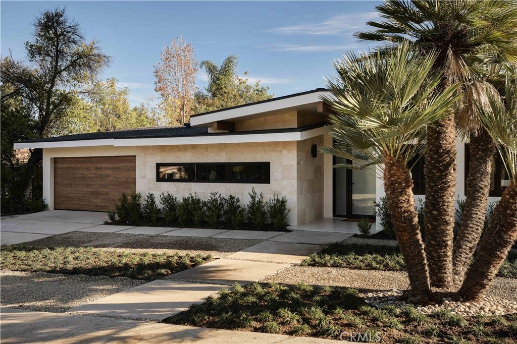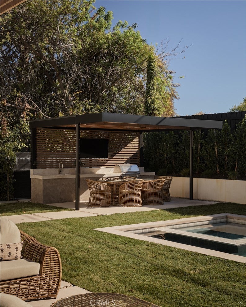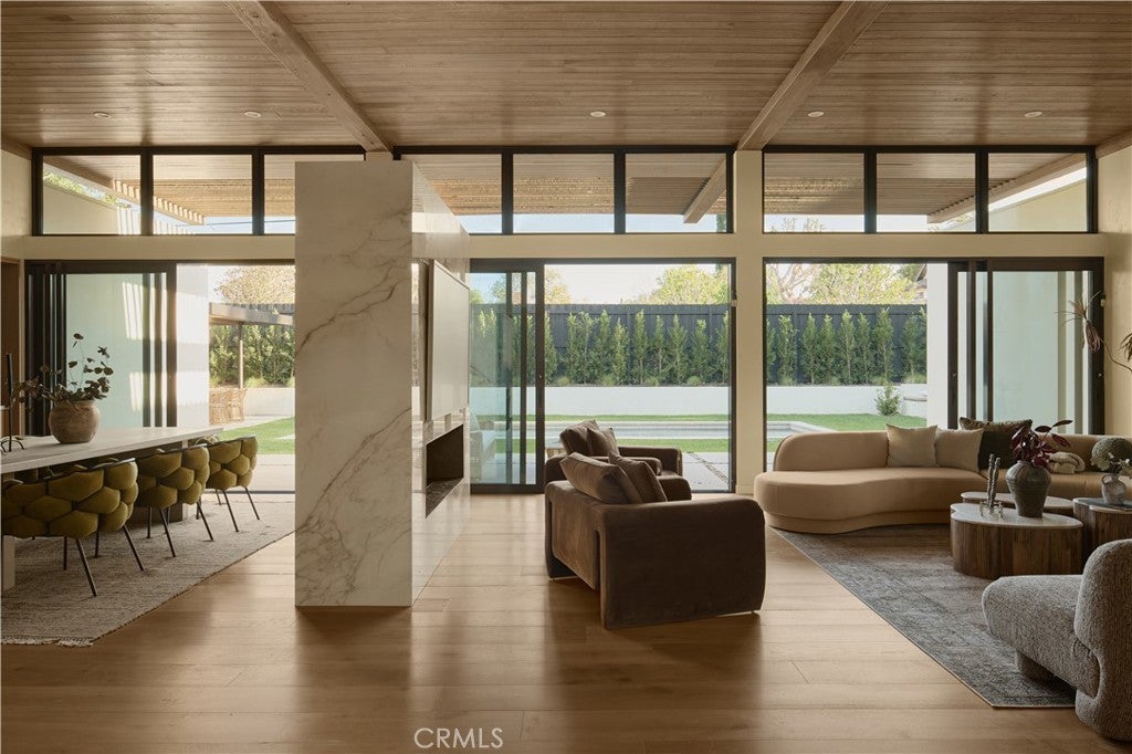 An iconic Charles Du Bois mid-century home, thoughtfully and completely reimagined by Wyota Workshop, blending timeless architectural integrity with modern volume, warmth, and livability. This 4-bedroom, 3.5-bath residence honors the original spirit of Du Bois’ design while elevating it for contemporary living. The home’s layout has been reworked to introduce a dramatic 36-foot-long living room with 12-foot ceilings, creating an expansive sense of scale and light rarely found in homes of this era. A cantilevered ceiling extends seamlessly toward the outdoor patio, reinforcing true indoor-outdoor living and allowing the interior spaces to flow effortlessly into the landscape. Throughout the home, custom oak cabinetry has been meticulously designed and built in every space, offering warmth, cohesion, and exceptional storage without compromising clean architectural lines. The dining room is anchored by a refined wet bar with wine refrigeration, making it ideal for entertaining. The kitchen is both sculptural and functional, featuring Thermador appliances, natural Taj Mahal quartz countertops, and a striking waterfall island that serves as the heart of the home. The residence offers dual primary suites, thoughtfully positioned on opposite sides of the home to provide privacy and flexibility perfect for guests, in-laws, or work-from-home needs. Outside, the property continues to impress with a modern linear pool and spa, a covered outdoor BBQ area, and multiple zones designed for relaxation and entertaining. A poured-in-place concrete firepit with custom bench seating anchors the yard, while a fully integrated indoor-outdoor sound system sets the tone for gatherings both intimate and lively. Every system in the home has been updated this is a fully rebuilt residence, offering the confidence of new construction with the soul of a mid-century classic. A rare opportunity to own a true architectural masterpiece rooted in history, redefined for modern life, and perfectly suited for the Woodland Hills lifestyle.