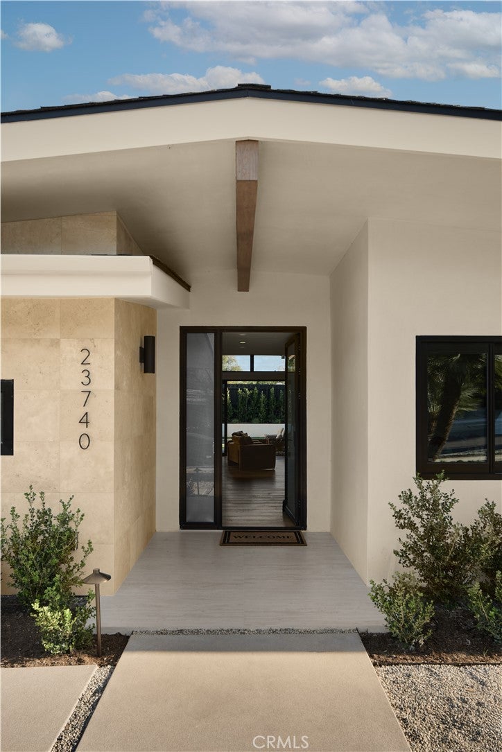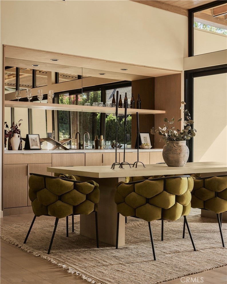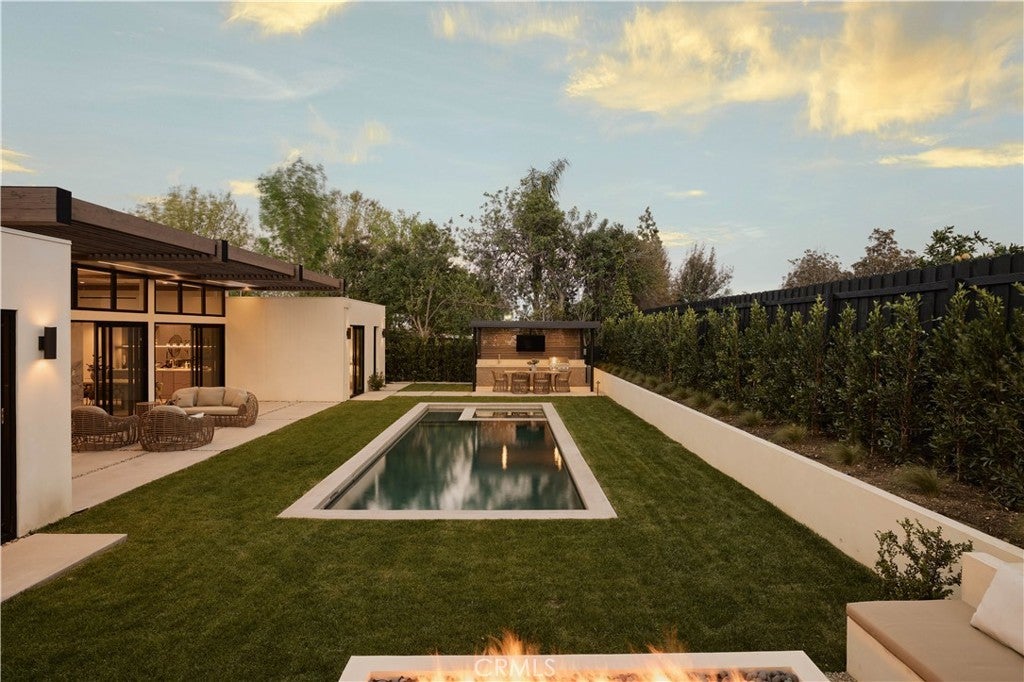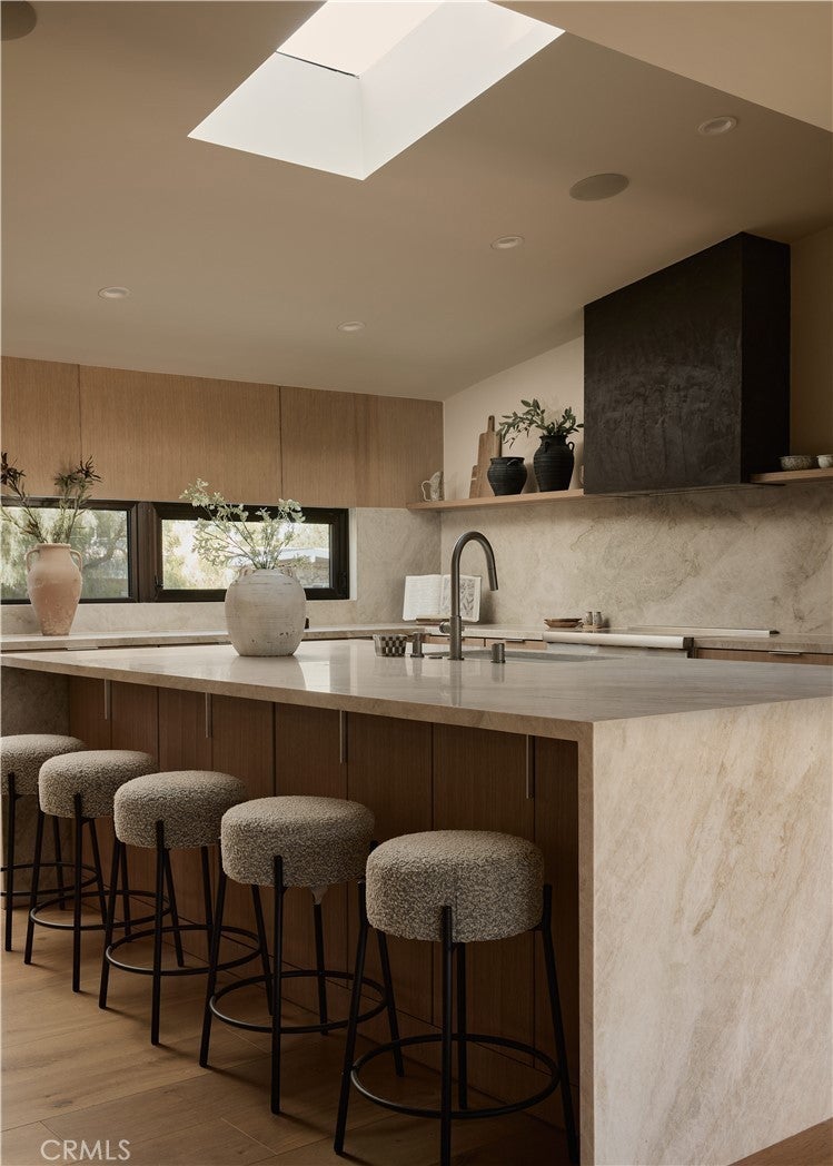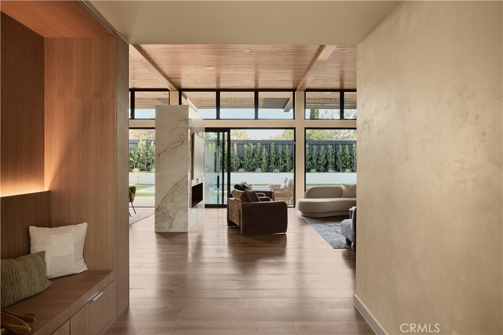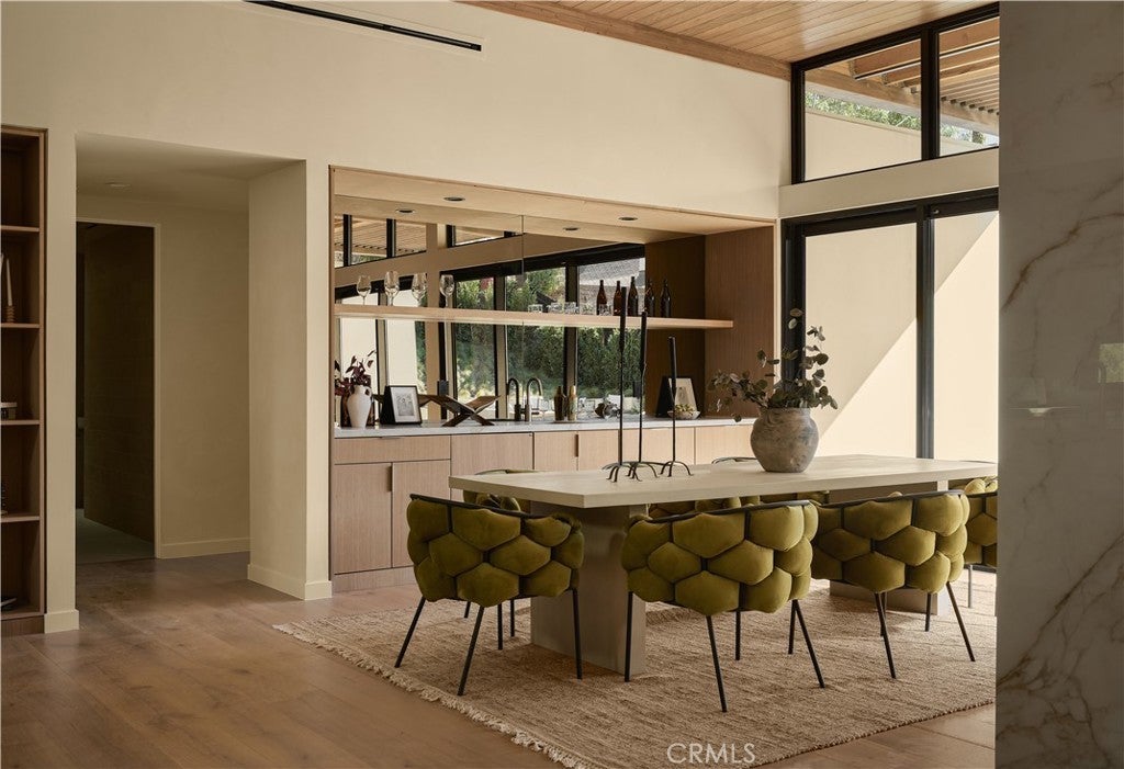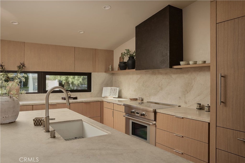 An iconic Charles Du Bois mid-century home, thoughtfully and completely reimagined by Wyota Workshop, blending timeless architectural integrity with modern volume, warmth, and livability. This 4-bedroom, 3.5-bath residence honors the original spirit of Du Bois’ design while elevating it for contemporary living. The home’s layout has been reworked to introduce a dramatic 36-foot-long living room with 12-foot ceilings, creating an expansive sense of scale and light rarely found in homes of this era. A cantilevered ceiling extends seamlessly toward the outdoor patio, reinforcing true indoor-outdoor living and allowing the interior spaces to flow effortlessly into the landscape. Throughout the home, custom oak cabinetry has been meticulously designed and built in every space, offering warmth, cohesion, and exceptional storage without compromising clean architectural lines. The dining room is anchored by a refined wet bar with wine refrigeration, making it ideal for entertaining. The kitchen is both sculptural and functional, featuring Thermador appliances, natural Taj Mahal quartz countertops, and a striking waterfall island that serves as the heart of the home. The residence offers dual primary suites, thoughtfully positioned on opposite sides of the home to provide privacy and flexibility perfect for guests, in-laws, or work-from-home needs. Outside, the property continues to impress with a modern linear pool and spa, a covered outdoor BBQ area, and multiple zones designed for relaxation and entertaining. A poured-in-place concrete firepit with custom bench seating anchors the yard, while a fully integrated indoor-outdoor sound system sets the tone for gatherings both intimate and lively. Every system in the home has been updated this is a fully rebuilt residence, offering the confidence of new construction with the soul of a mid-century classic. A rare opportunity to own a true architectural masterpiece rooted in history, redefined for modern life, and perfectly suited for the Woodland Hills lifestyle.