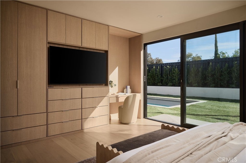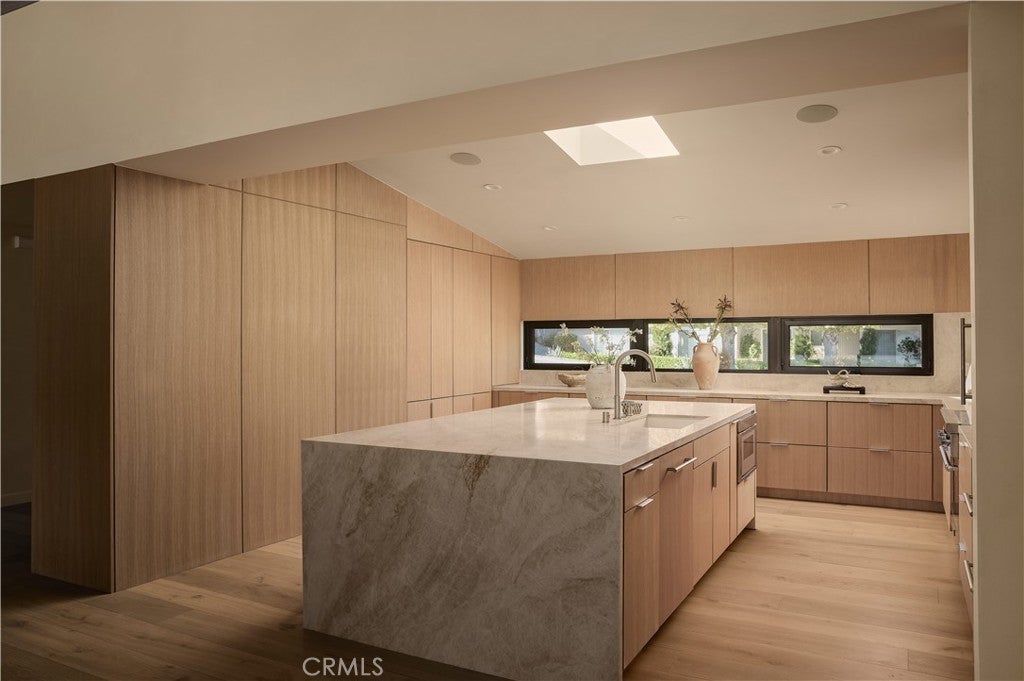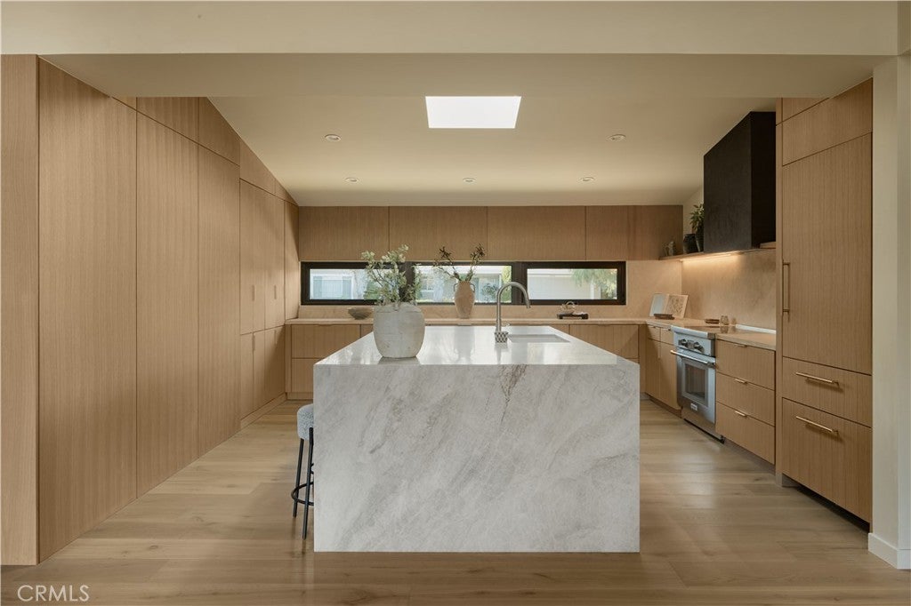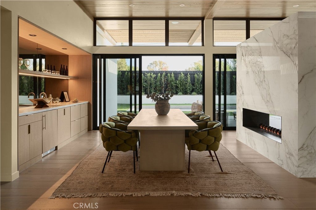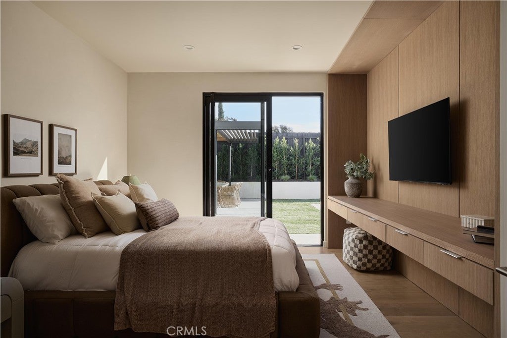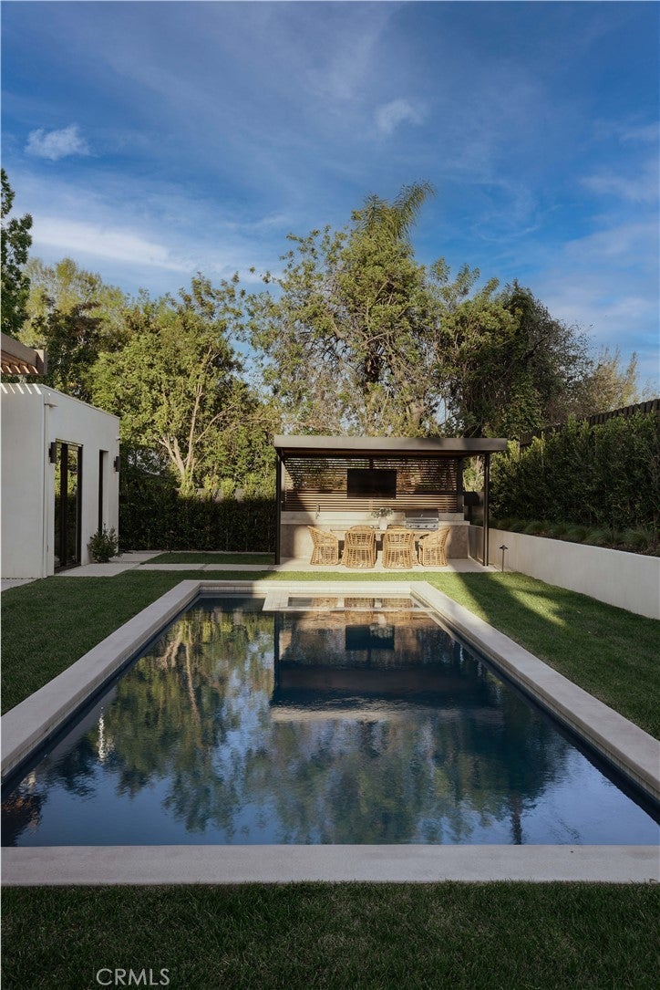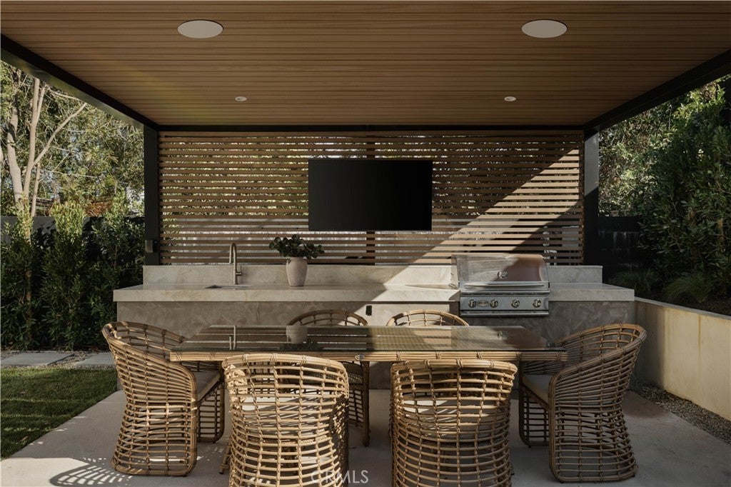 An iconic Charles Du Bois mid-century home, thoughtfully and completely reimagined by Wyota Workshop, blending timeless architectural integrity with modern volume, warmth, and livability. This 4-bedroom, 3.5-bath residence honors the original spirit of Du Bois’ design while elevating it for contemporary living. The home’s layout has been reworked to introduce a dramatic 36-foot-long living room with 12-foot ceilings, creating an expansive sense of scale and light rarely found in homes of this era. A cantilevered ceiling extends seamlessly toward the outdoor patio, reinforcing true indoor-outdoor living and allowing the interior spaces to flow effortlessly into the landscape. Throughout the home, custom oak cabinetry has been meticulously designed and built in every space, offering warmth, cohesion, and exceptional storage without compromising clean architectural lines. The dining room is anchored by a refined wet bar with wine refrigeration, making it ideal for entertaining. The kitchen is both sculptural and functional, featuring Thermador appliances, natural Taj Mahal quartz countertops, and a striking waterfall island that serves as the heart of the home. The residence offers dual primary suites, thoughtfully positioned on opposite sides of the home to provide privacy and flexibility perfect for guests, in-laws, or work-from-home needs. Outside, the property continues to impress with a modern linear pool and spa, a covered outdoor BBQ area, and multiple zones designed for relaxation and entertaining. A poured-in-place concrete firepit with custom bench seating anchors the yard, while a fully integrated indoor-outdoor sound system sets the tone for gatherings both intimate and lively. Every system in the home has been updated this is a fully rebuilt residence, offering the confidence of new construction with the soul of a mid-century classic. A rare opportunity to own a true architectural masterpiece rooted in history, redefined for modern life, and perfectly suited for the Woodland Hills lifestyle.