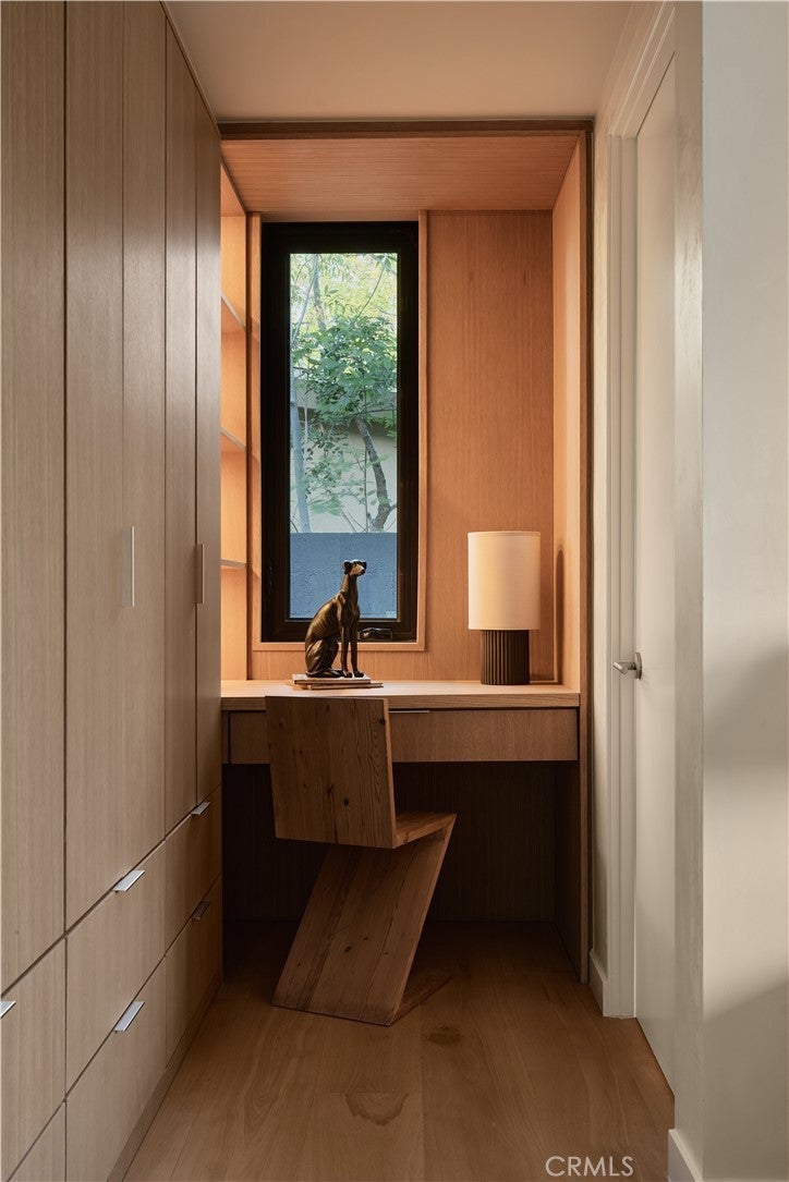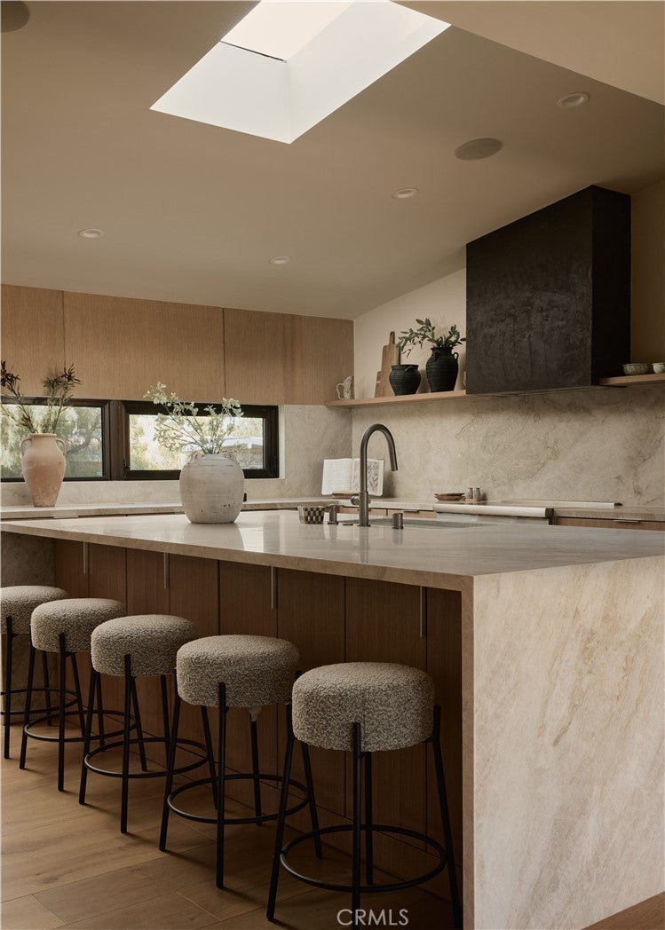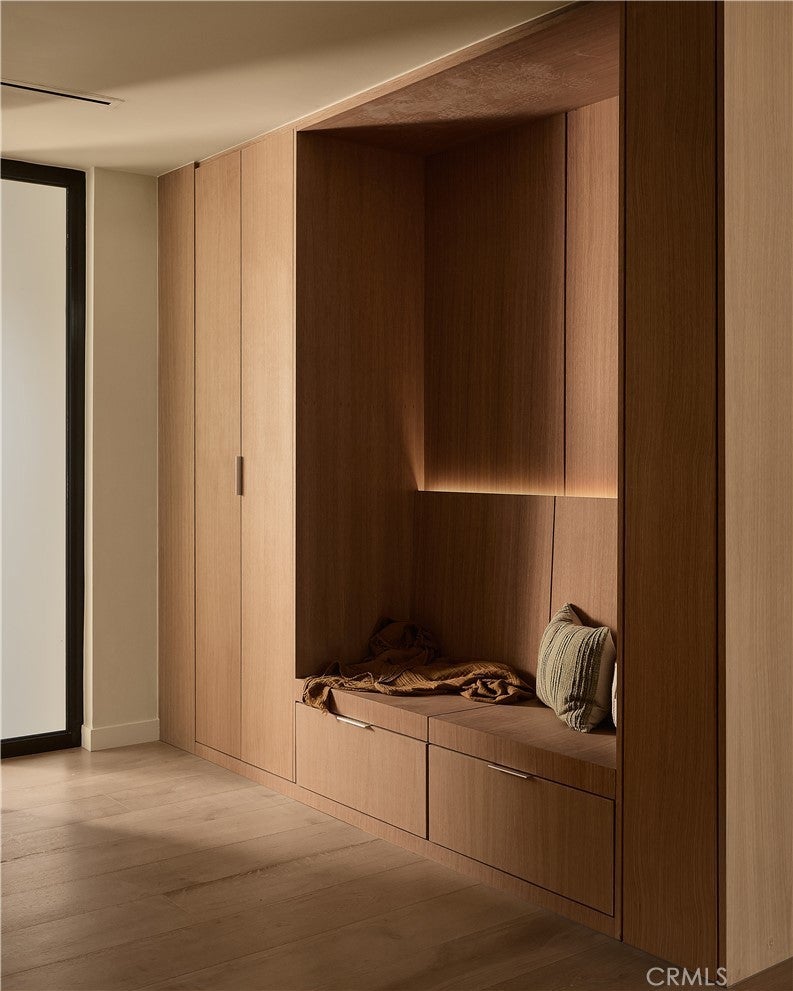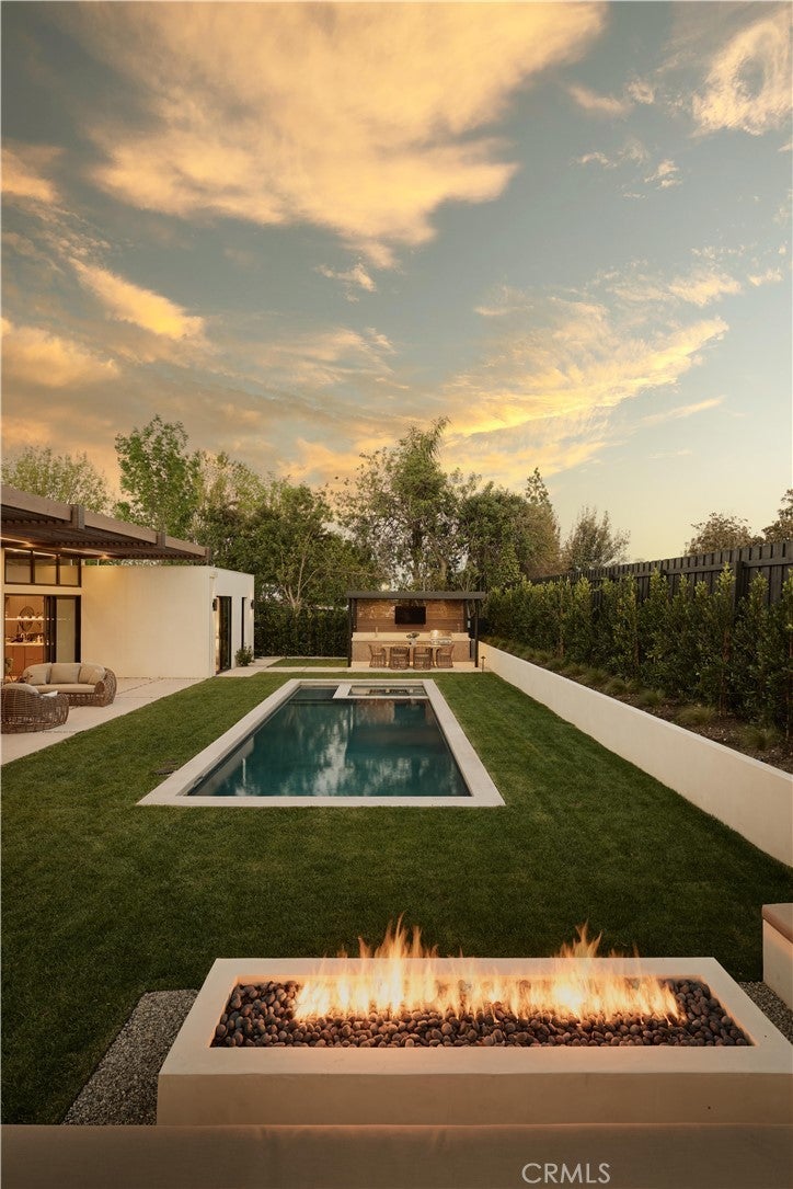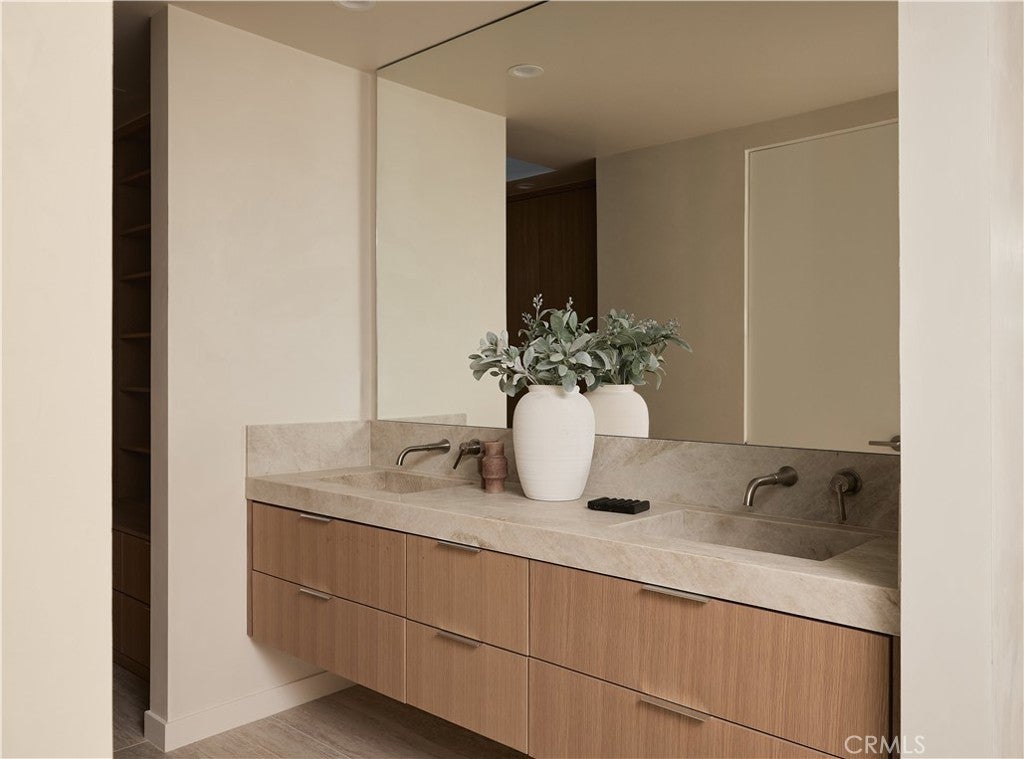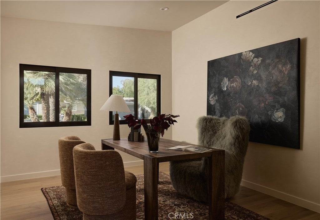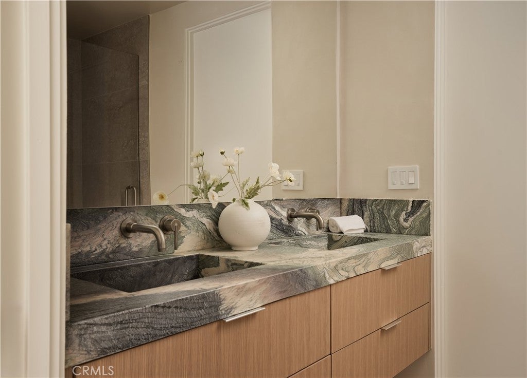 An iconic Charles Du Bois mid-century home, thoughtfully and completely reimagined by Wyota Workshop, blending timeless architectural integrity with modern volume, warmth, and livability. This 4-bedroom, 3.5-bath residence honors the original spirit of Du Bois’ design while elevating it for contemporary living. The home’s layout has been reworked to introduce a dramatic 36-foot-long living room with 12-foot ceilings, creating an expansive sense of scale and light rarely found in homes of this era. A cantilevered ceiling extends seamlessly toward the outdoor patio, reinforcing true indoor-outdoor living and allowing the interior spaces to flow effortlessly into the landscape. Throughout the home, custom oak cabinetry has been meticulously designed and built in every space, offering warmth, cohesion, and exceptional storage without compromising clean architectural lines. The dining room is anchored by a refined wet bar with wine refrigeration, making it ideal for entertaining. The kitchen is both sculptural and functional, featuring Thermador appliances, natural Taj Mahal quartz countertops, and a striking waterfall island that serves as the heart of the home. The residence offers dual primary suites, thoughtfully positioned on opposite sides of the home to provide privacy and flexibility perfect for guests, in-laws, or work-from-home needs. Outside, the property continues to impress with a modern linear pool and spa, a covered outdoor BBQ area, and multiple zones designed for relaxation and entertaining. A poured-in-place concrete firepit with custom bench seating anchors the yard, while a fully integrated indoor-outdoor sound system sets the tone for gatherings both intimate and lively. Every system in the home has been updated this is a fully rebuilt residence, offering the confidence of new construction with the soul of a mid-century classic. A rare opportunity to own a true architectural masterpiece rooted in history, redefined for modern life, and perfectly suited for the Woodland Hills lifestyle.