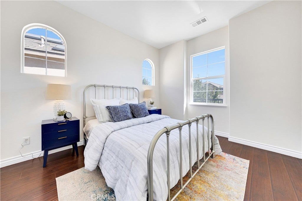 Welcome to this beautiful two-story detached condo just like a single family home featuring 4 bedrooms and 2.5 bathrooms. Bright and airy with abundant natural sunlight, this residence offers laminate wood flooring throughout both levels. The inviting floor plan opens to a spacious living and dining area, seamlessly connected to the updated kitchen with soft-close custom cabinetry, quartz countertops, and stainless steel appliances. A generous family room with a cozy fireplace creates the perfect space for gatherings, while the convenient downstairs powder room is ideal for guests. Upstairs, the luxurious primary suite boasts a large walk-in closet and a fully upgraded bathroom complete with custom cabinetry, quartz counters, and a stunning standalone soaking tub. All secondary bedrooms are spacious, light-filled, and comfortable. Enjoy a great-sized backyard, perfect for entertaining, relaxing, or creating your own outdoor retreat. This home combines modern upgrades, thoughtful design, and ample living space—ready for you to move in and enjoy!