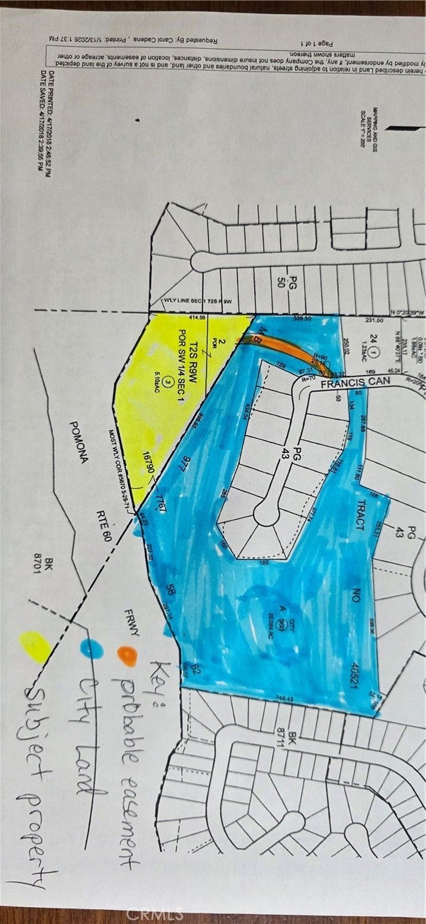 This is a Fantastic opportunity to purchase a 5+ acre parcel at the Southwest corner of Pomona city limits in Phillips Ranch, adjacent to Diamond Bar and the street Looking Glass. Appx. 1/3 of the lot will be natural hillside and cul de sac street usage per tentative plans (not approved) for 4 custom home parcels with views. Another possibility is one large custom home on the lot and a guest home (or no guest home), this is totally up to the purchaser. The current owner envisioned a 10,000 sf home with a guest home. From the west side of the lot on the upper most elevation , there are stunning views of Mt. Baldy and the San Gabriel Mountains. At the high point of the hill the elevation is above the street Franciscan Pl. The ingress egress would be off of Franciscan Pl. in Phillips Ranch- In between 23 and 27 Franciscan Pl. at the top of the cul de sac where it doglegs. The property can briefly be seen while travelling along the 60 freeway on the north side as you travel west from the Phillips Ranch Road exit. The property can also be seen from the back yards of the homes at the end of Looking Glass in Diamond Bar. If developed with one large home, this would be a landmark property, envied by all that pass by. The location to build is for someone wishing to be noticed! Come take a look at this special property. Currently zoned as open space with the city of Pomona considering an easement and a conversion to residential zoning. Schools are shared with N. Diamond Bar and are award winning. Local shopping with Winco grocery, Walmart, Target, and many restaurants. Just a 5-to-10-minute drive to the Chino Hills Costco or Shoppes outdoor mall, or the Chino Spectrum. Easy freeway access to the 10, 57, 60, 71, and 210. Please be polite of the residents of 23 and 27 Franciscan Pl.