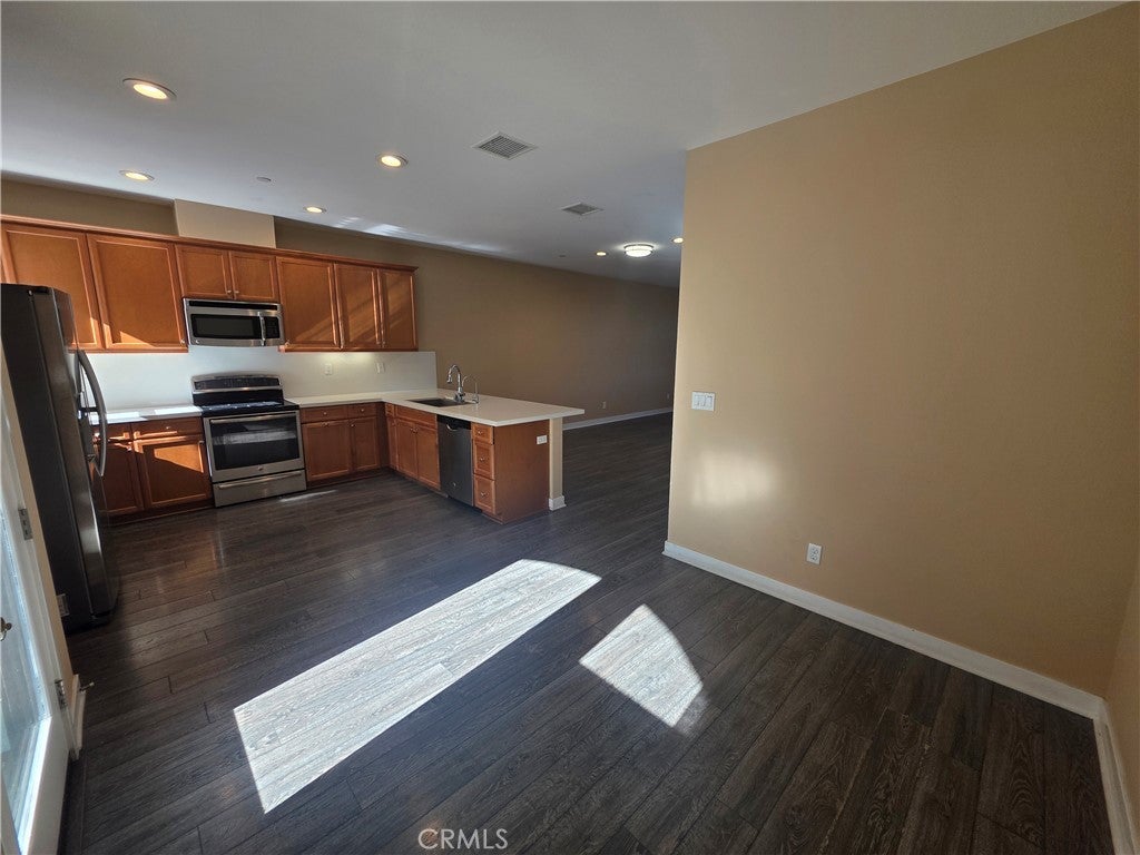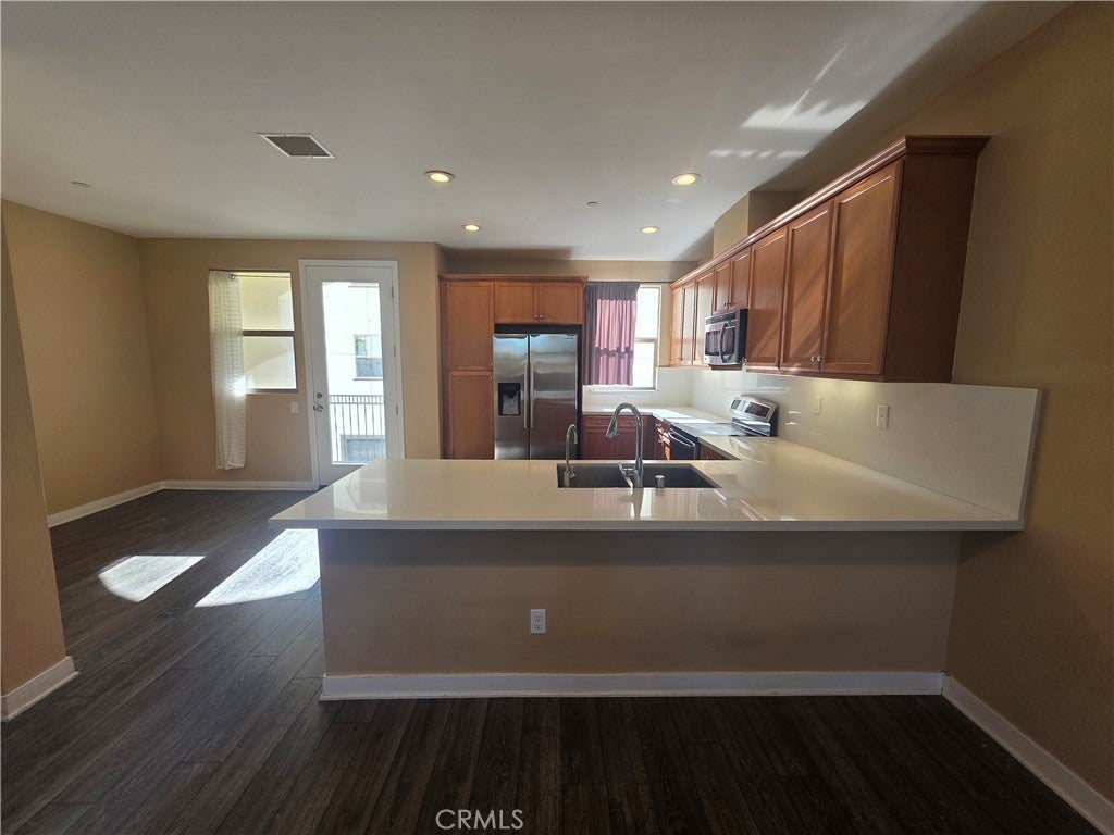 This 3-bedroom, 3.5-bathroom and 2 car attached garage Townhouse is now available. Wood flooring throughout and neutral plush carpet in the bedrooms. Open floor plan kitchen and living room. Kitchen has quartz counter tops, bar top area and includes; stove-top/oven, dishwasher, refrigerator and microwave appliances. Dining room has door that leads to a balcony. Laundry room includes washer and dryer. Primary suite has large closet and private bathroom with dual sinks. Primary bedroom has private bathroom as well. The other bedroom is very spacious and offers plenty of closet space. Community BBQ area available and perfect to spend your evenings outdoors. Located near the 91 freeway, schools, parks, restaurants, grocery stores and shopping centers.